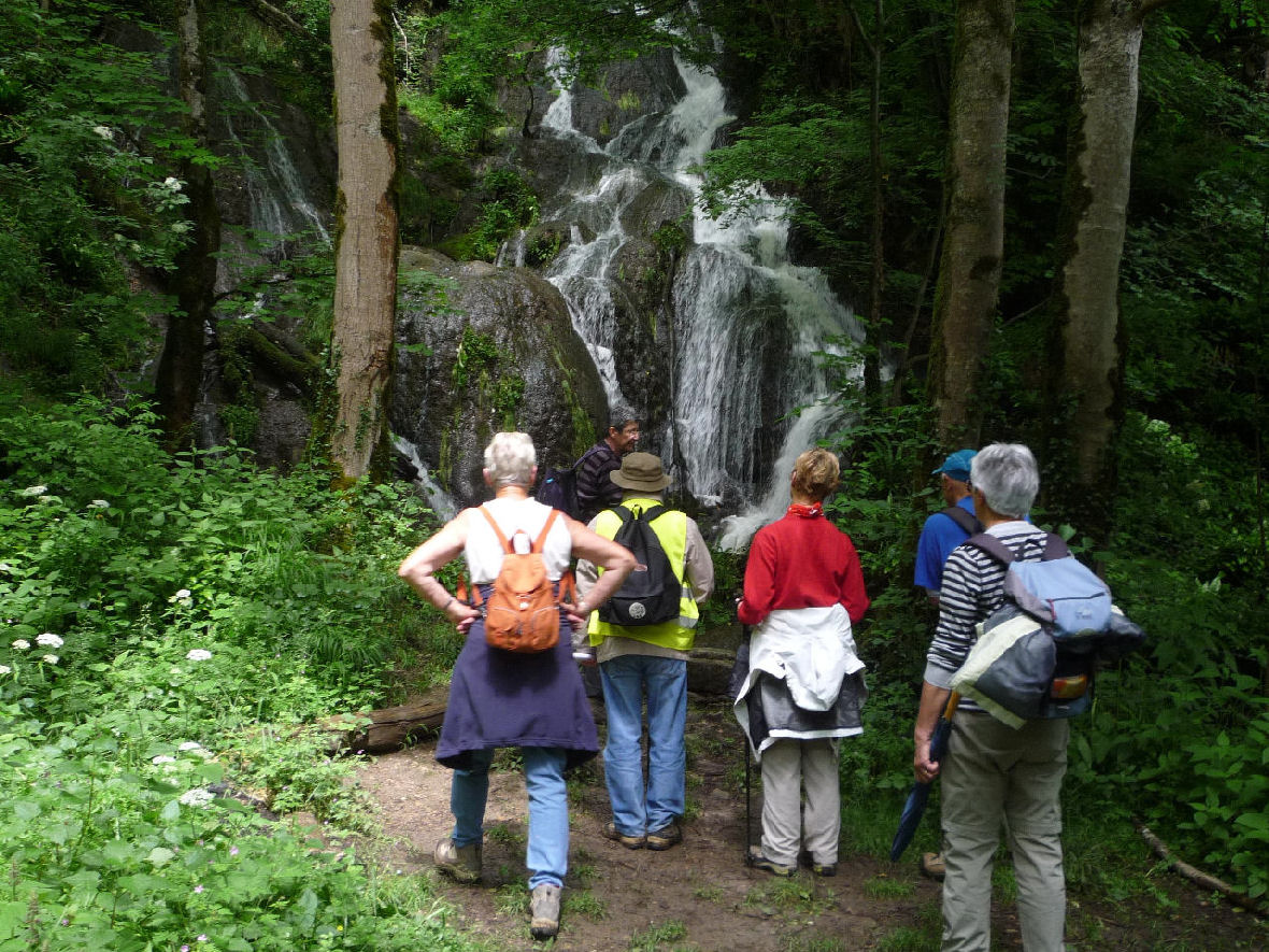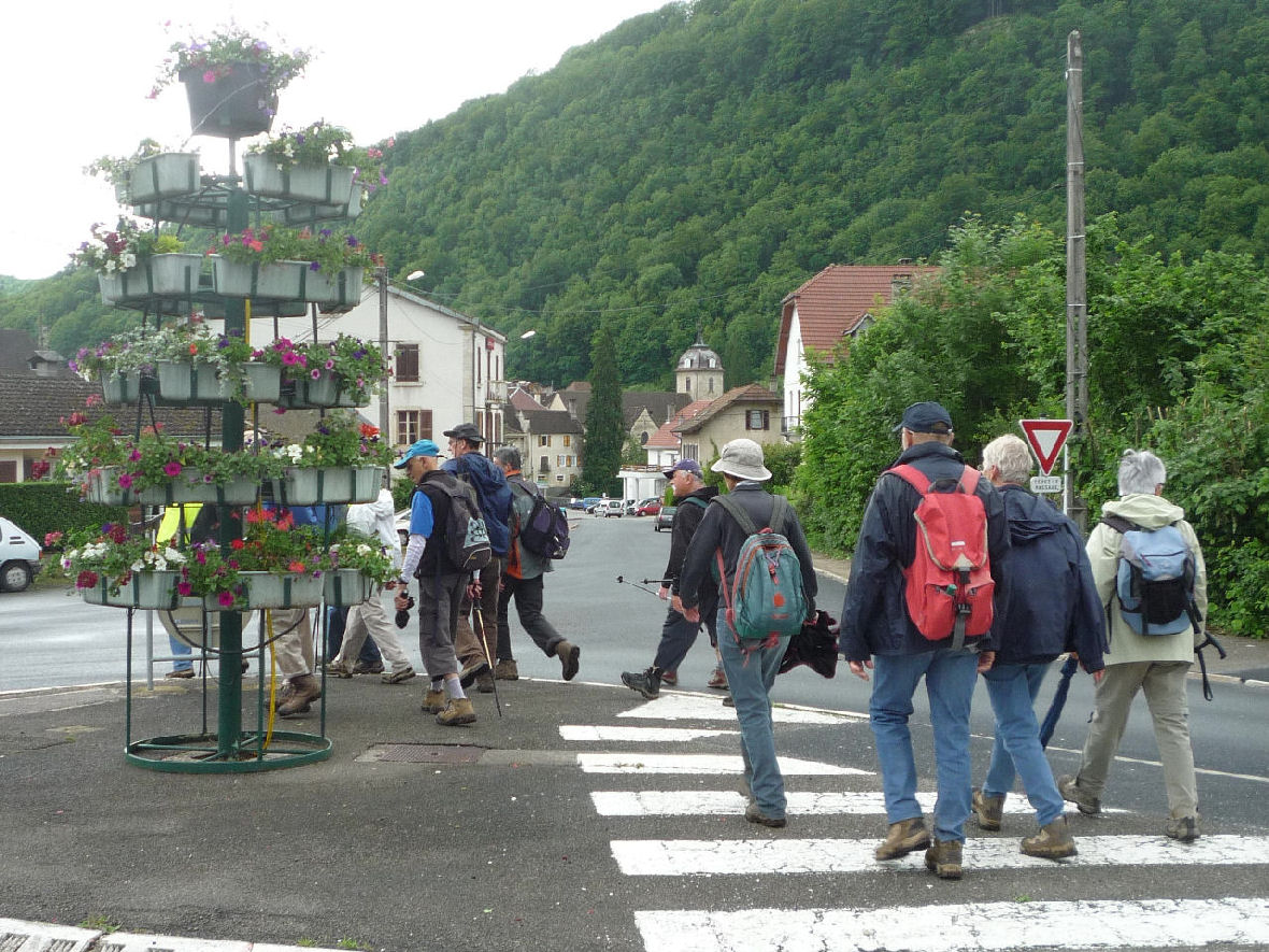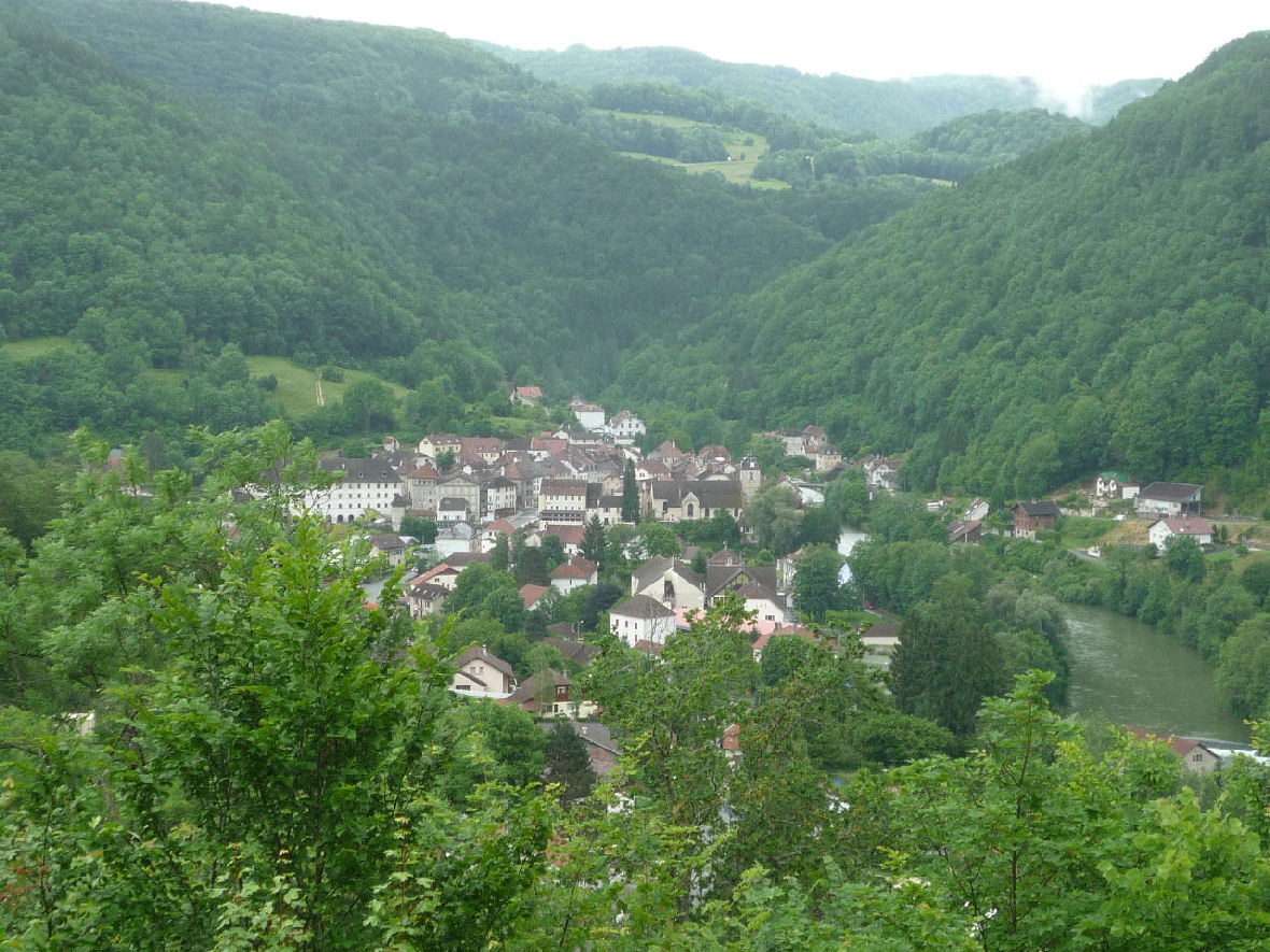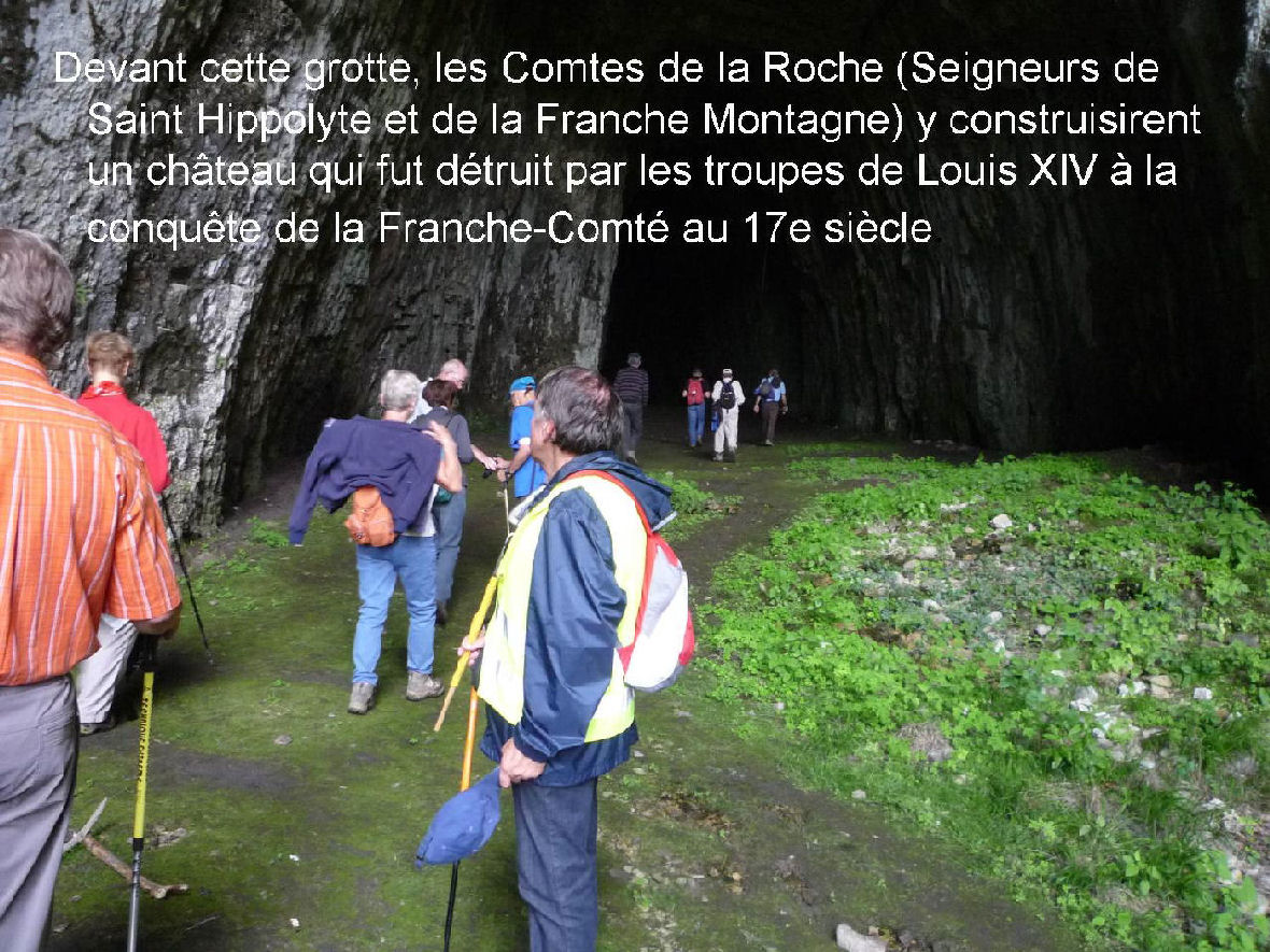 Nous traversons le « Bief de Bresset ». Par un chemin ardu, nous atteignons la Grotte de la Roche à l’ouverture impressionnante de 45 m de haut et 17 m de large, devant laquelle les Comtes de la Roche (Seigneurs de Saint Hippolyte et de la Franche Montagne) construisirent un château détruit XVIIe siècle par les troupes de Louis XIV, à la conquête de la Franche-Comté. Nous redescendons en direction de Saint Hippolyte par une corniche en profitant de splendides points de vues avant de nous arrêter quelques minutes à la magnifique « Chapelle du Mont » qui date de plus de 500 ans dont la Vierge protège la ville.