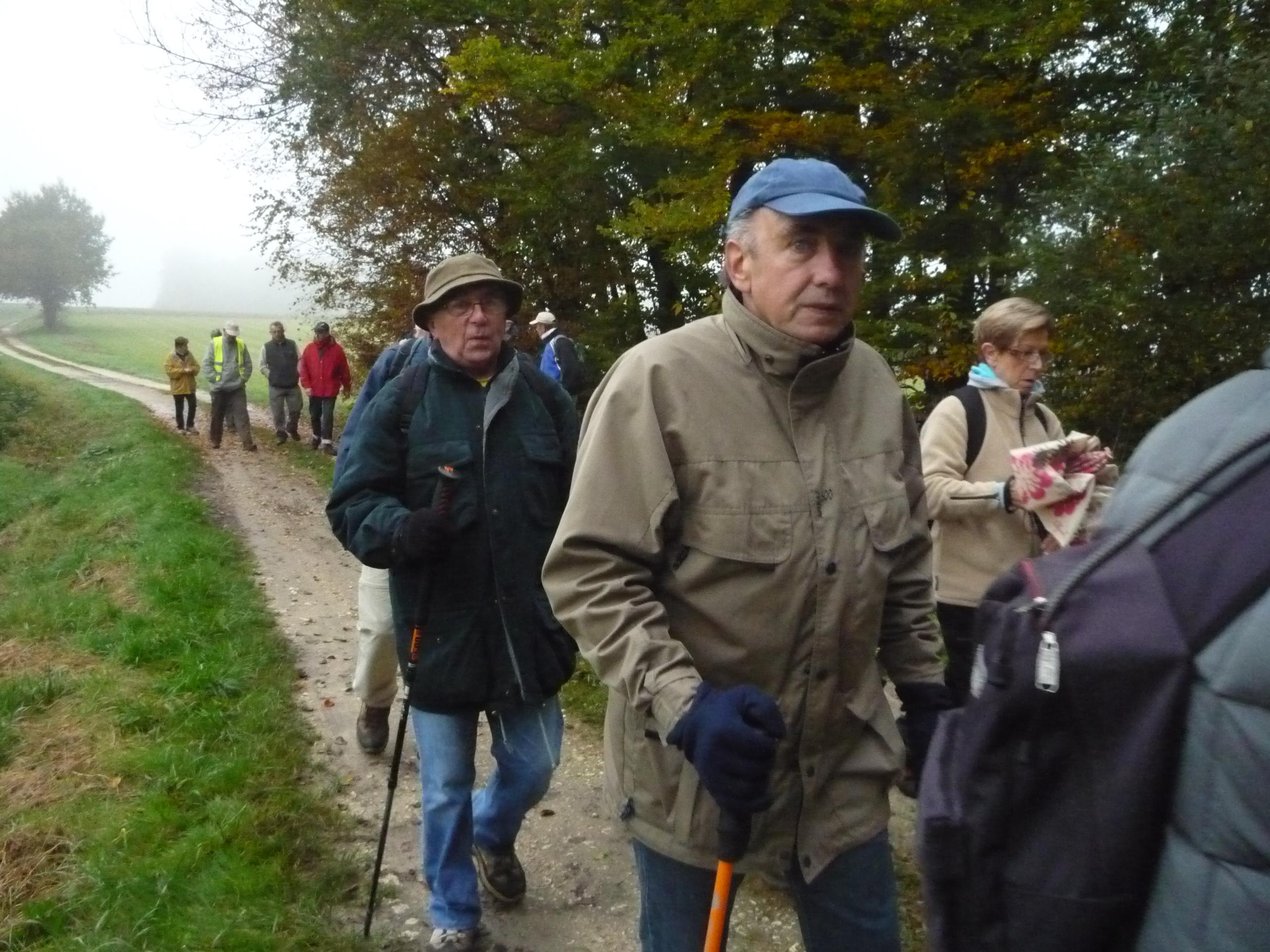 Le parking du cimetière de Chavannes Les Grands affiche complet. Notre groupe se forme et part sous la conduite de Robert et Nicole. Comme la poussière risque de gêner, le brouillard est bien accueilli. Une nouveauté : il est recommandé de bien observer le parcours car une question sera posée à l’arrivée au restaurant.