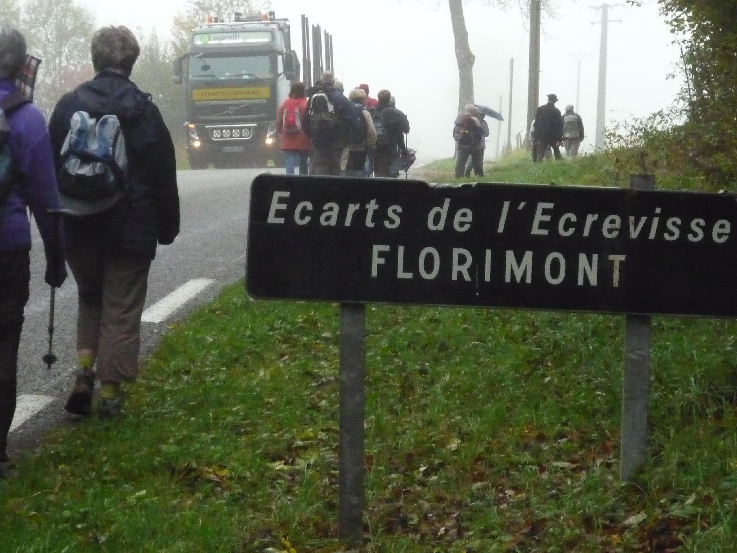 Pendant les premiers kilomètres, nous ne sommes pas gênés par la poussière mais les semailles des blés n’arrangent pas l’état du chemin. Arrive Suarce. Passé le ruisseau du Préra, nous pénétrons dans la forêt sur un chemin carrossable. Nous faisons une petite halte près de l’étang dont les reflets nous ont émerveillés lors de la reconnaissance, la semaine dernière, grâce au soleil. Jean Paul ayant immortalisé le spectacle, il a pu faire rager le groupe ! Nous rejoignons la route départementale avant de nous engager sur le chemin de la ferme nommée « La Petite Taille » où un spectacle nous attriste : étendue, une vache vient de mourir.