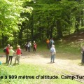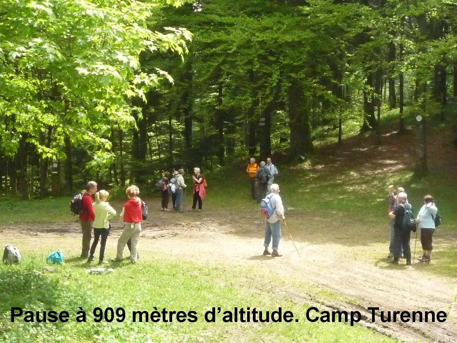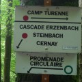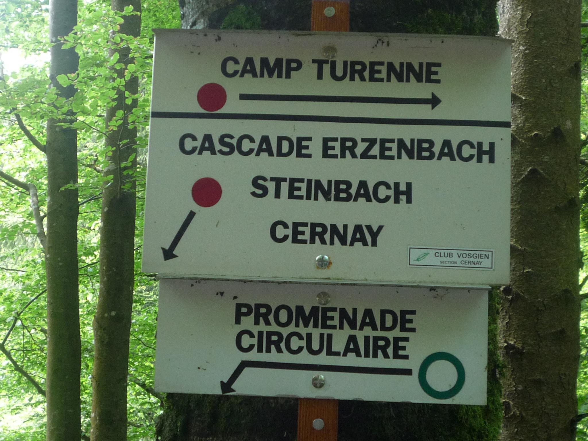Le sentier serpente et le bruit agréable du Erzenbach nous laisse penser que l’eau ne doit pas être encore très chaude. Le chemin se rétrécit mais les cailloux deviennent un peu plus gros. Le ruisseau se rapproche et bientôt apparaît une superbe cascade. Une passerelle et un escalier permettent d’apprécier le site. Après une petite grimpette, nous voici sur le chemin du Camp Turenne. La pente est régulière, tout va bien. Soudain une flèche à droite indique un sentier avec une pente qui va « casser les pattes ». Il reste 1 km avant d’arriver au Camp Turenne (909 m), haut lieu de la guerre 1914-1918, d’une grande importance pour l’avancée des troupes françaises vers le Hartmannswillerkopf. Cet endroit abritait un hôpital de campagne. Une stèle a été érigée à la mémoire des soldats morts dans ces lieux.