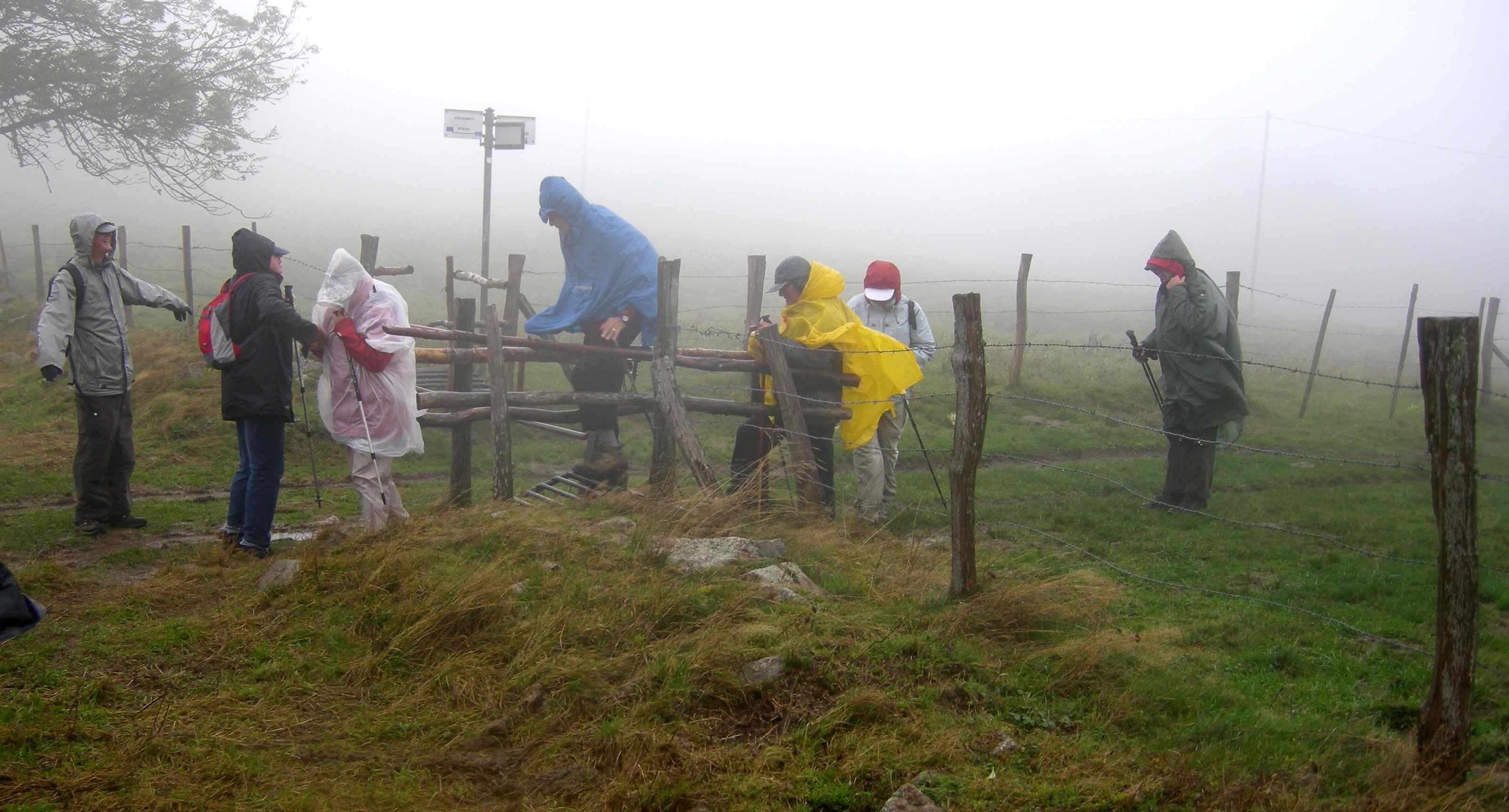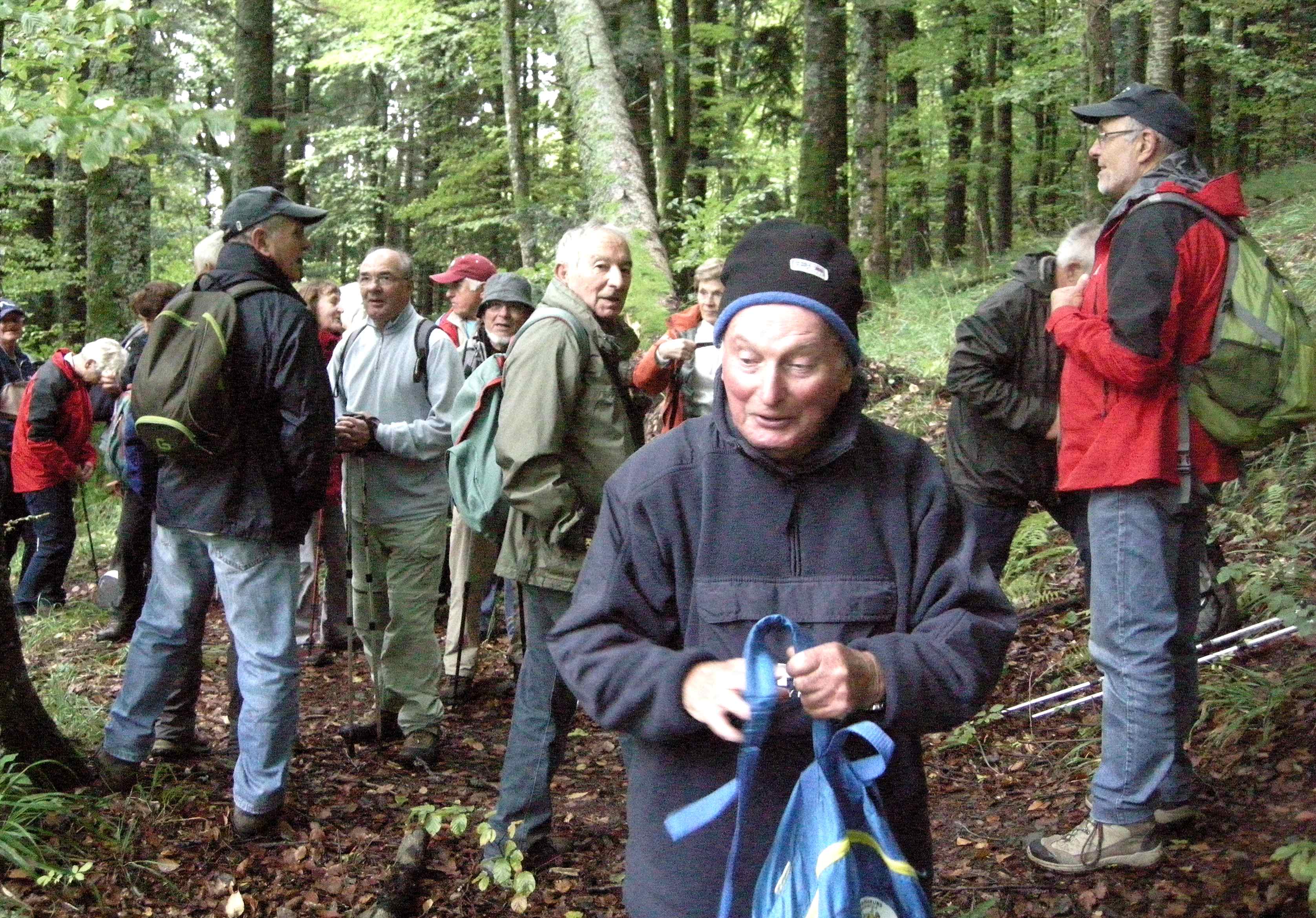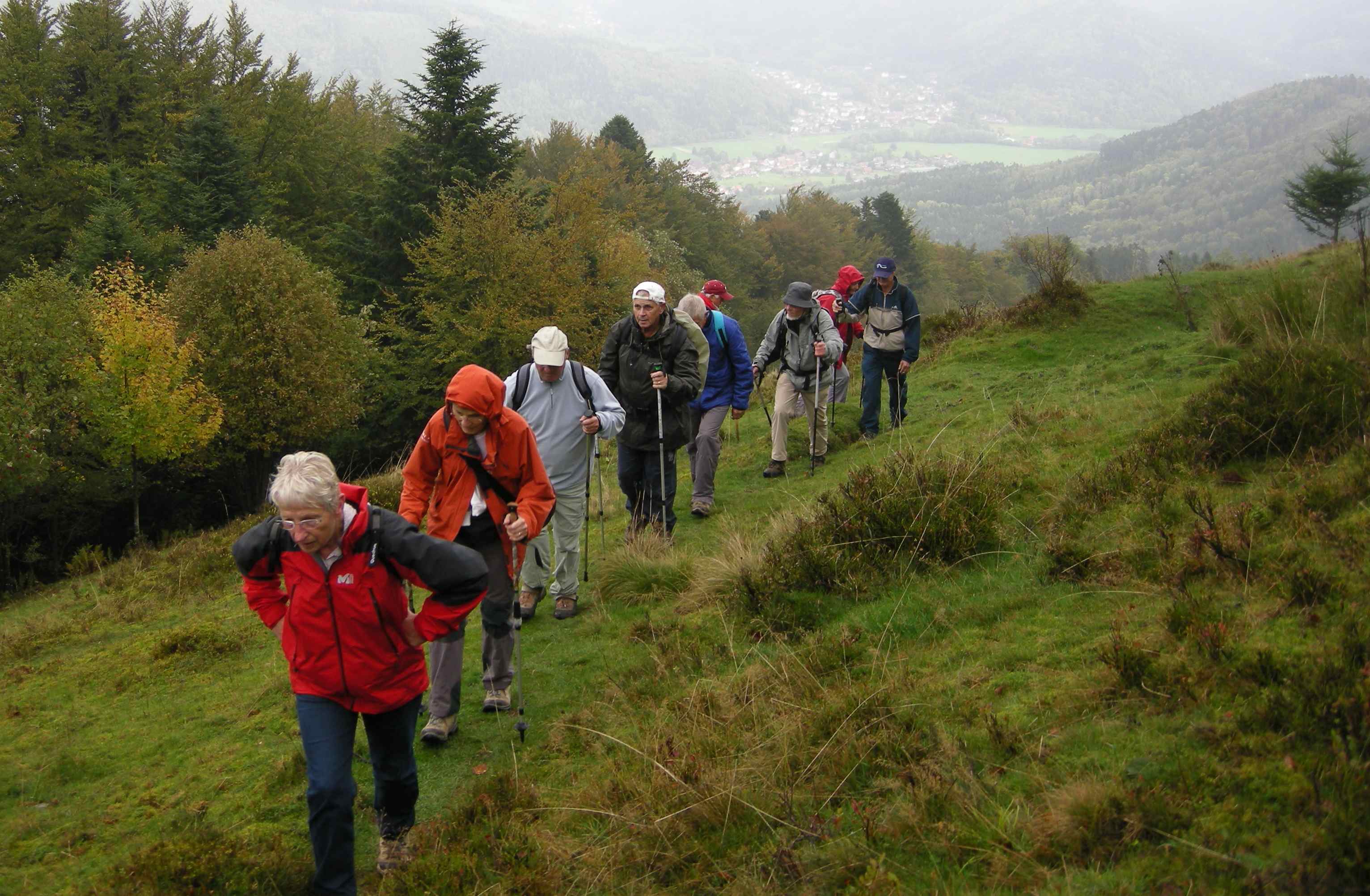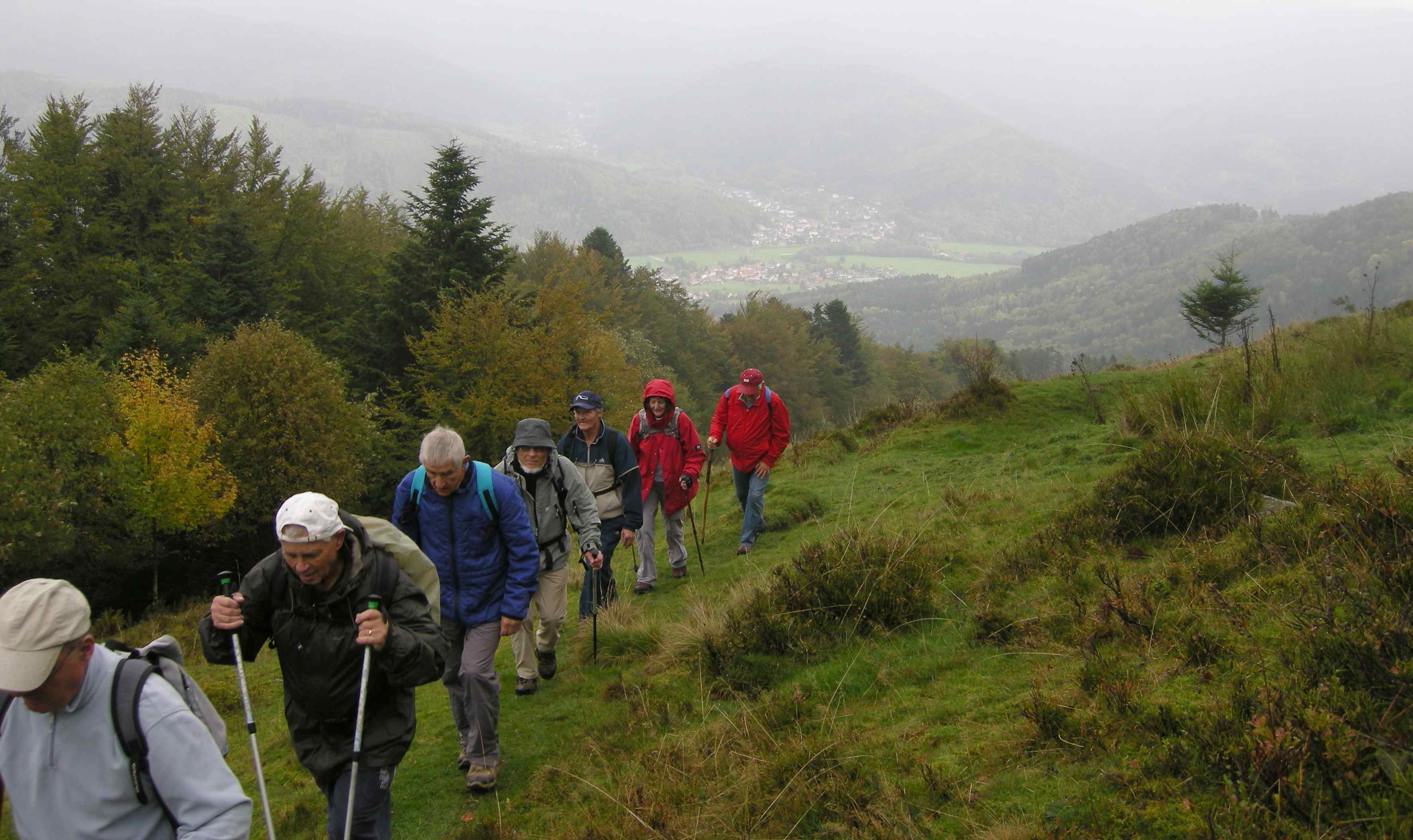 Départ calme avant la montée par la forêt du Holschlagkopf, un dénivelé de 500 m pour atteindre la Croix. Arrivés au sommet, à plus de 1000 m d’altitude : vent fort, pluie et brume. Quel dommage, car par beau temps, la vue sur les Vosges et les Alpes Suisses est magnifique.