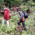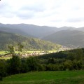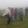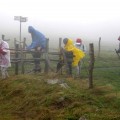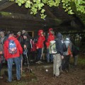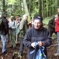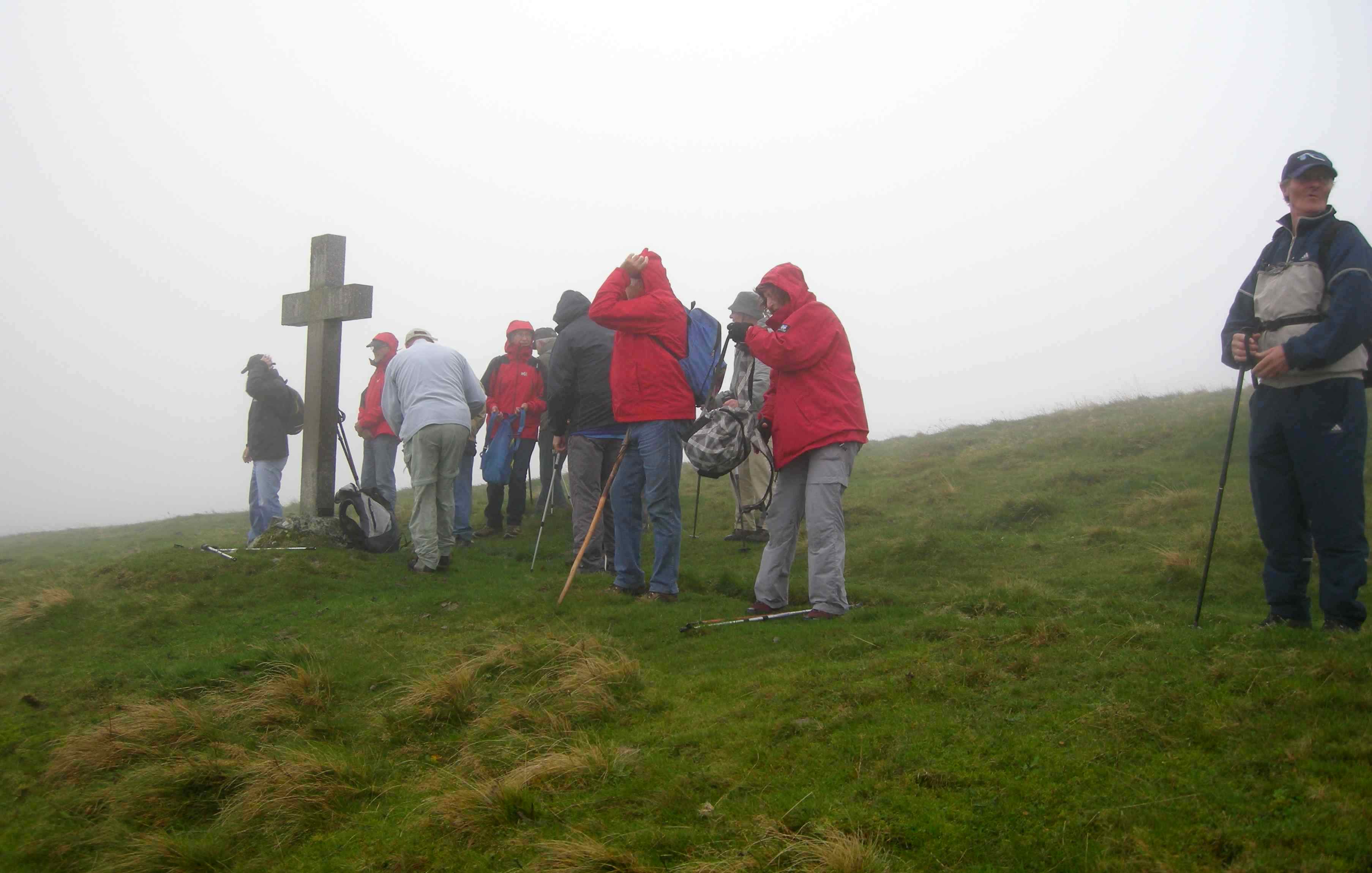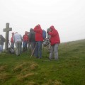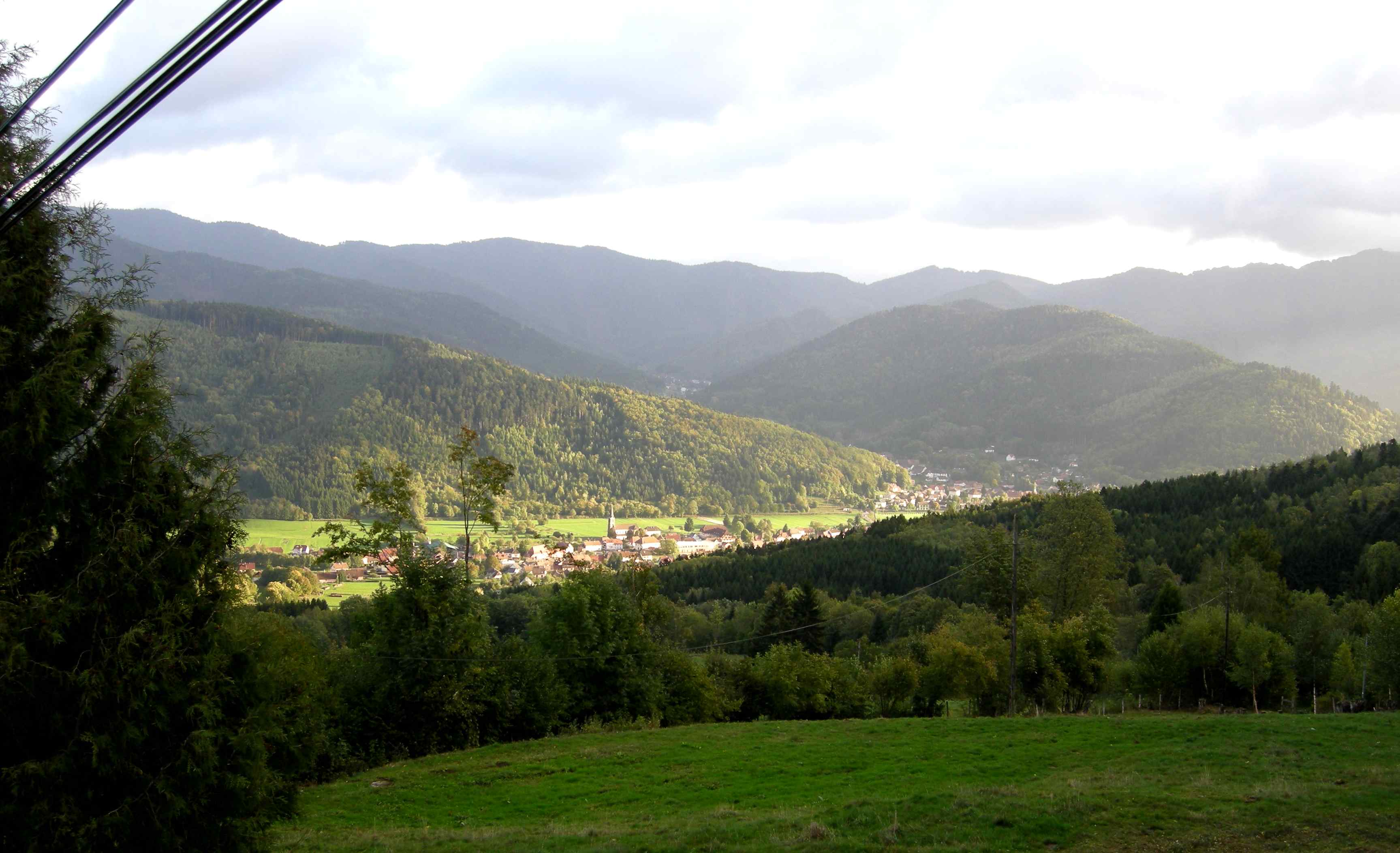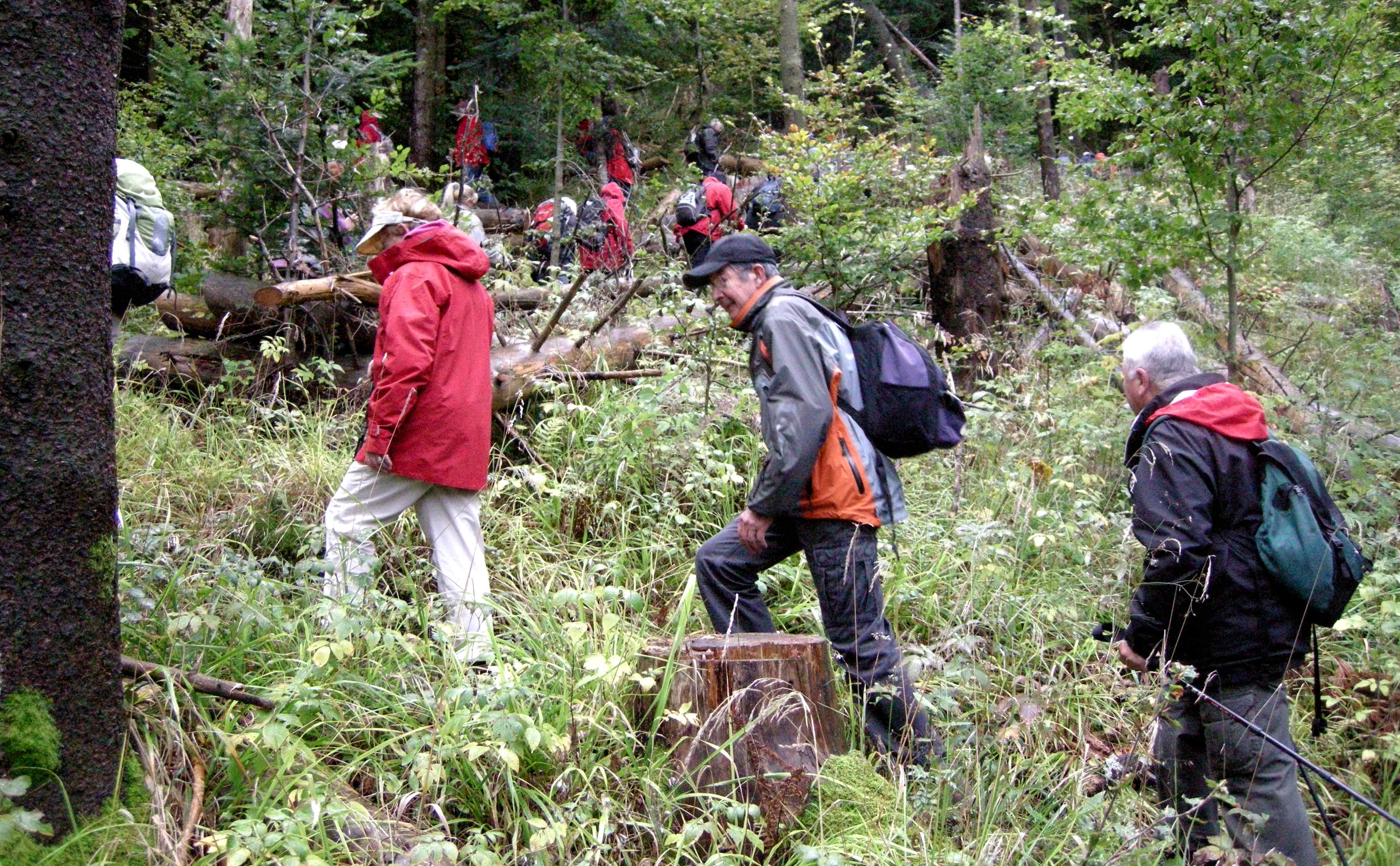 Départ calme avant la montée par la forêt du Holschlagkopf, un dénivelé de 500 m pour atteindre la Croix. Arrivés au sommet, à plus de 1000 m d’altitude : vent fort, pluie et brume. Quel dommage, car par beau temps, la vue sur les Vosges et les Alpes Suisses est magnifique.