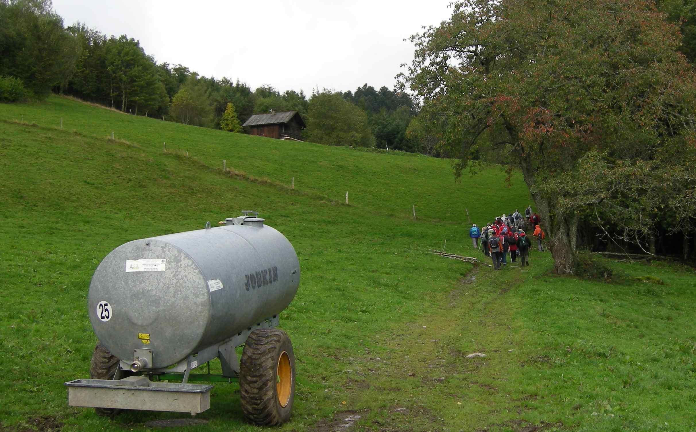 Après une petite halte à l’abri du Sommerseite, nous descendons en direction du Lochberg. Nous découvrons une stèle à proximité de la source de la Doller, bien connue en Alsace, puis une fontaine avant d’arriver à la Ferme auberge du Fennemalt.