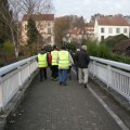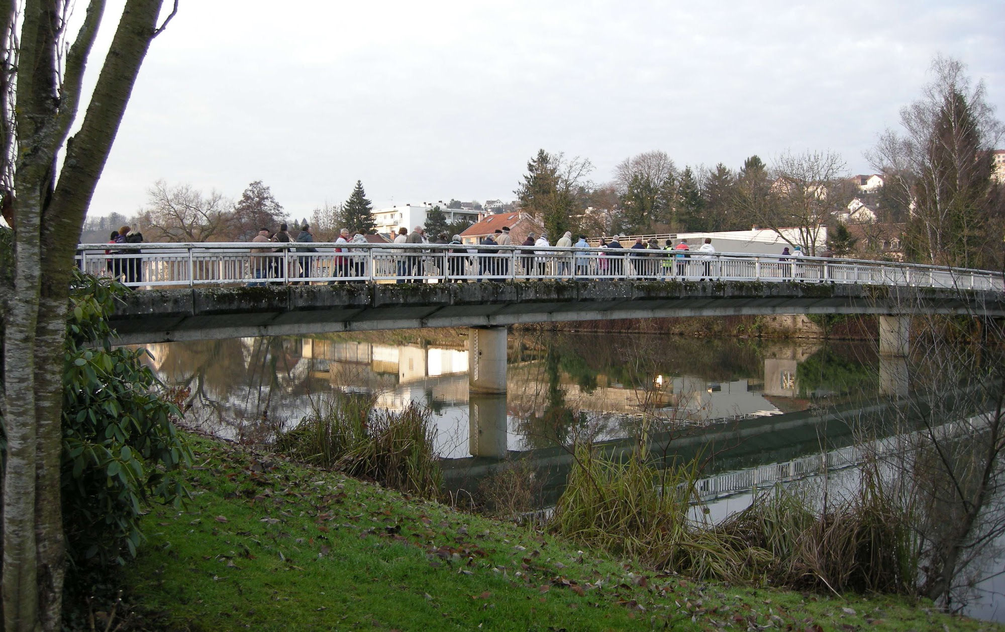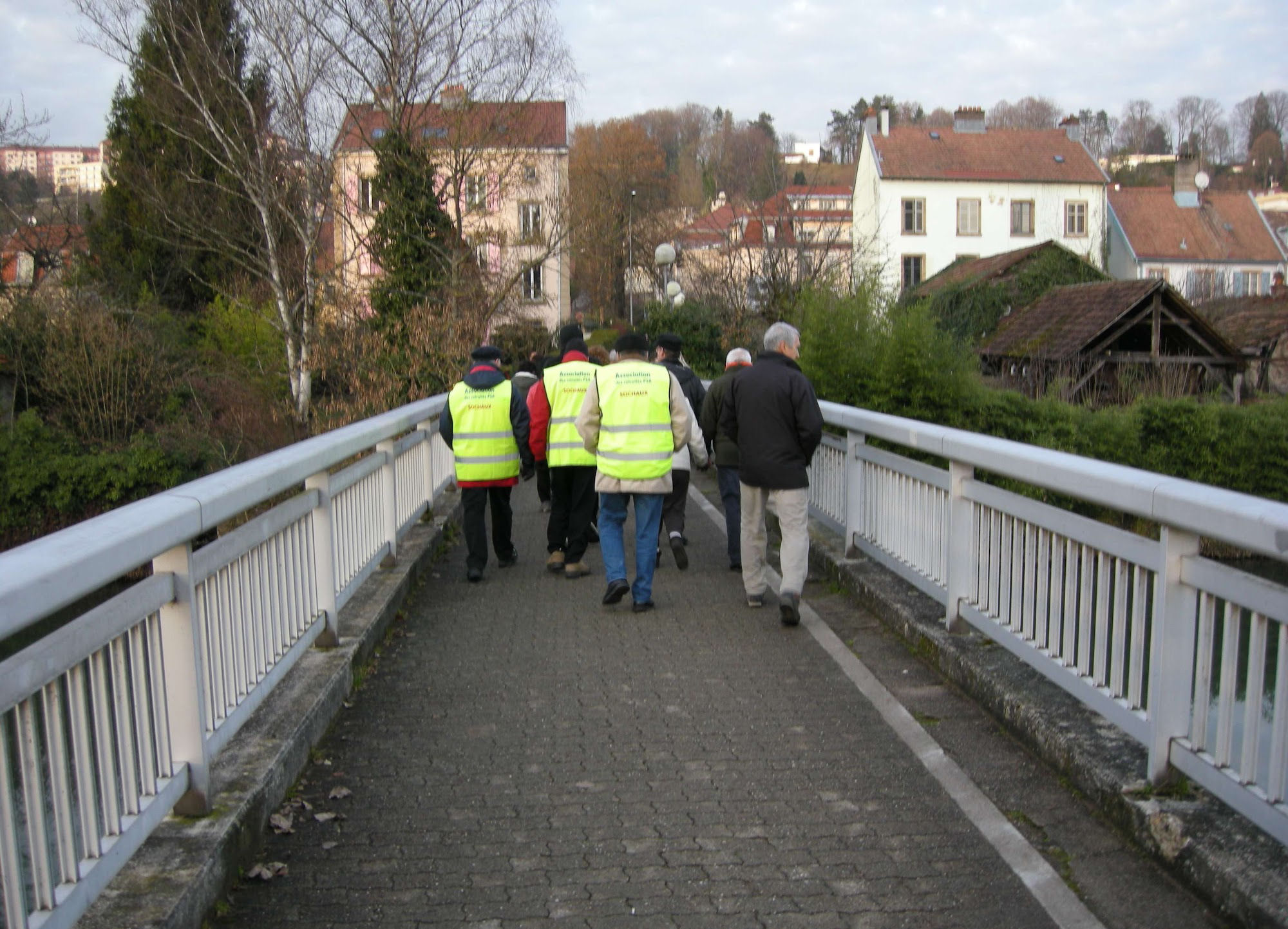 Nous partons du parking de la Roselière à Montbéliard, sous le soleil, par un temps très agréable. Une ambiance amicale règne au sein du groupe des 46 marcheurs de notre Association. Nous longeons l’Allan avant de traverser la passerelle pour nous diriger vers le Parc des Miches.
