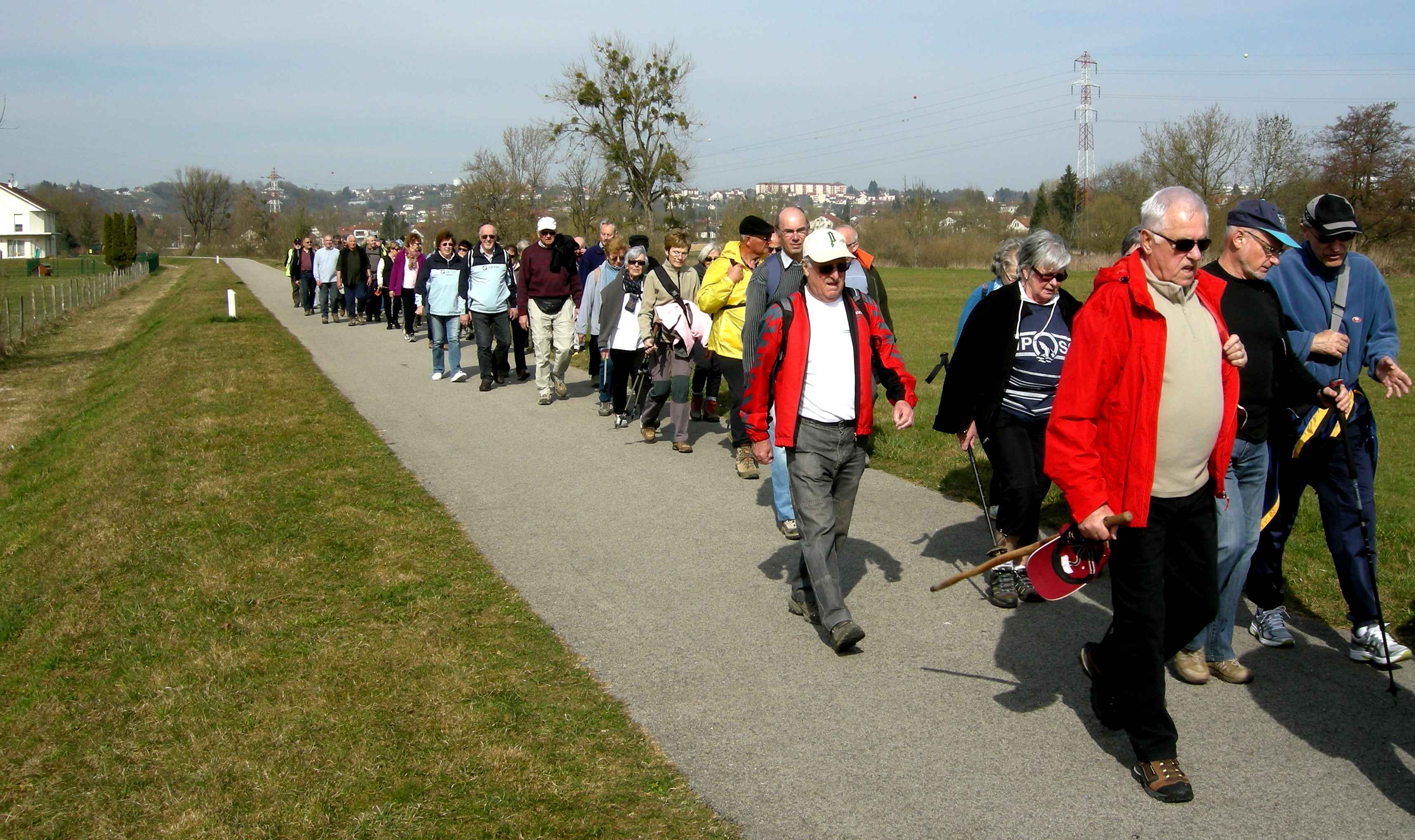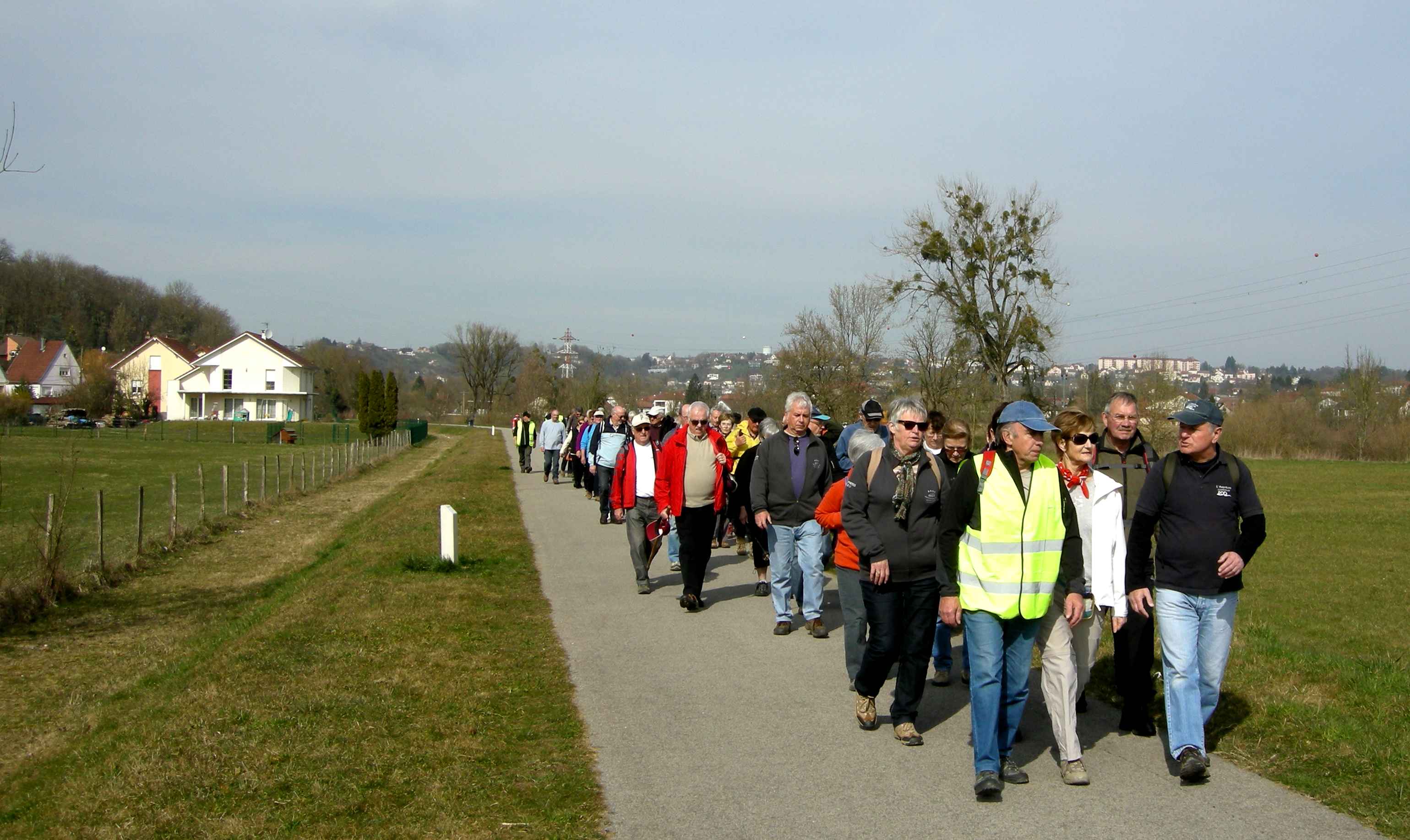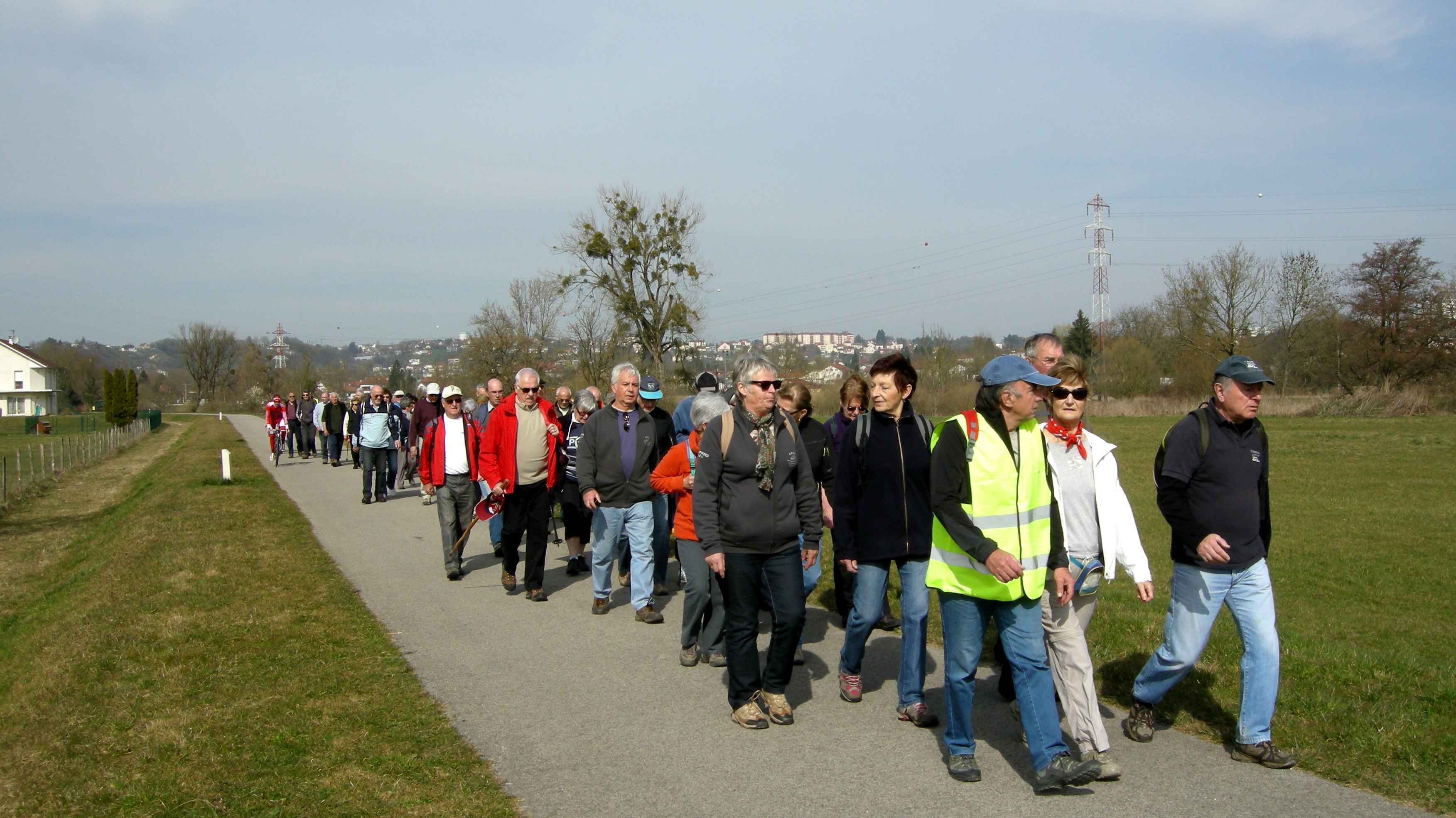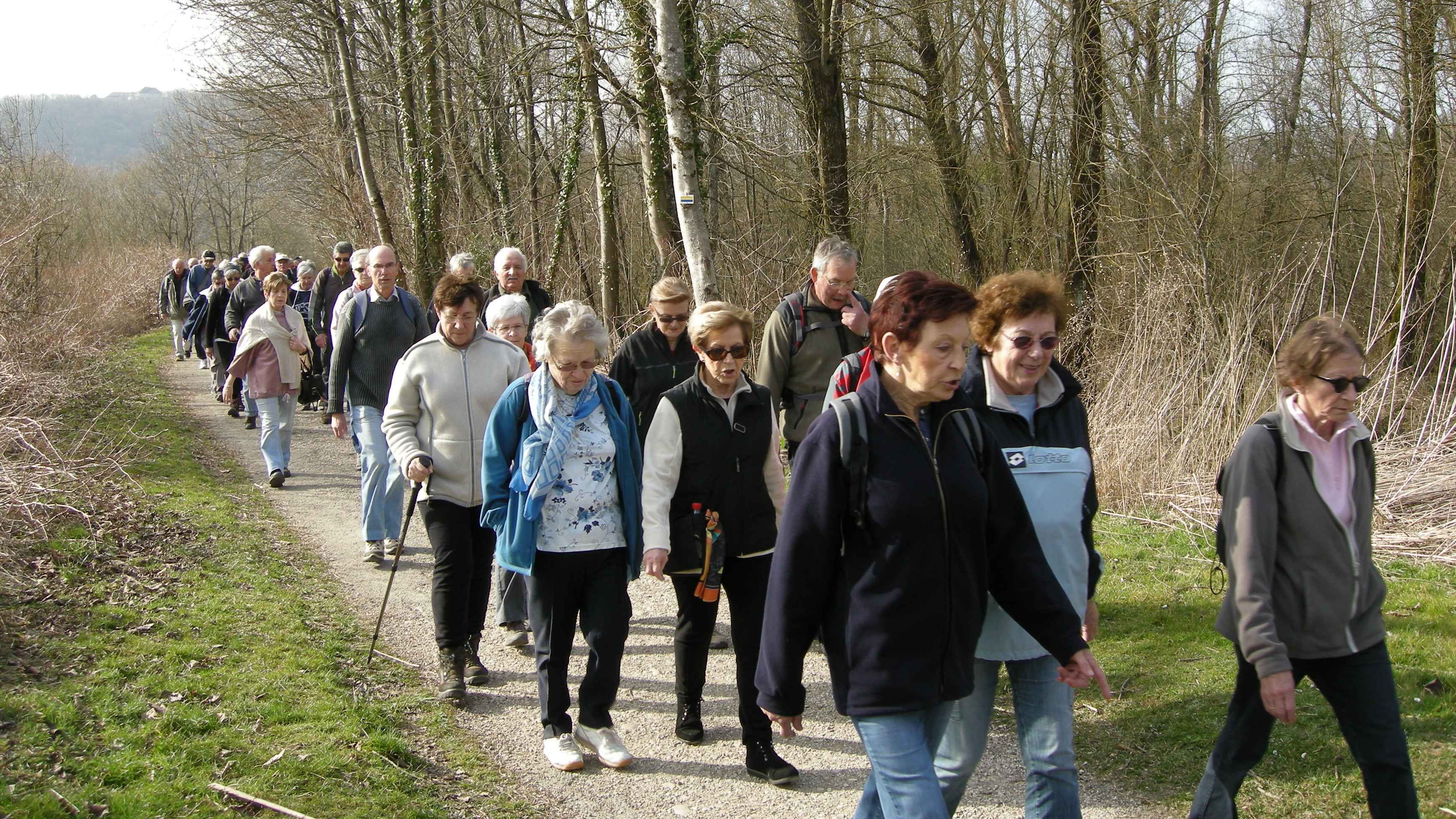 Sous la conduite de Pierre et Michel, bien en ligne, nous suivons l’Allan sur le chemin de halage jusqu’au port de Voujeaucourt. Nous longeons ensuite le canal avant une première pause. Du parcours de santé jusqu’à l’aérodrome de Courcelles que nous contournons, nous rencontrons de nombreux promeneurs qui profitent du printemps avant l’heure.