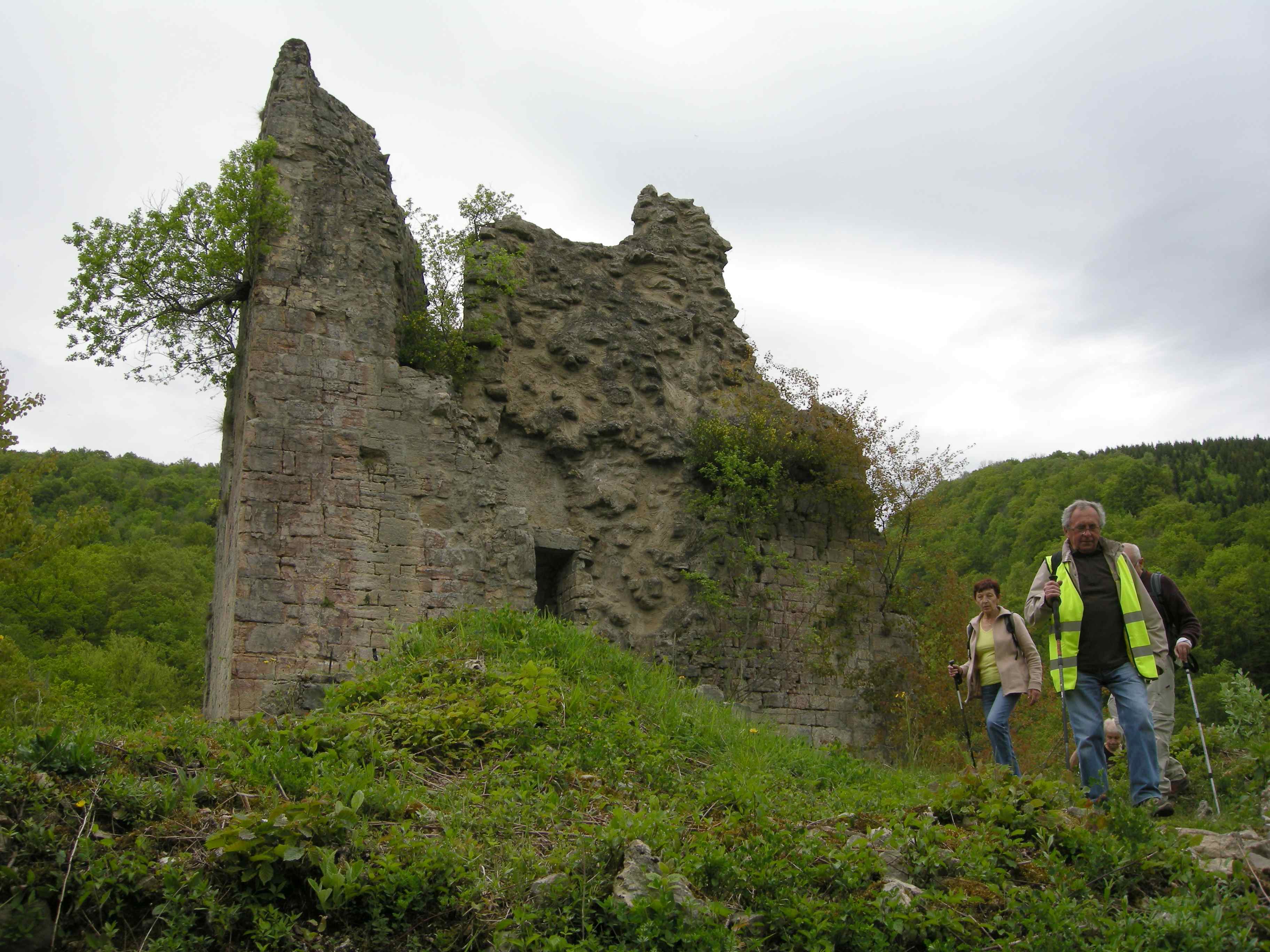 Nous empruntons alors un passage aménagé, en très forte déclivité, pour arriver aux ruines du château de Montjoie, un site classé du XIIIe siècle en cours de restauration. Avant d’arriver à la Chapelle de Montjoie, René nous conte l’histoire des lieux. Ses explications sont très intéressantes : la Momie de Ste Claudine enterrée en 1612, découverte en 1685, est conservée dans un coffre à l’intérieur de la Chapelle.