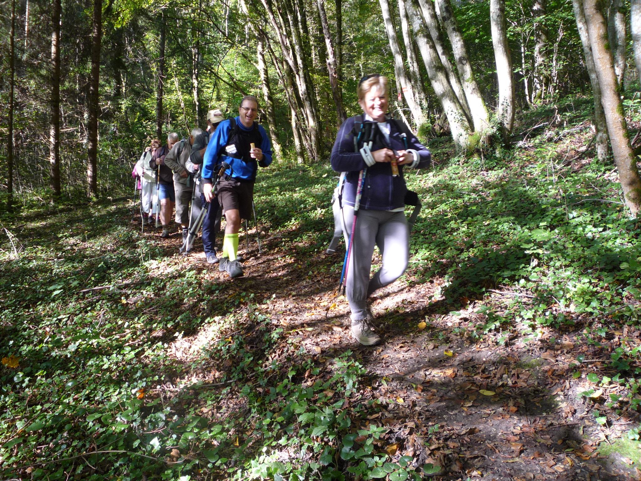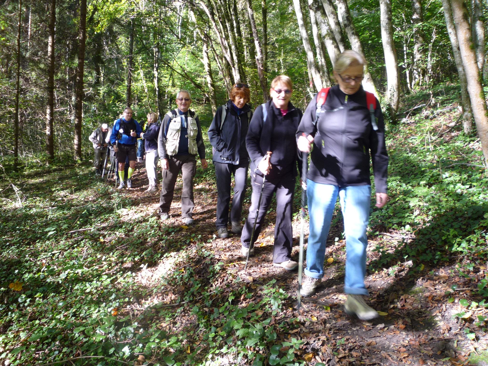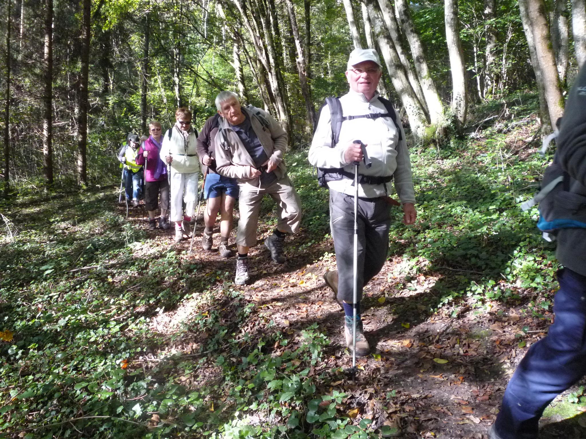Sous la conduite de René et Albert, nous quittons le parking de la Maison pour Tous ; beau soleil mais petite fraîcheur. Nous apercevons le site du moulin à grains de Pont de Roide et longeons le Doubs jusqu’à la passerelle du Fourneau. Nous contournons les terrains de tennis avant de gravir la côte de champ Babon en direction de Roide par la route forestière.