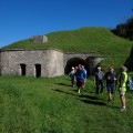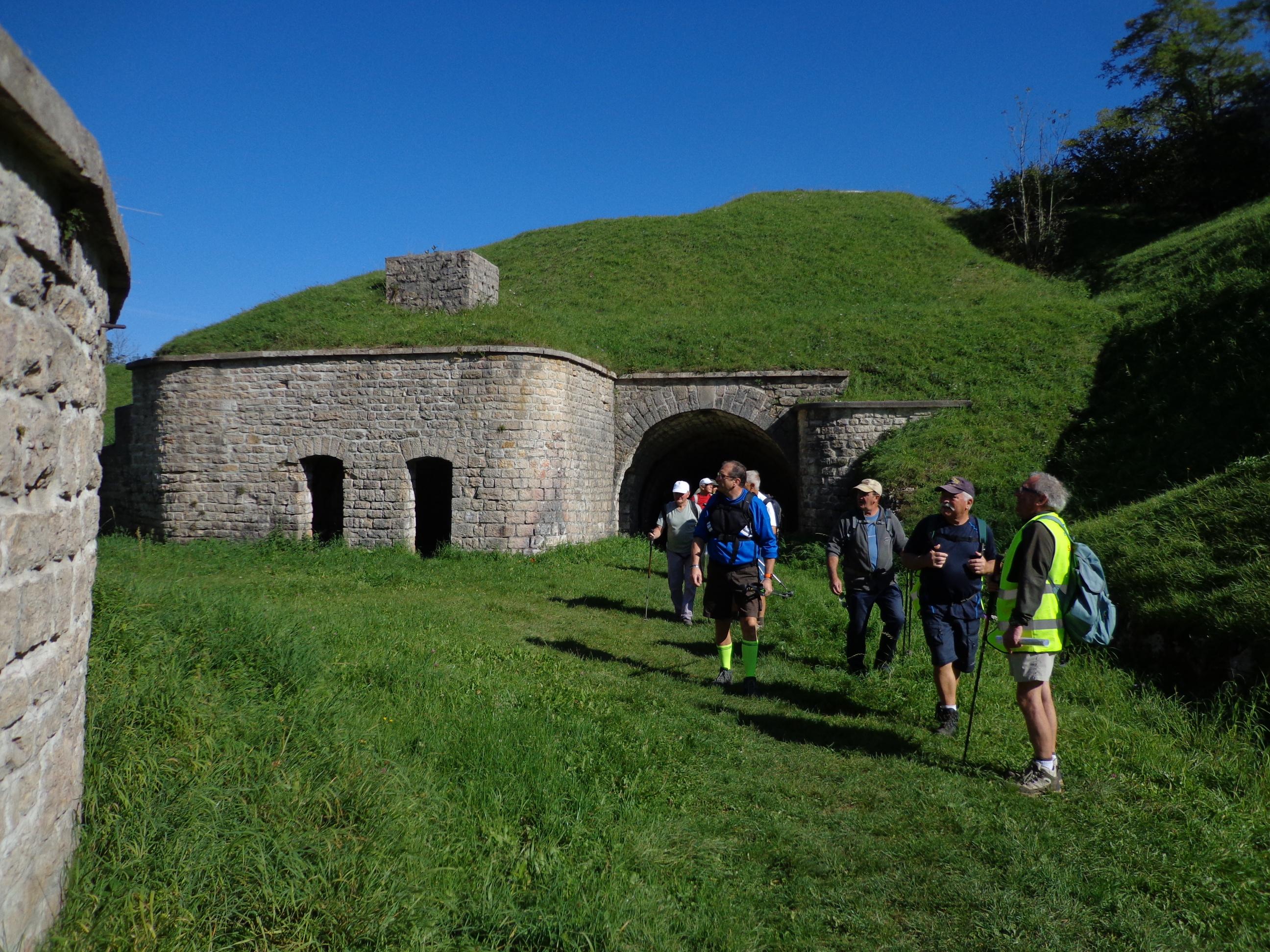 Nous prenons ensuite la direction de la Tour carrée érigée en 1884, observatoire entre fort du Lomont et fort des Roches durant la grande guerre. Alternant route et chemins forestiers, nous arrêtant à plusieurs reprises pour admirer de belles vues sur la région, nous arrivons au fort des Roches et sa batterie-redoute Daubenton (dite batterie des Roches). Nous visitons le fort, par chance exceptionnellement ouvert. Les riches explications de René sur ce site ont enthousiasmé nos marcheurs.