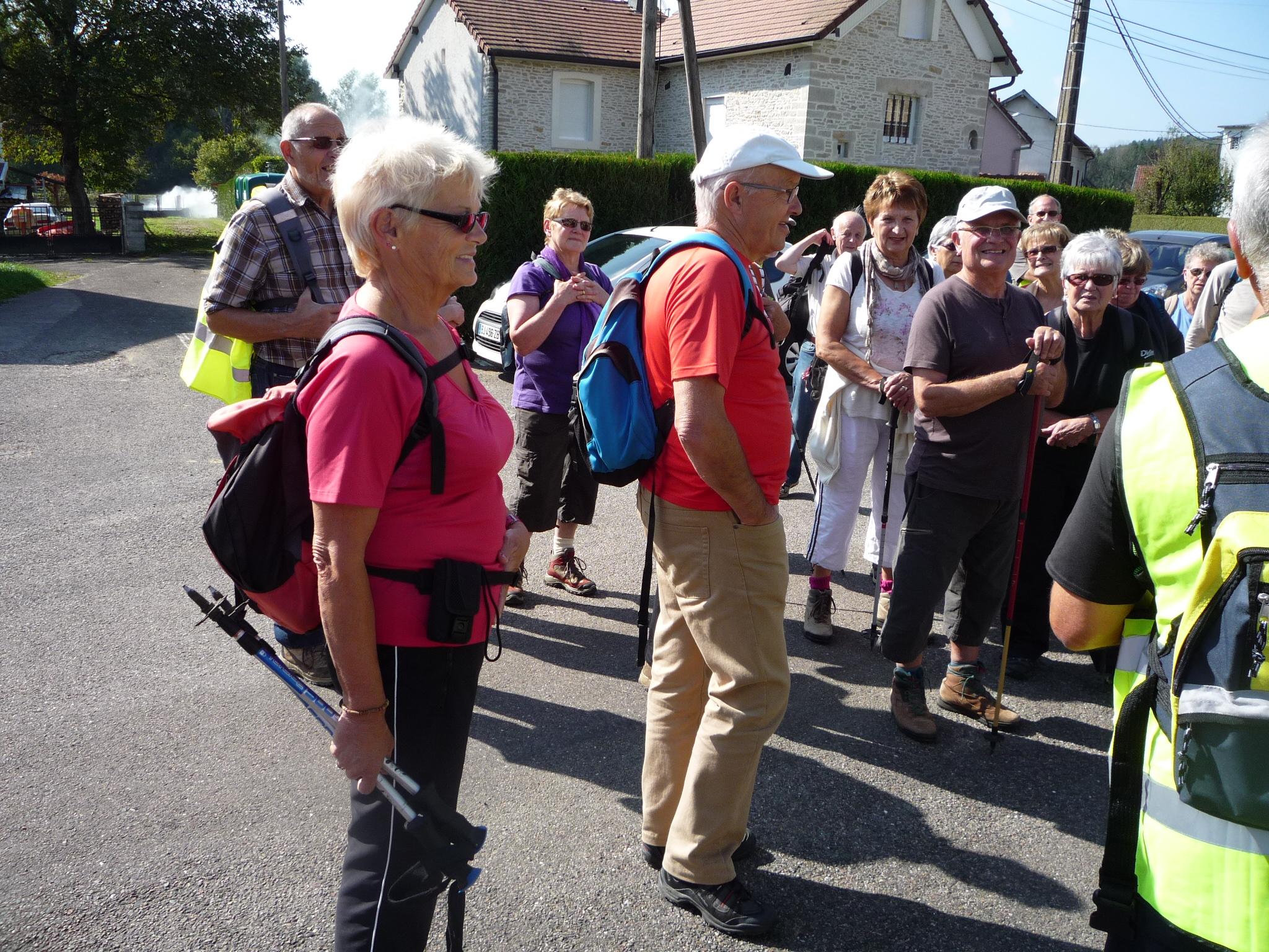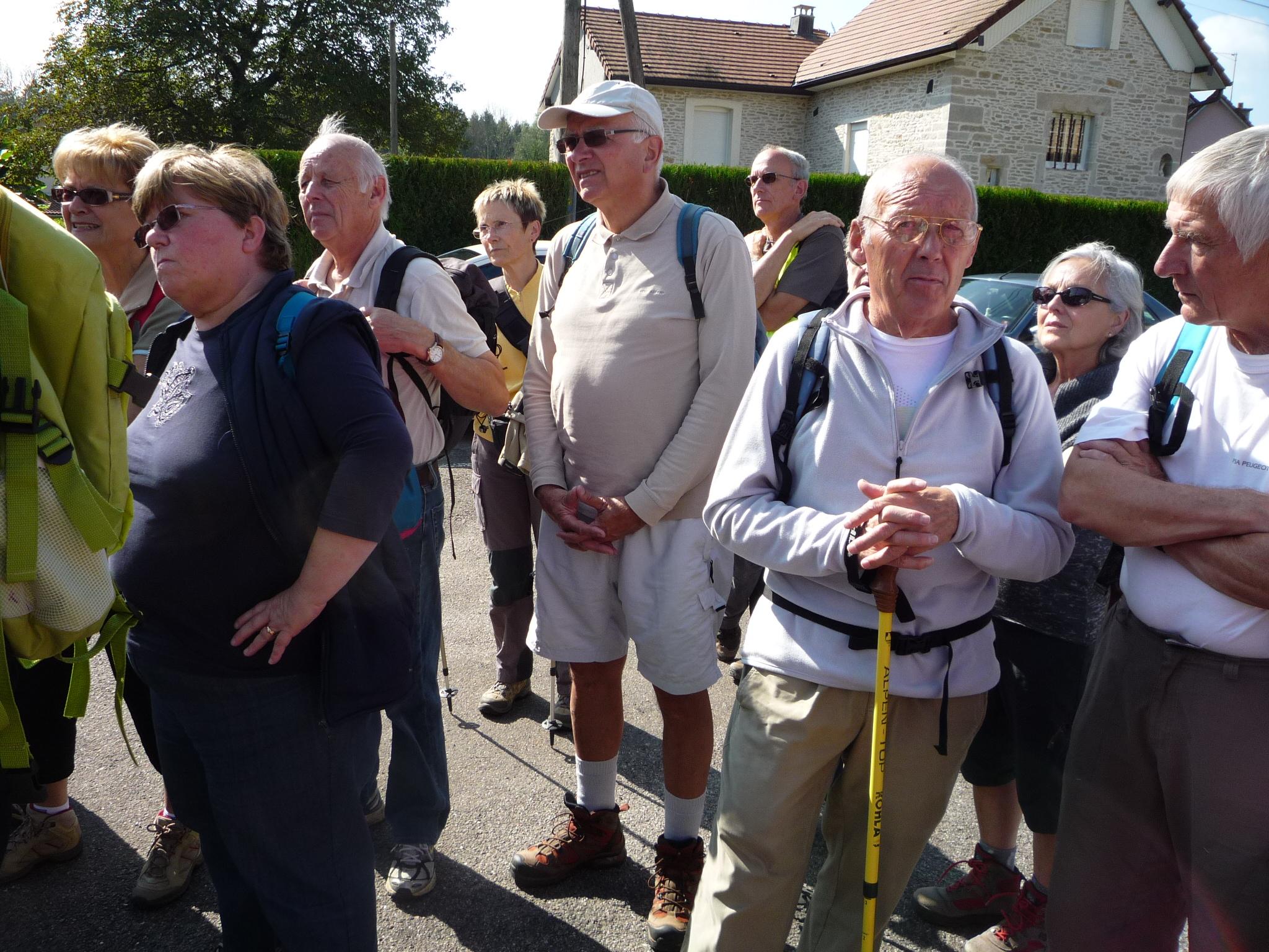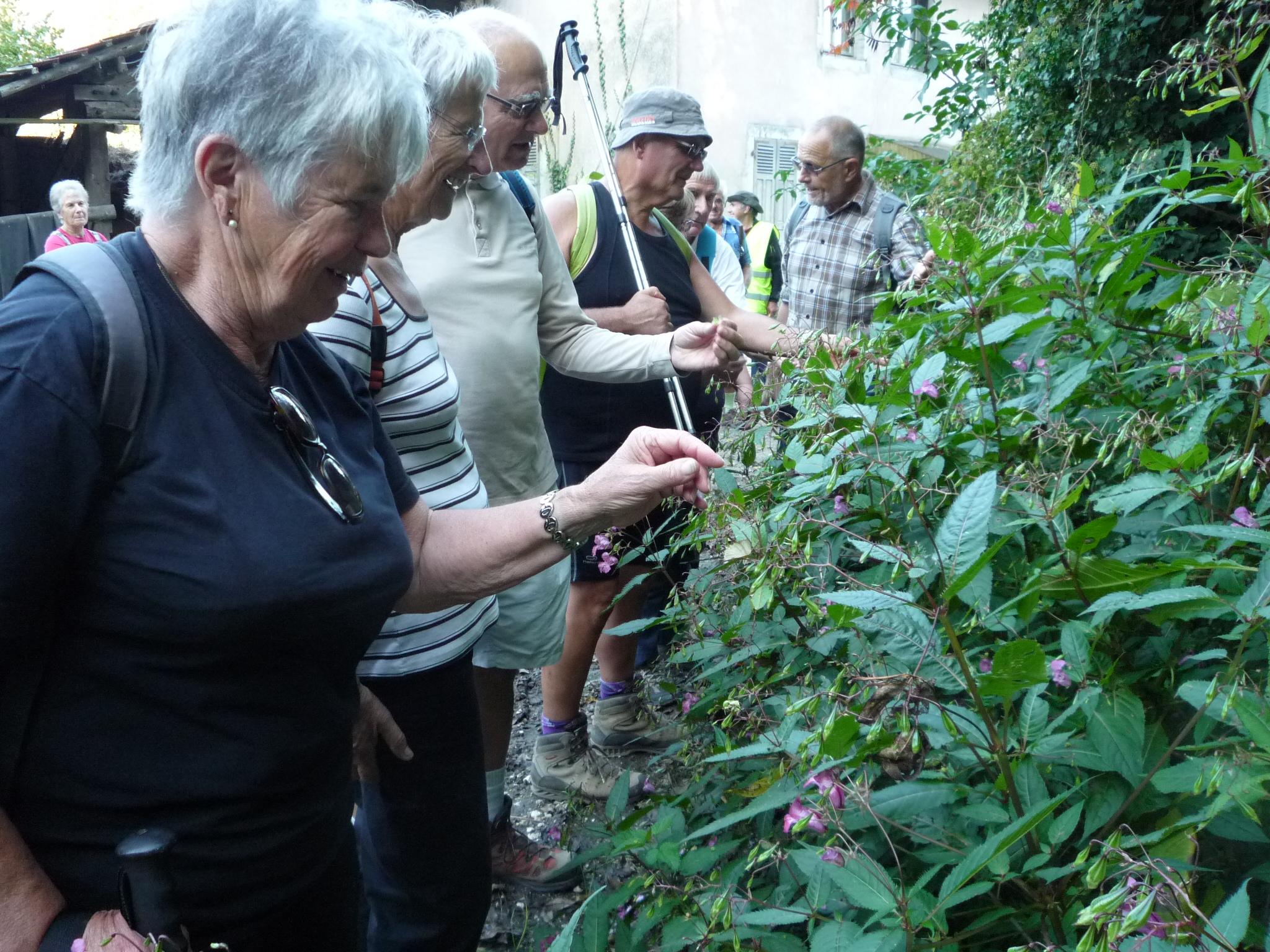 Notre balade se poursuit dans cette paisible campagne ensoleillée. Admirant de superbes chevaux et précédé par un jeune chien, le groupe arrive devant le moulin d’un industriel du XIXe siècle pour en connaître les détails. On découvre la mairie à clocheton du charmant village de Blussangeaux, connu pour son isolement lors des fortes crues du Doubs. De jolies demeures fleuries, parfois au toit de lave, attirent notre regard lorsque, à proximité d’un puits à balancier, cette amie des fleurs nous propose de revenir pour visiter en famille son fabuleux jardin.