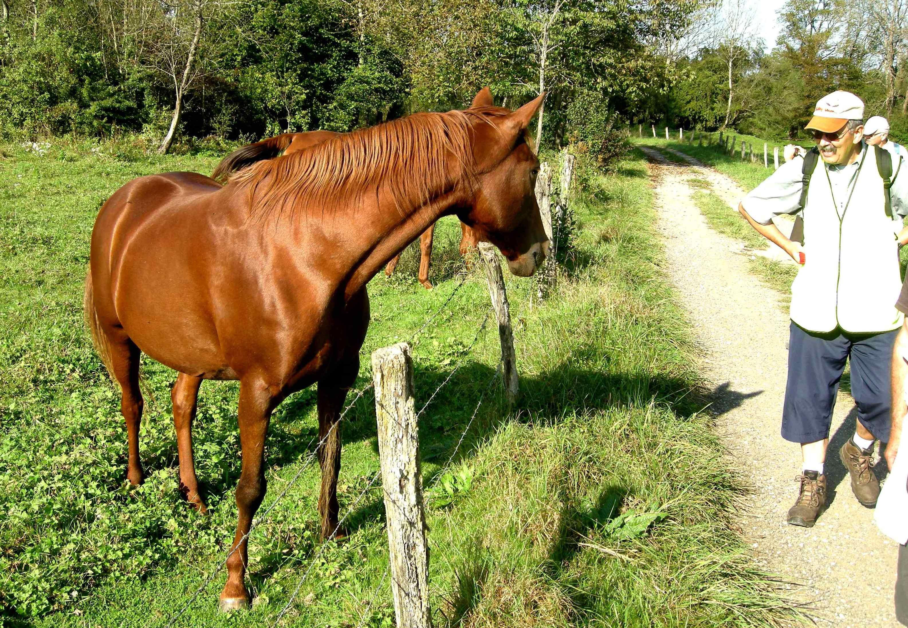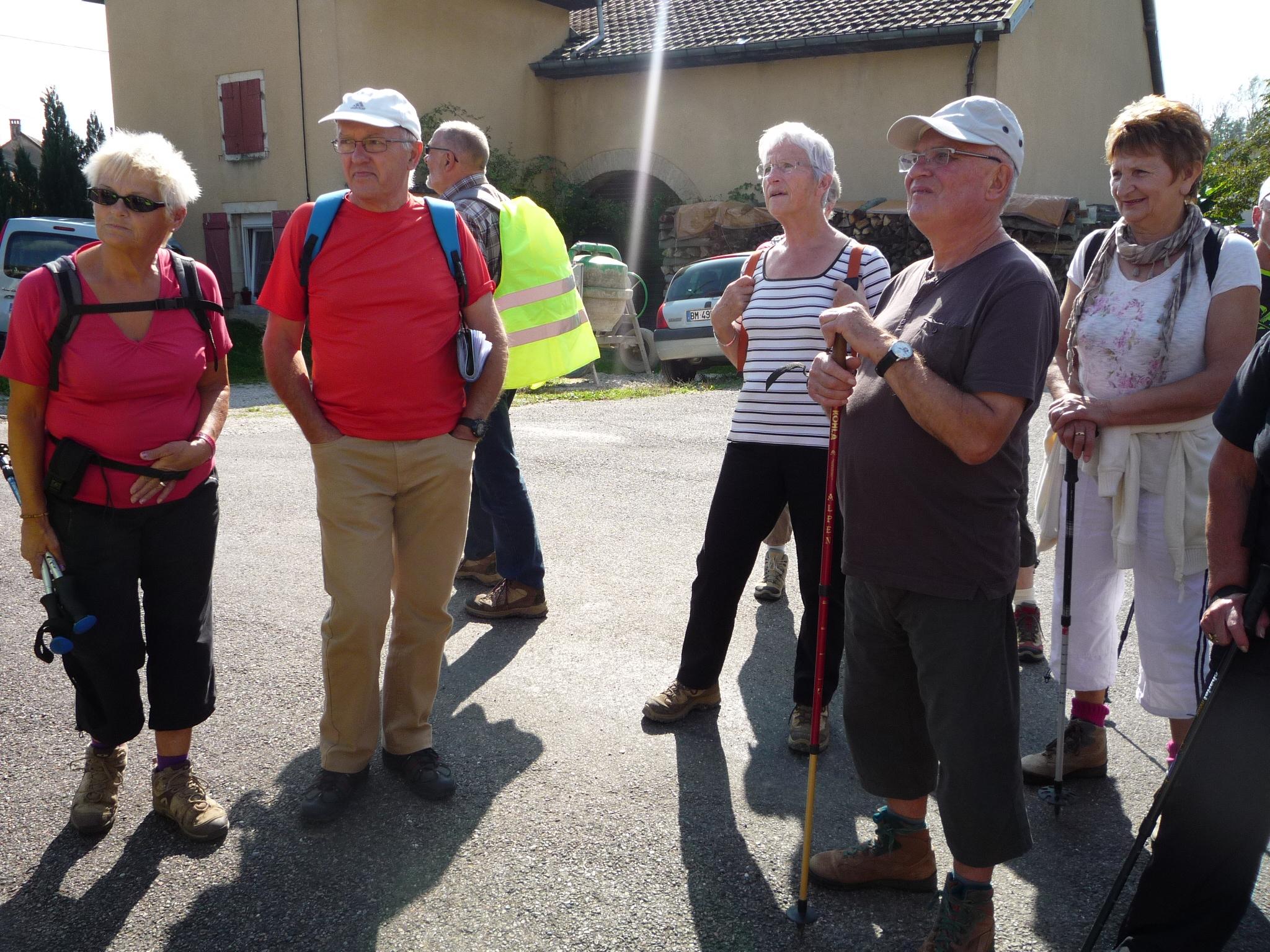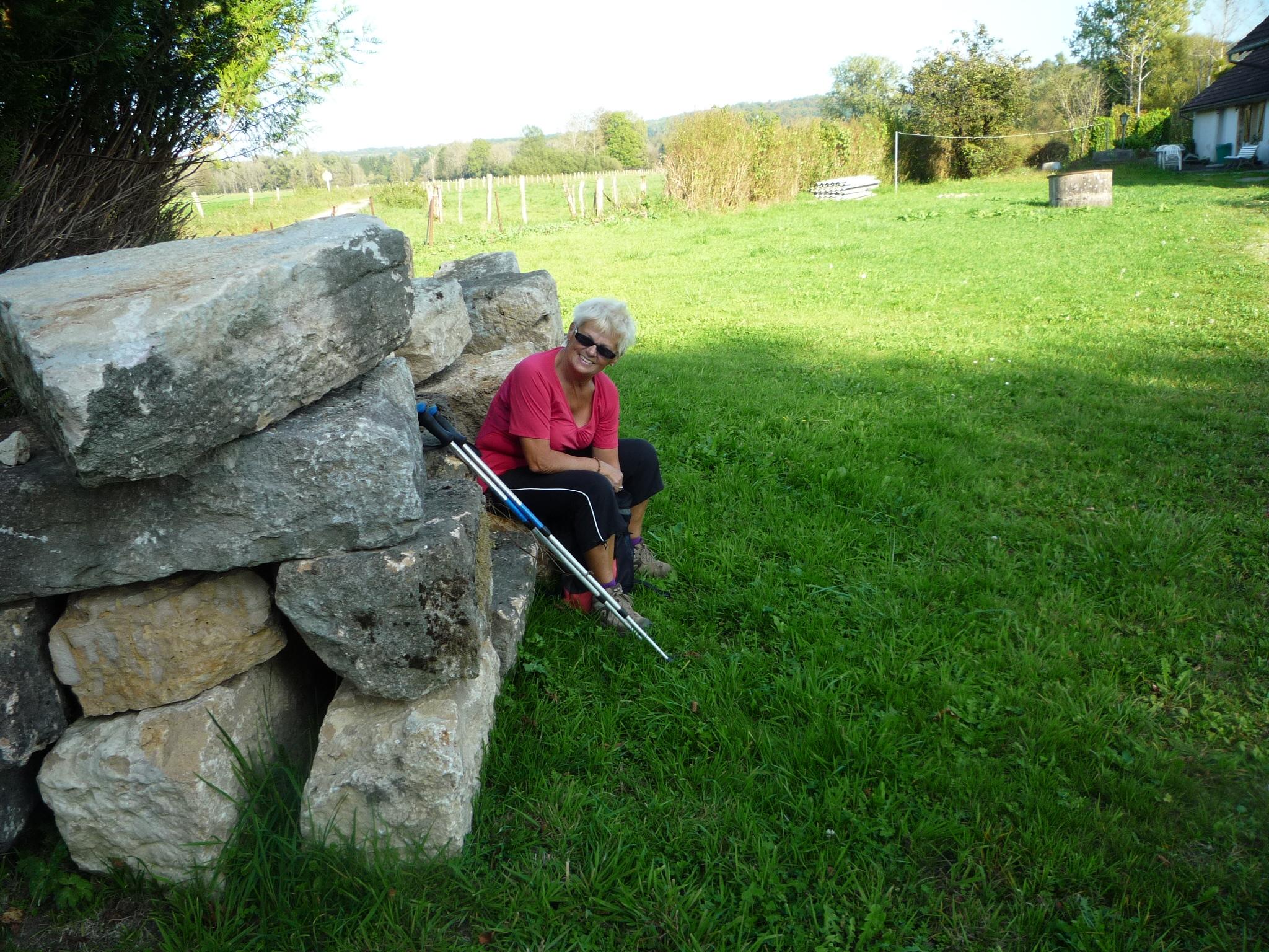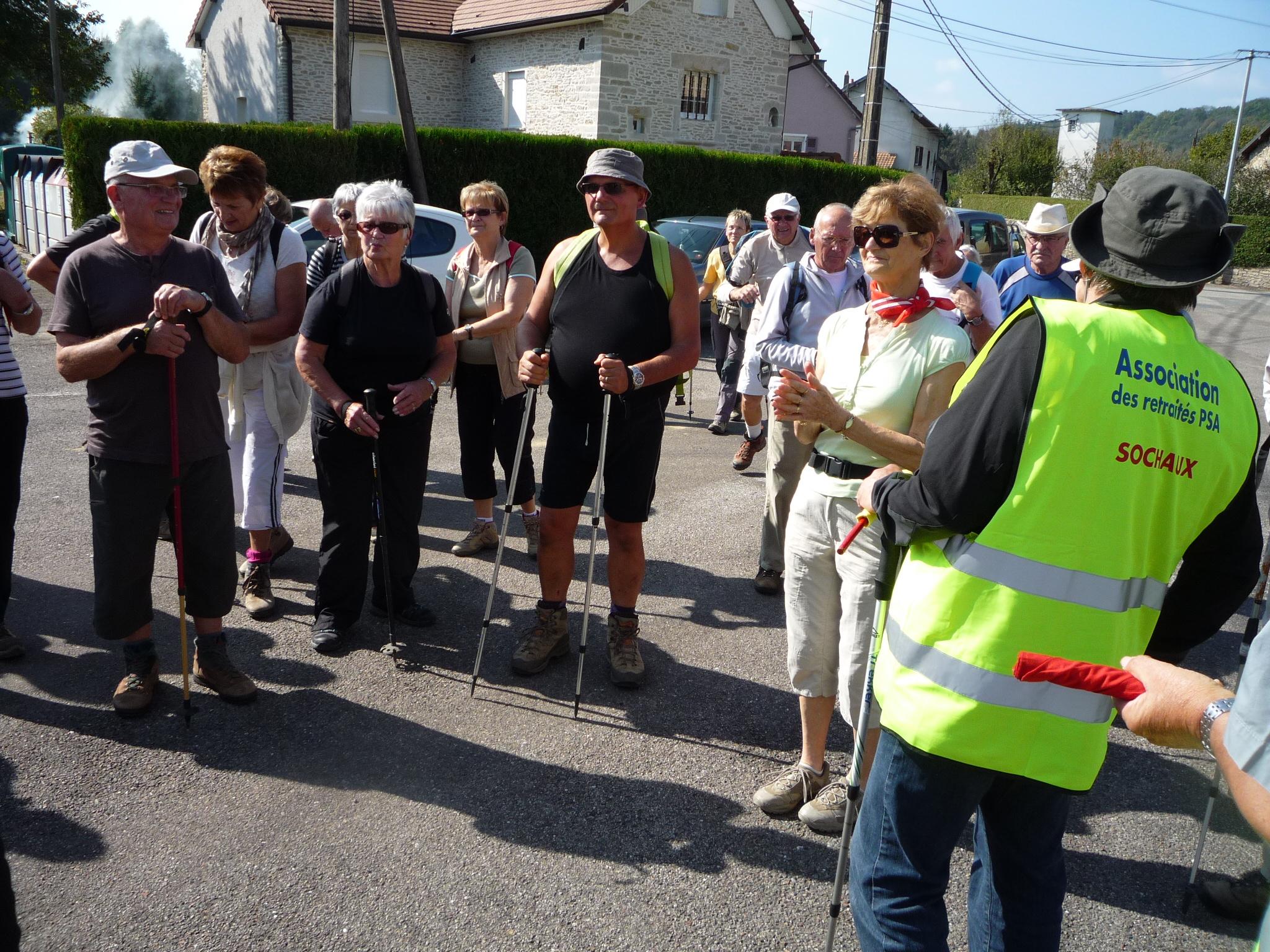 Notre balade se poursuit dans cette paisible campagne ensoleillée. Admirant de superbes chevaux et précédé par un jeune chien, le groupe arrive devant le moulin d’un industriel du XIXe siècle pour en connaître les détails. On découvre la mairie à clocheton du charmant village de Blussangeaux, connu pour son isolement lors des fortes crues du Doubs. De jolies demeures fleuries, parfois au toit de lave, attirent notre regard lorsque, à proximité d’un puits à balancier, cette amie des fleurs nous propose de revenir pour visiter en famille son fabuleux jardin.