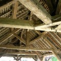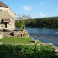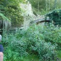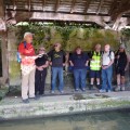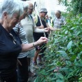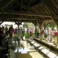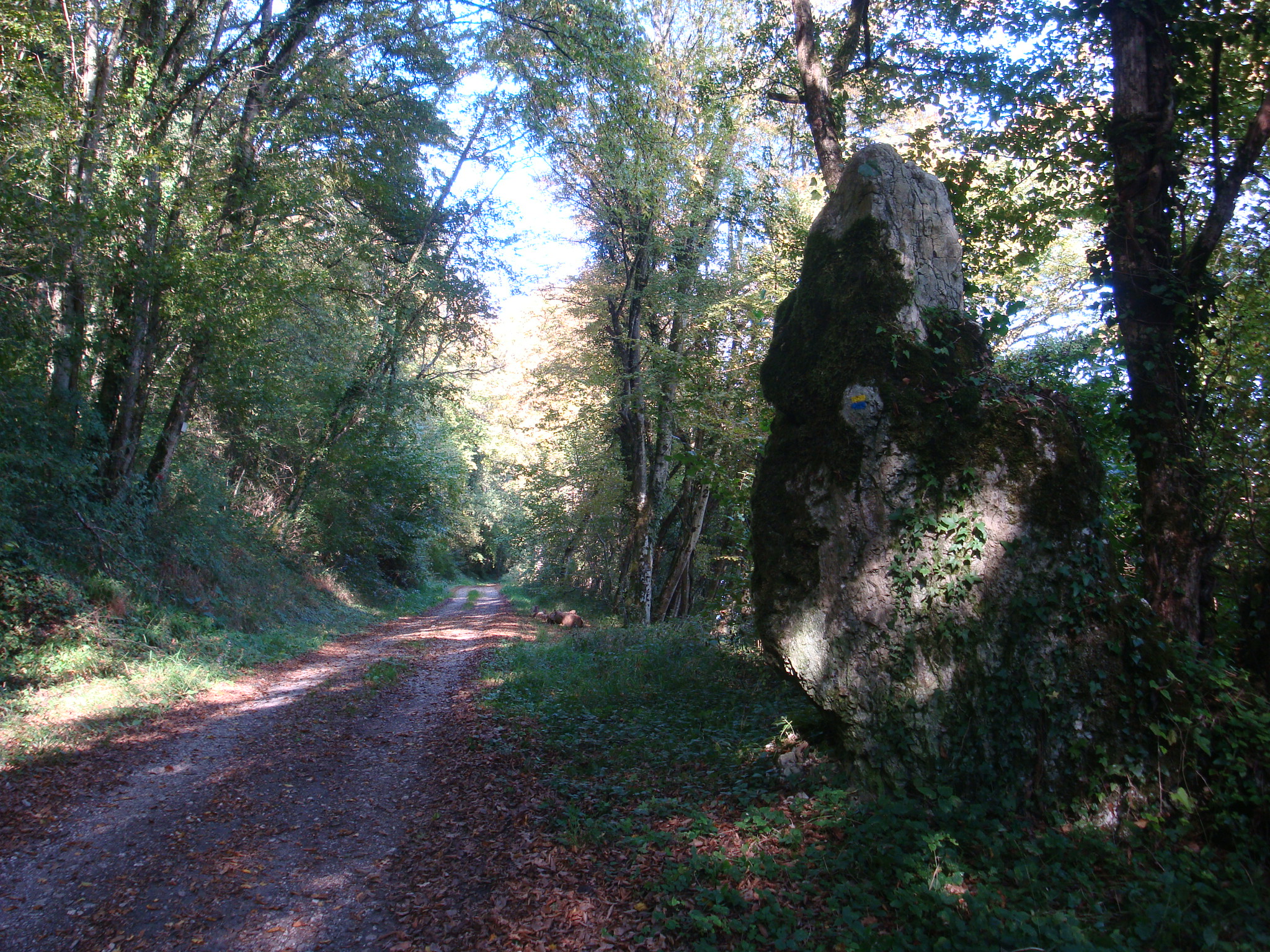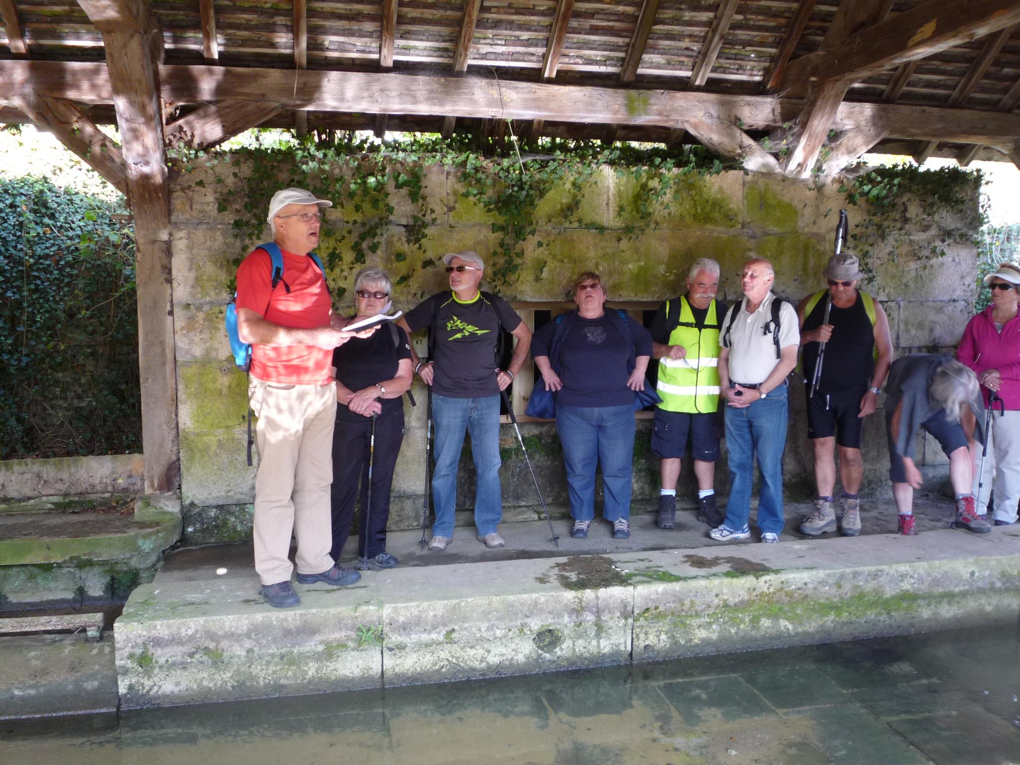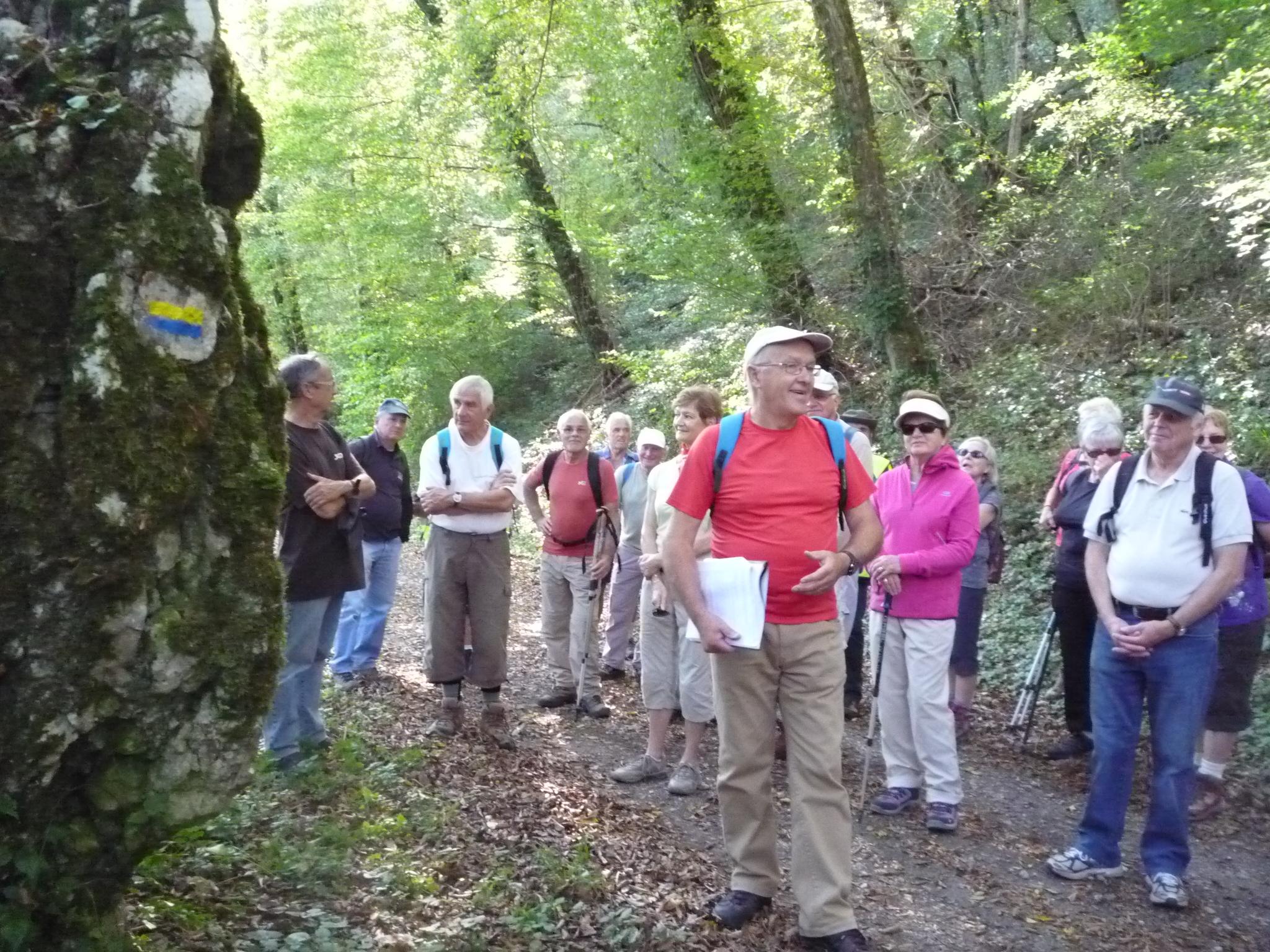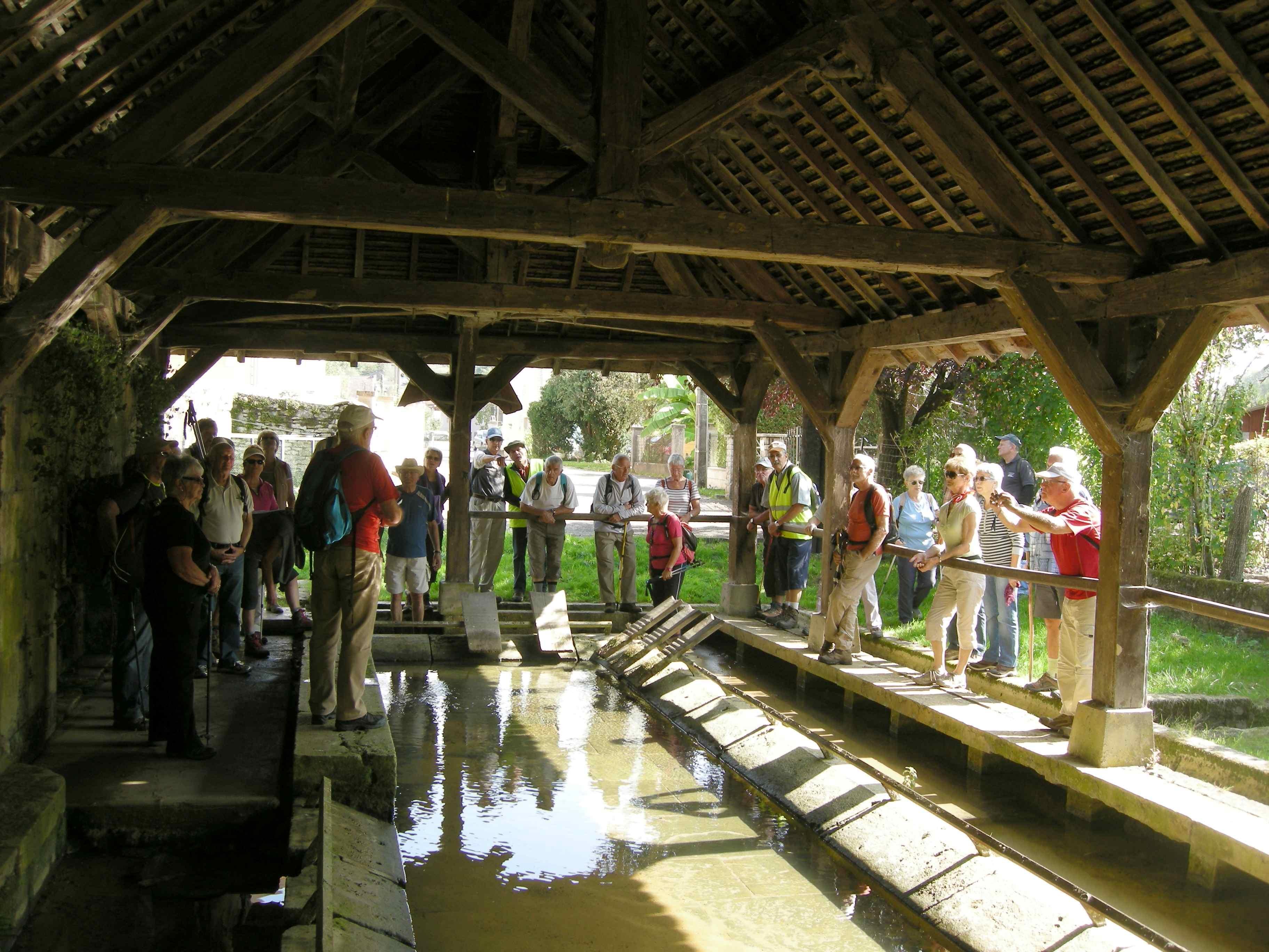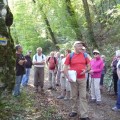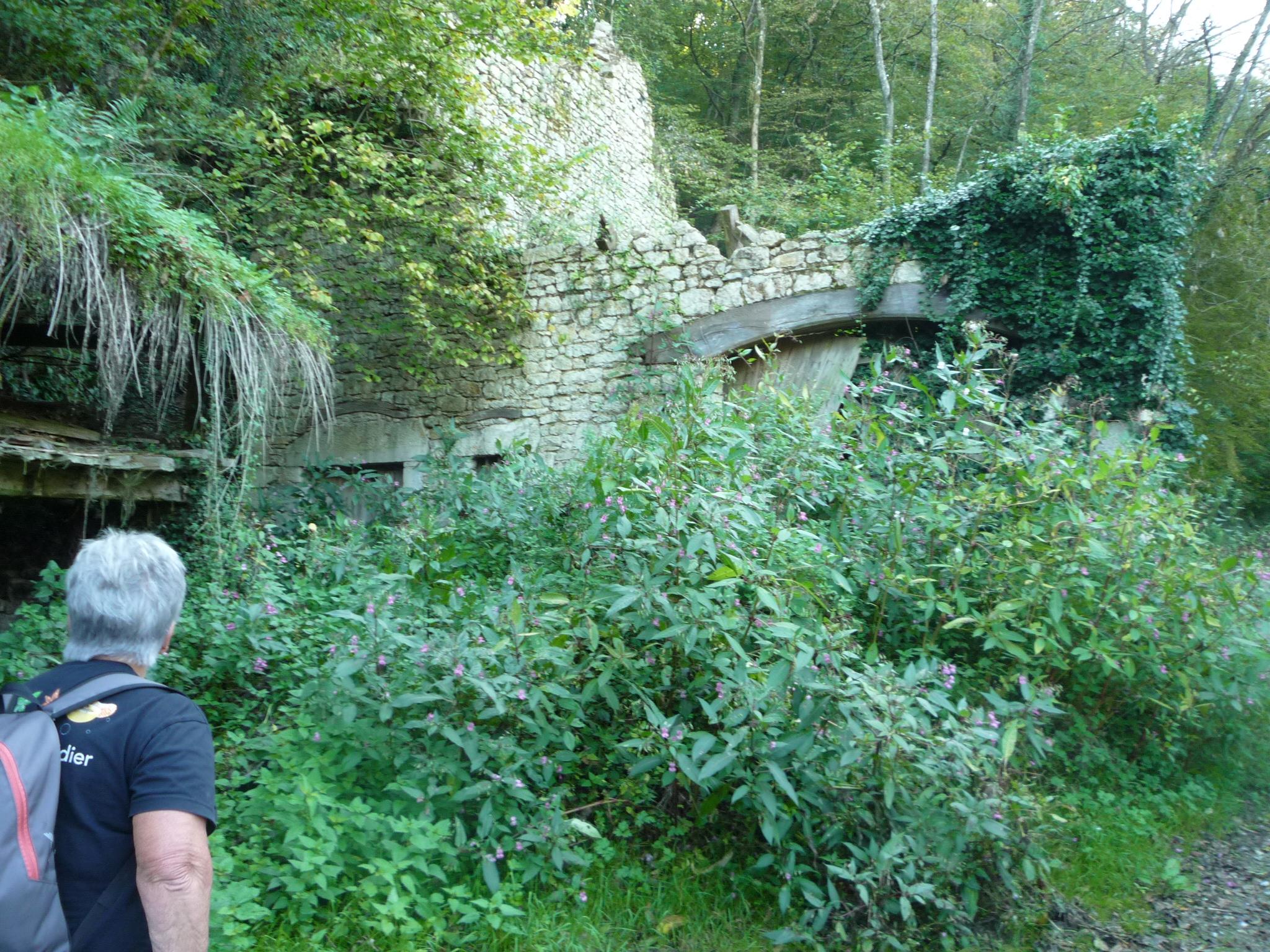 Sur la voie romaine ombragée, avant d’arriver au pont du chemin de fer puis au barrage du Châtelot, nous trouvons la pierre qui tourne (la nuit de Noël…) et une maison troglodyte. Le toit végétal d’une maison où l’on teignait le chanvre, la flore bordant le chemin intriguent nos marcheurs. Les commentaires vont bon train.