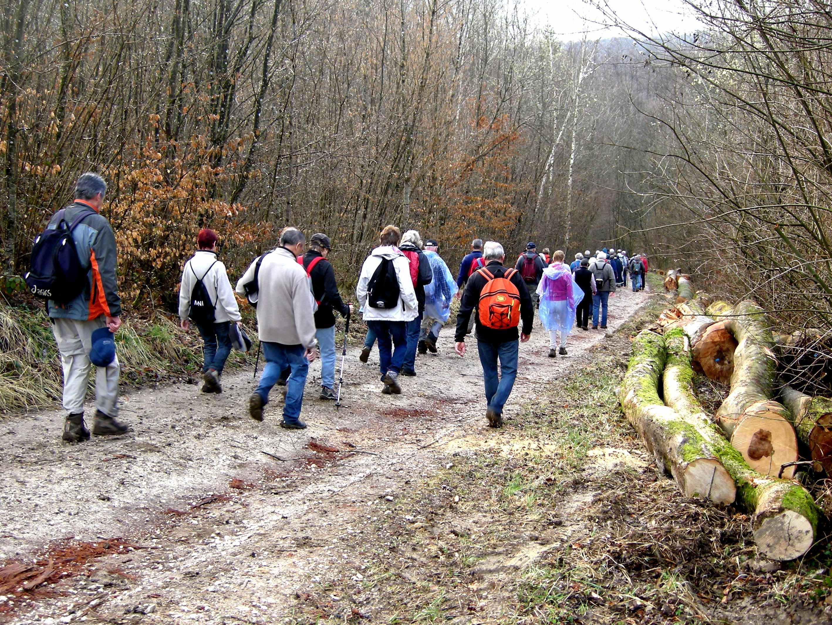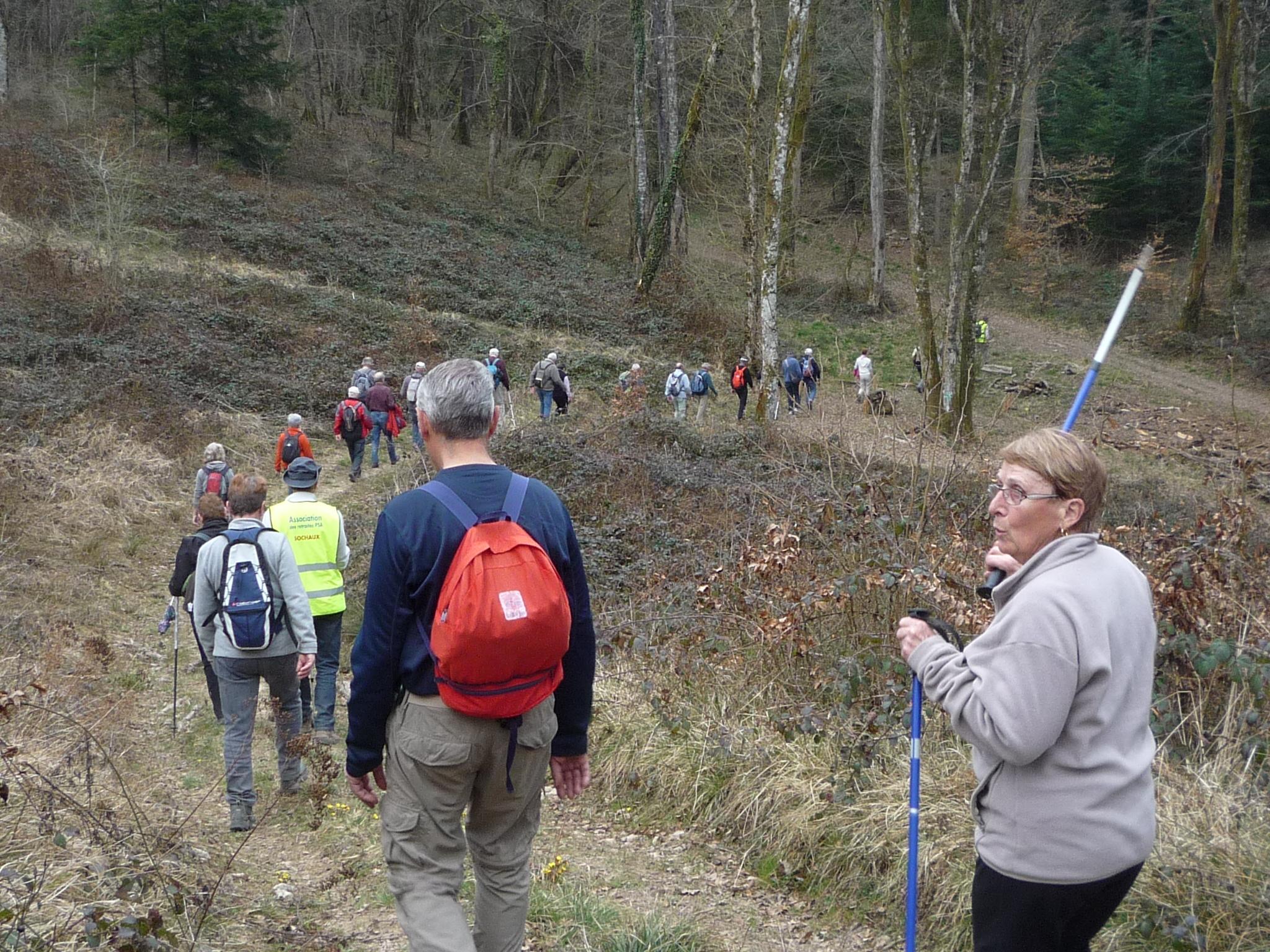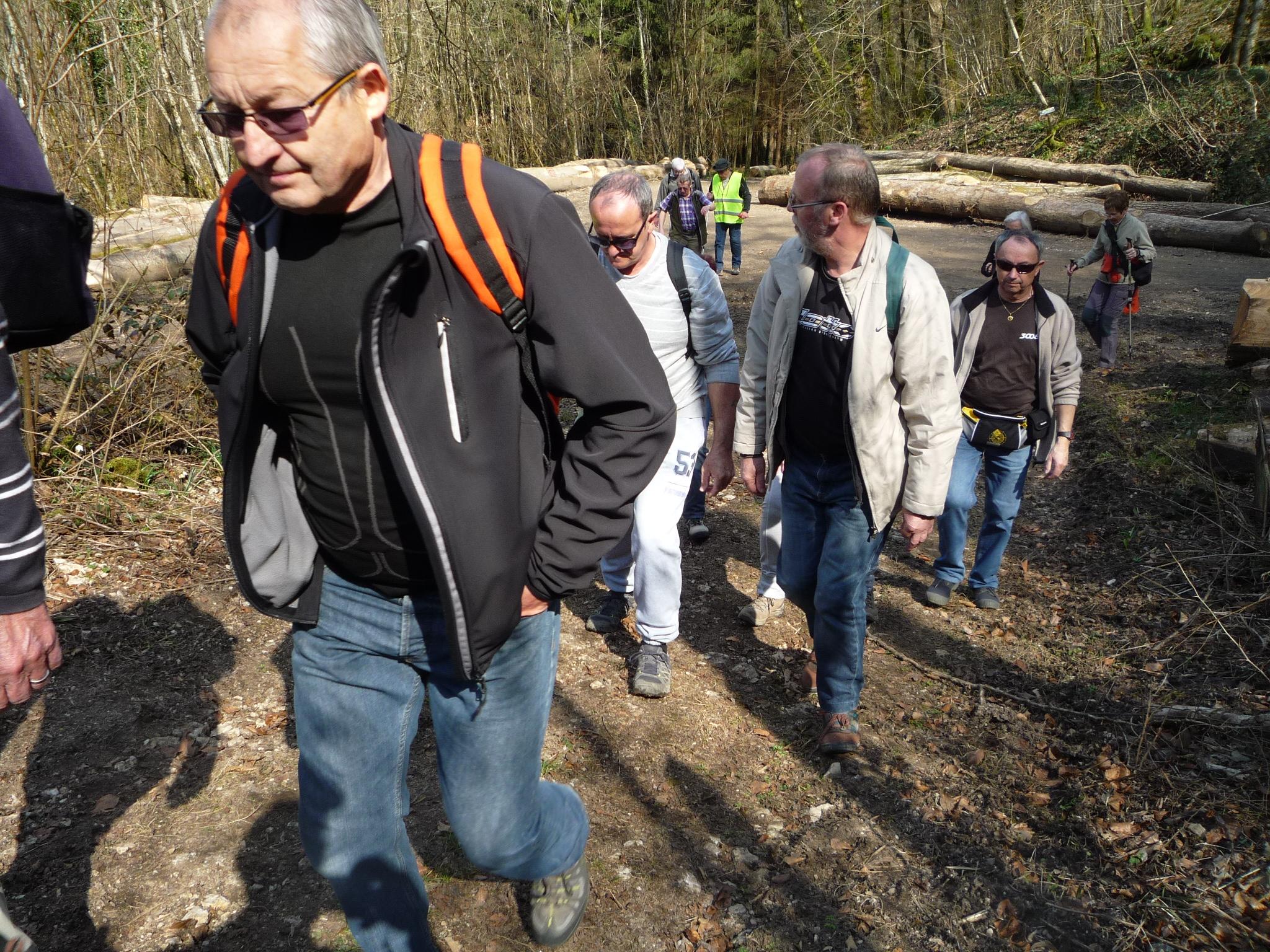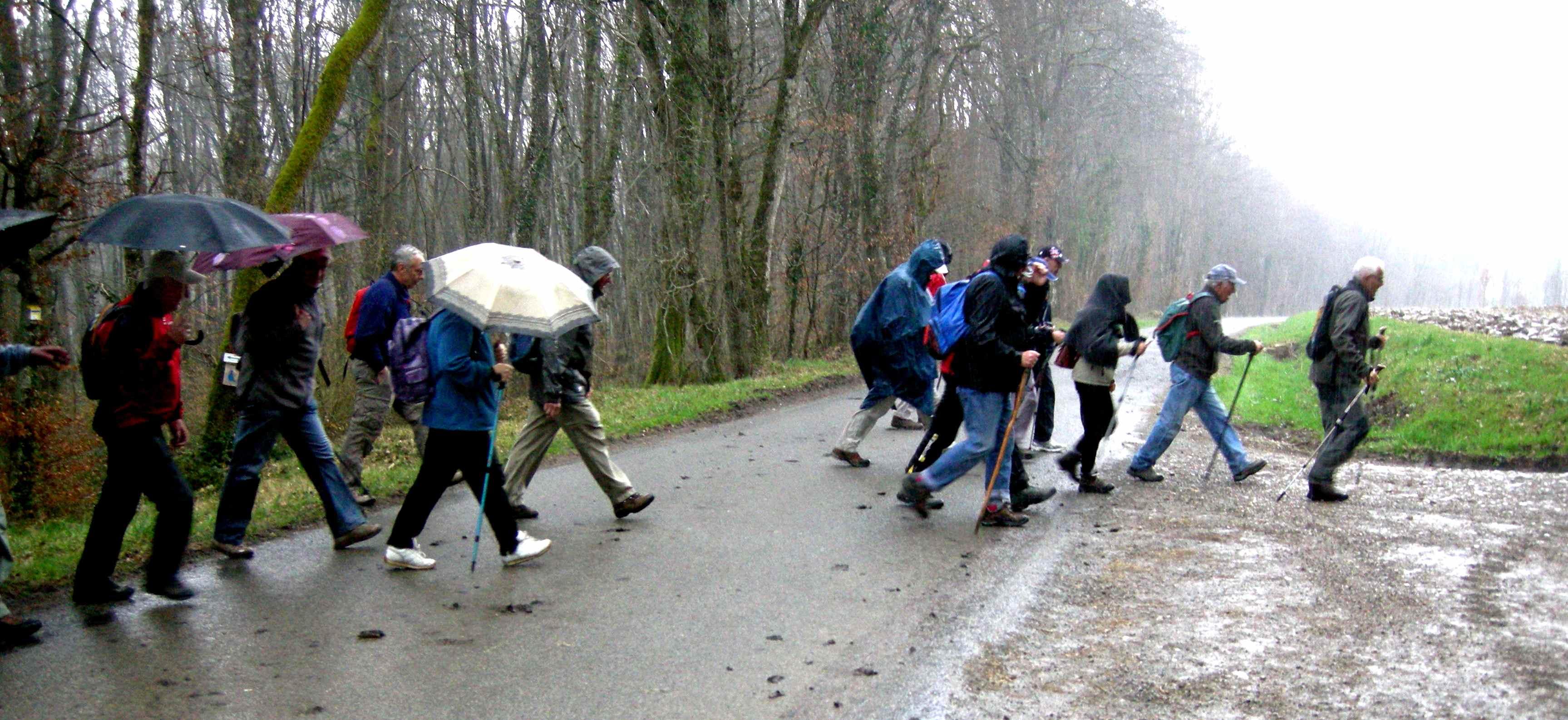 Une petite pause s’impose avant de nous engager sur un chemin pentu où les corps montent en température pour arriver en lisière de bois, toujours par beau temps. Nous poursuivons à découvert sur un plateau avant d’entrer à nouveau en forêt à un bon rythme. Sur notre droite, l’autoroute, pas très éloignée de nous, nous fait entendre le bruit permanent et soutenu du trafic. Le ciel se couvre et quelques gouttes nous laissent à penser que la fin de la journée sera humide. En effet, peu après, il faut se résoudre à passer les vêtements de pluie.
