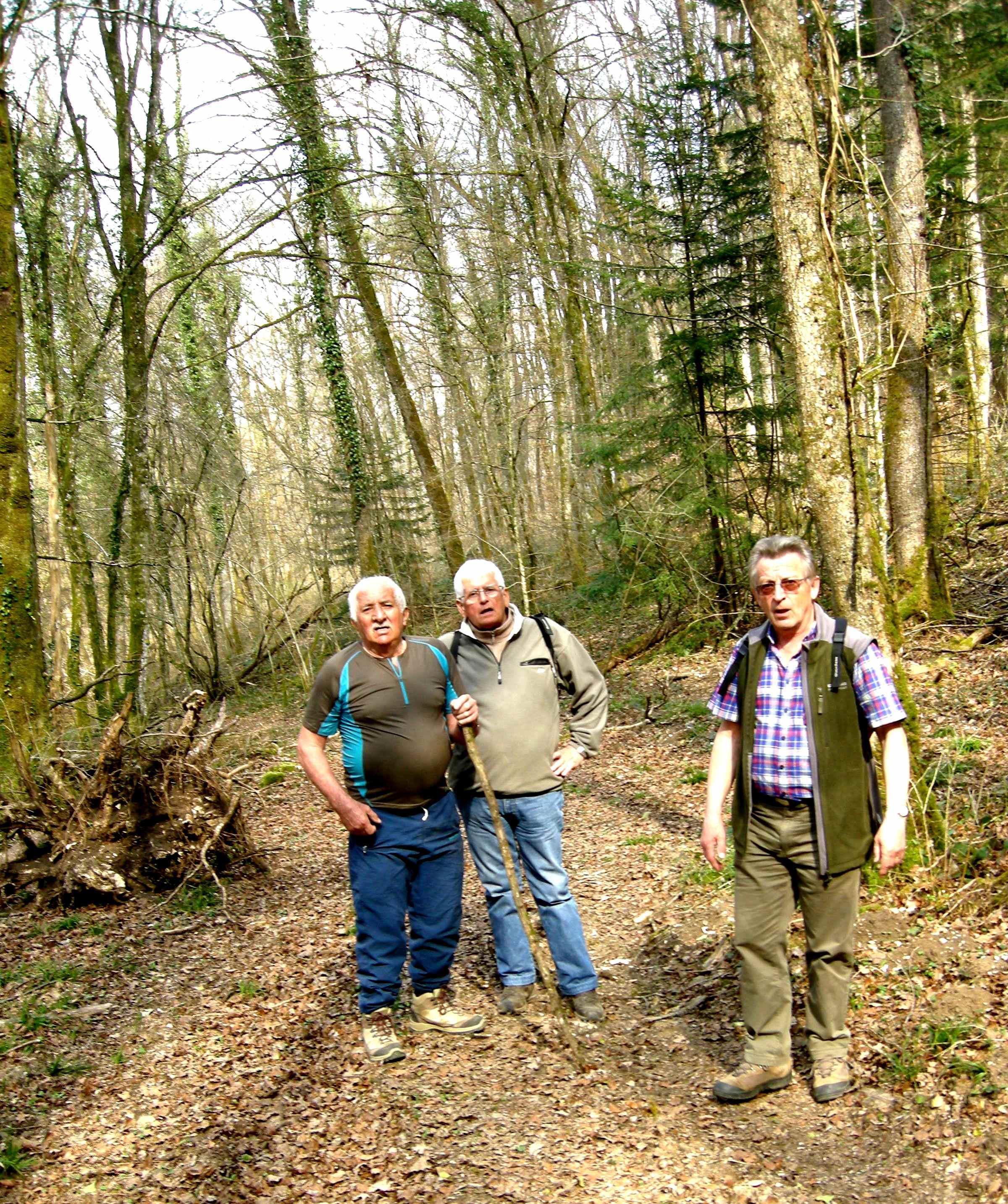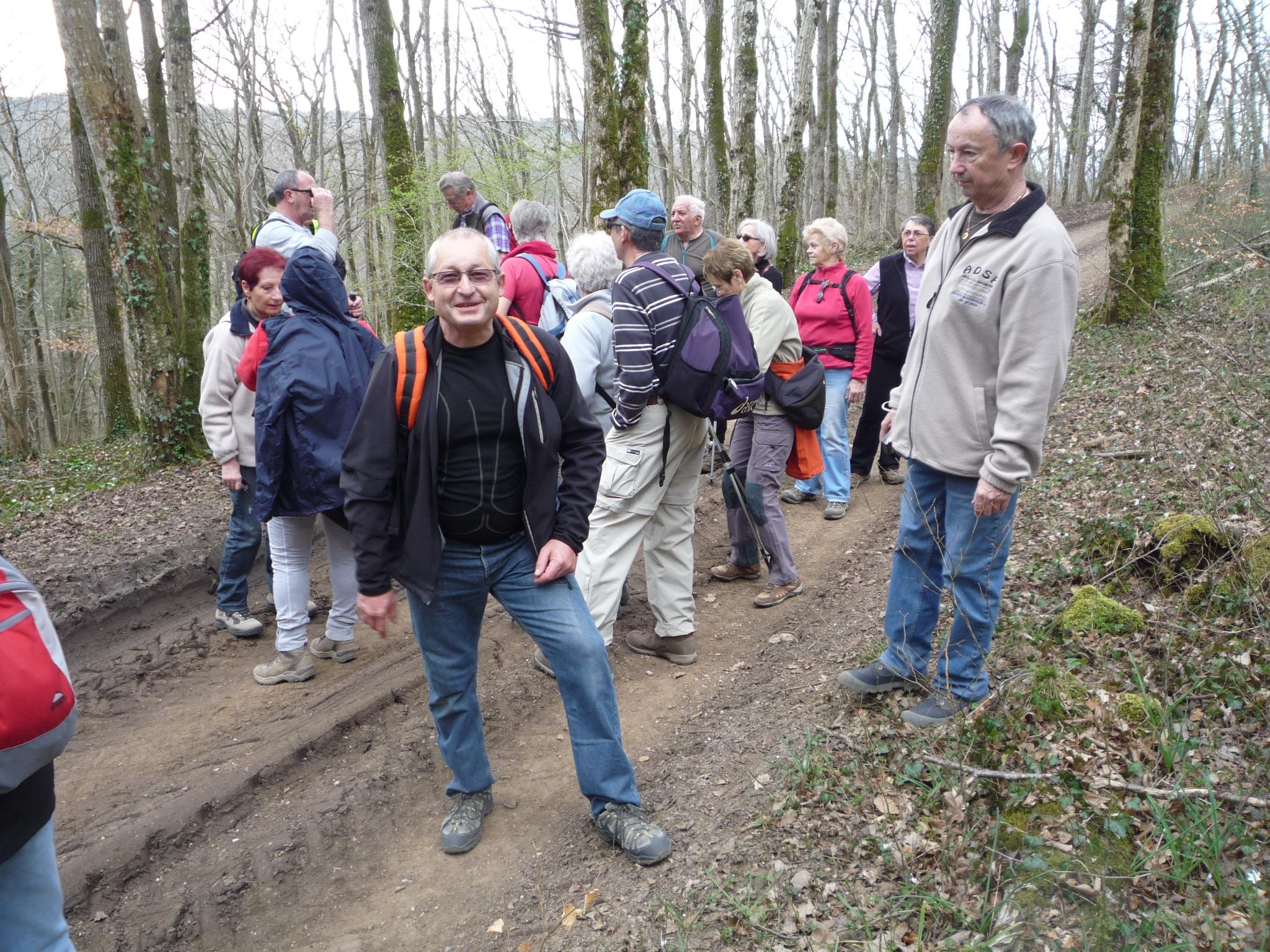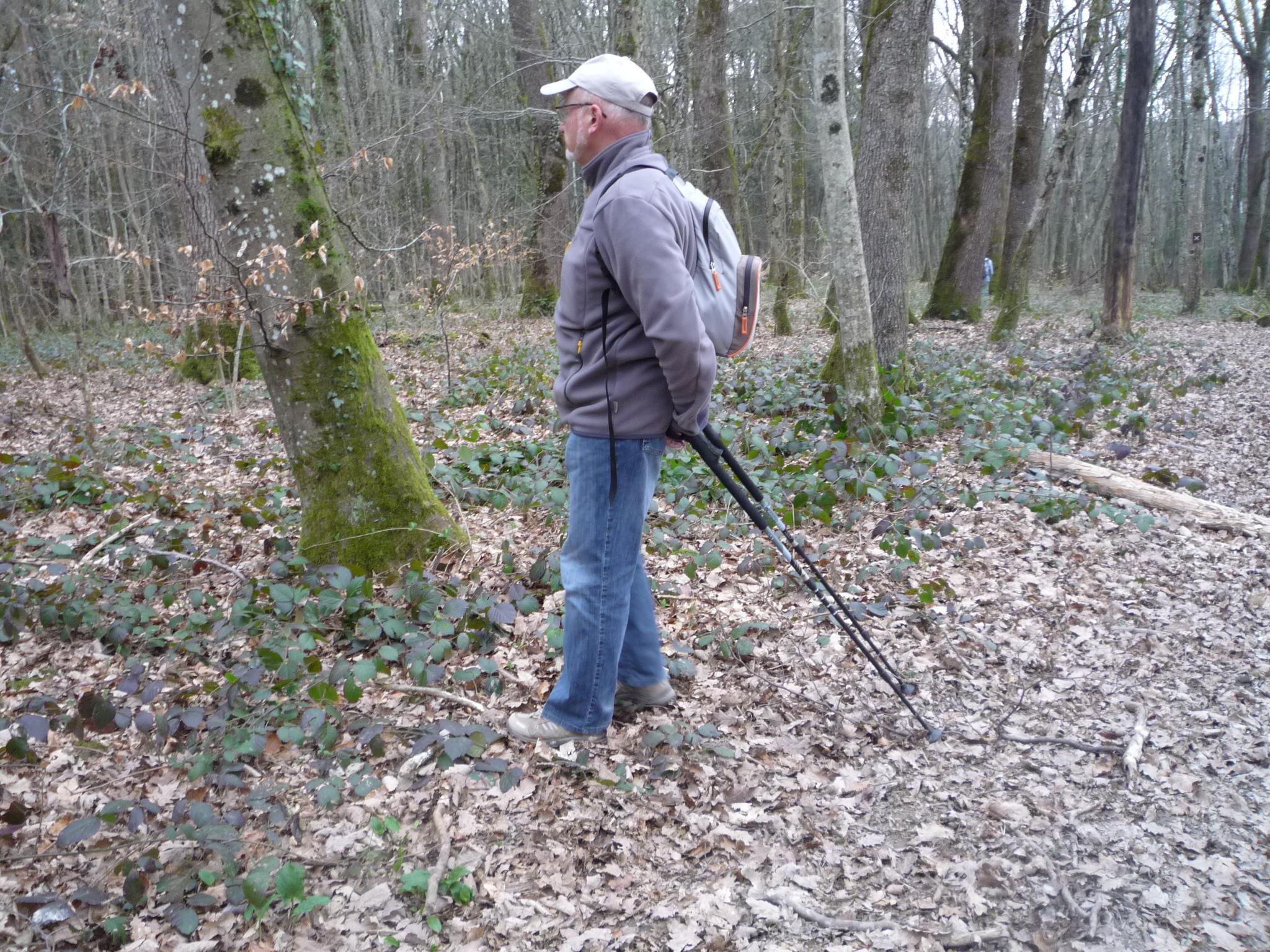 Une petite pause s’impose avant de nous engager sur un chemin pentu où les corps montent en température pour arriver en lisière de bois, toujours par beau temps. Nous poursuivons à découvert sur un plateau avant d’entrer à nouveau en forêt à un bon rythme. Sur notre droite, l’autoroute, pas très éloignée de nous, nous fait entendre le bruit permanent et soutenu du trafic. Le ciel se couvre et quelques gouttes nous laissent à penser que la fin de la journée sera humide. En effet, peu après, il faut se résoudre à passer les vêtements de pluie.