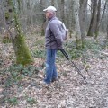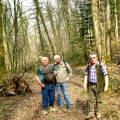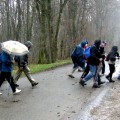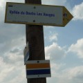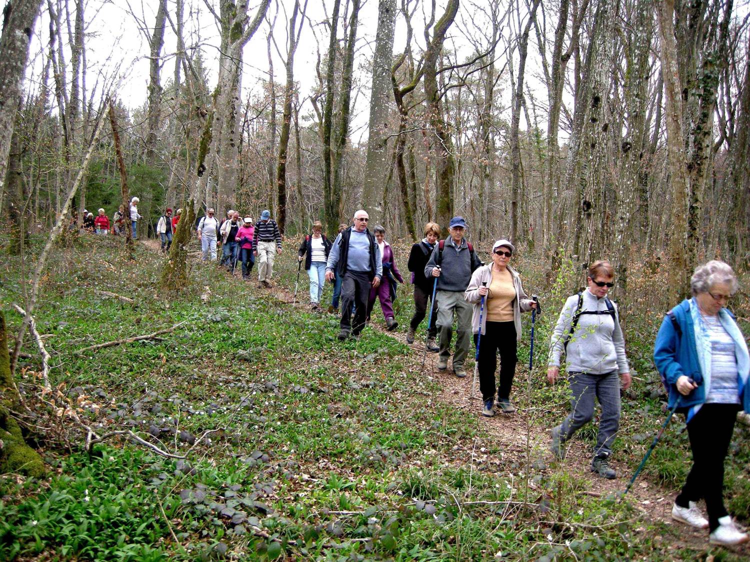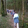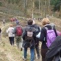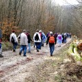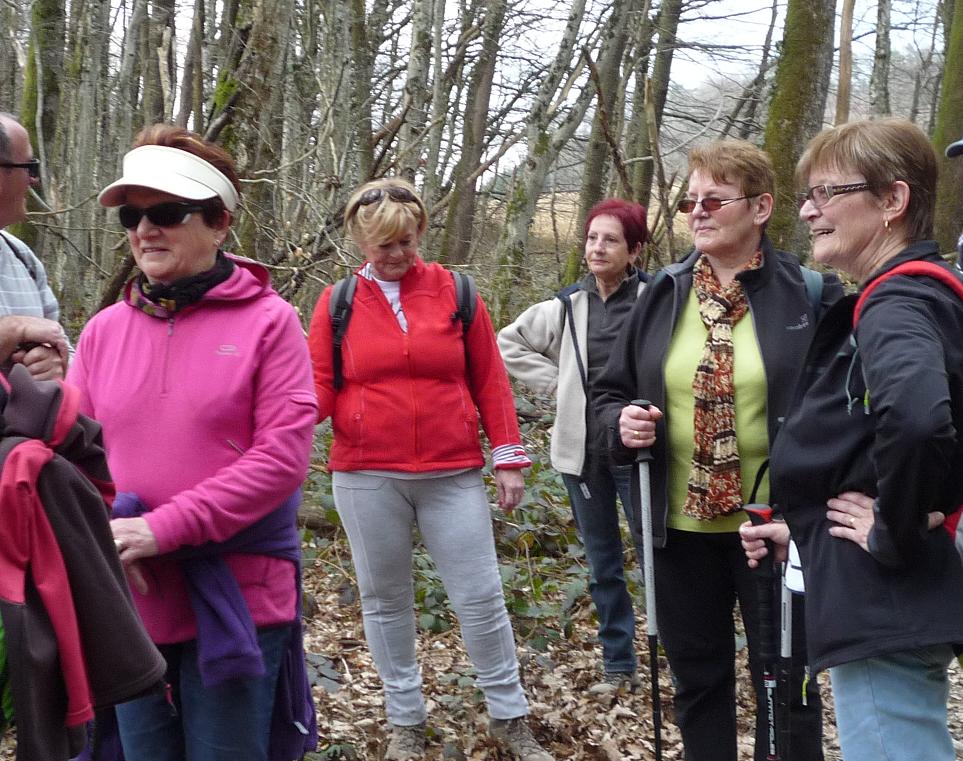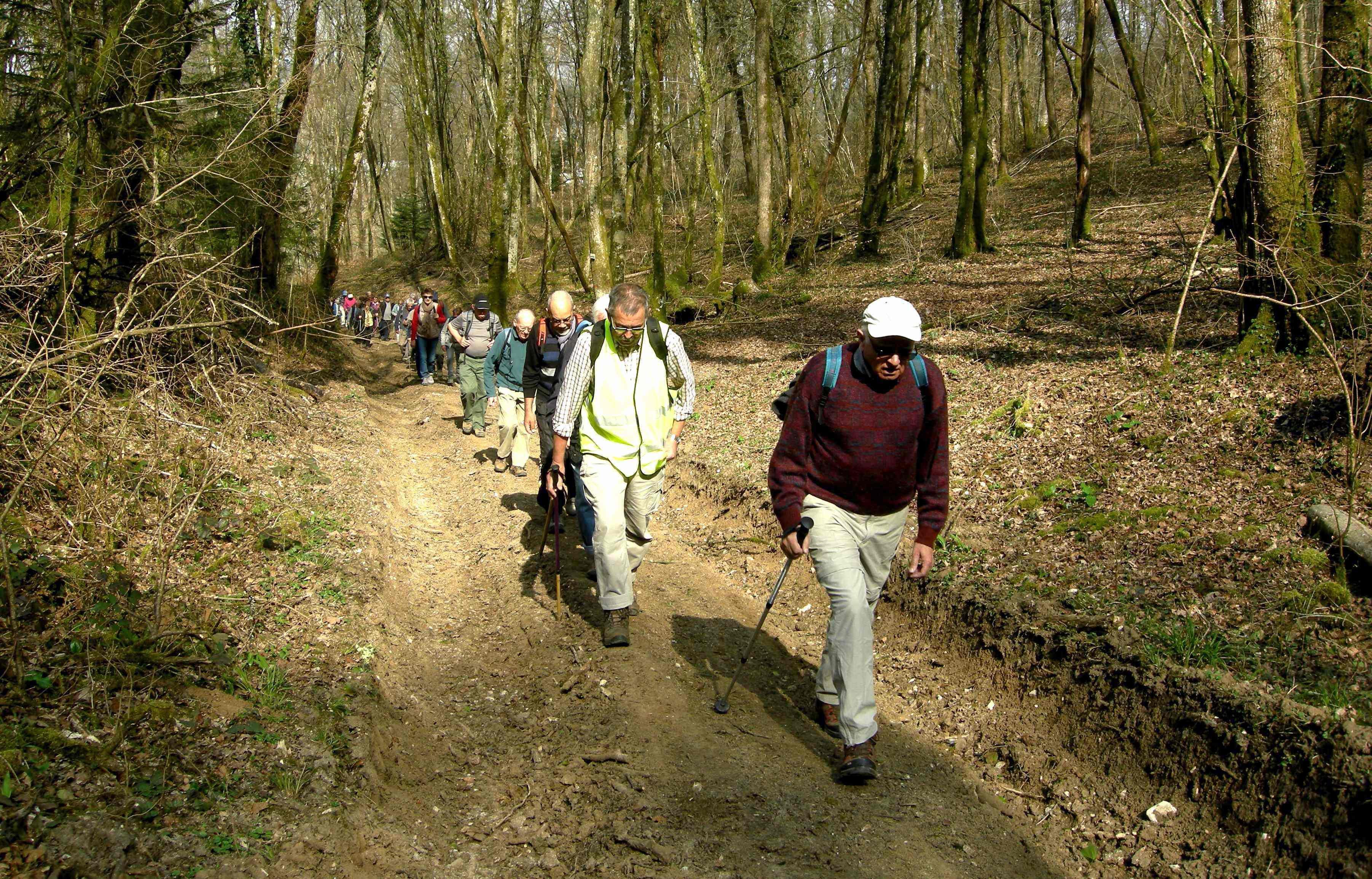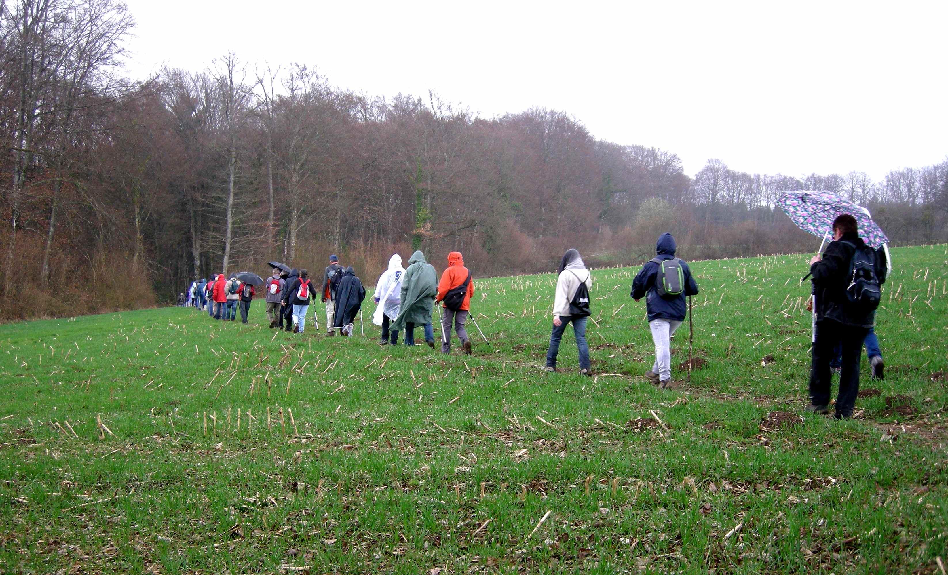 Une petite pause s’impose avant de nous engager sur un chemin pentu où les corps montent en température pour arriver en lisière de bois, toujours par beau temps. Nous poursuivons à découvert sur un plateau avant d’entrer à nouveau en forêt à un bon rythme. Sur notre droite, l’autoroute, pas très éloignée de nous, nous fait entendre le bruit permanent et soutenu du trafic. Le ciel se couvre et quelques gouttes nous laissent à penser que la fin de la journée sera humide. En effet, peu après, il faut se résoudre à passer les vêtements de pluie.