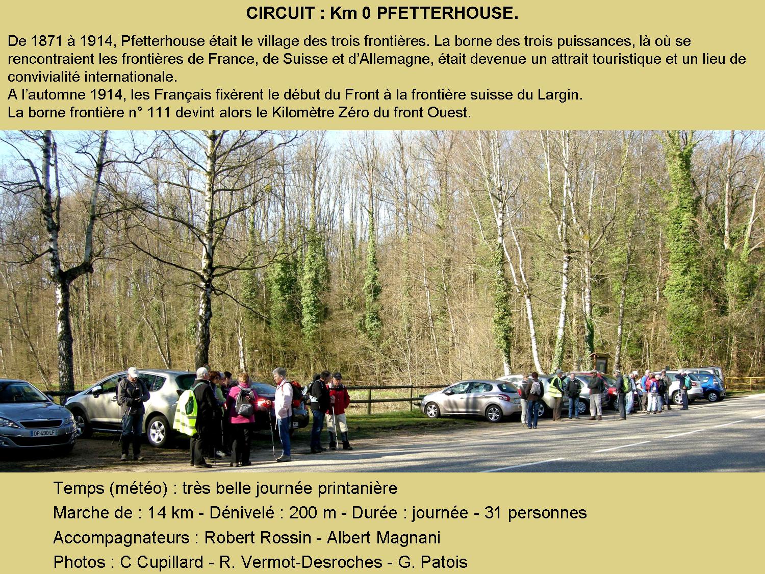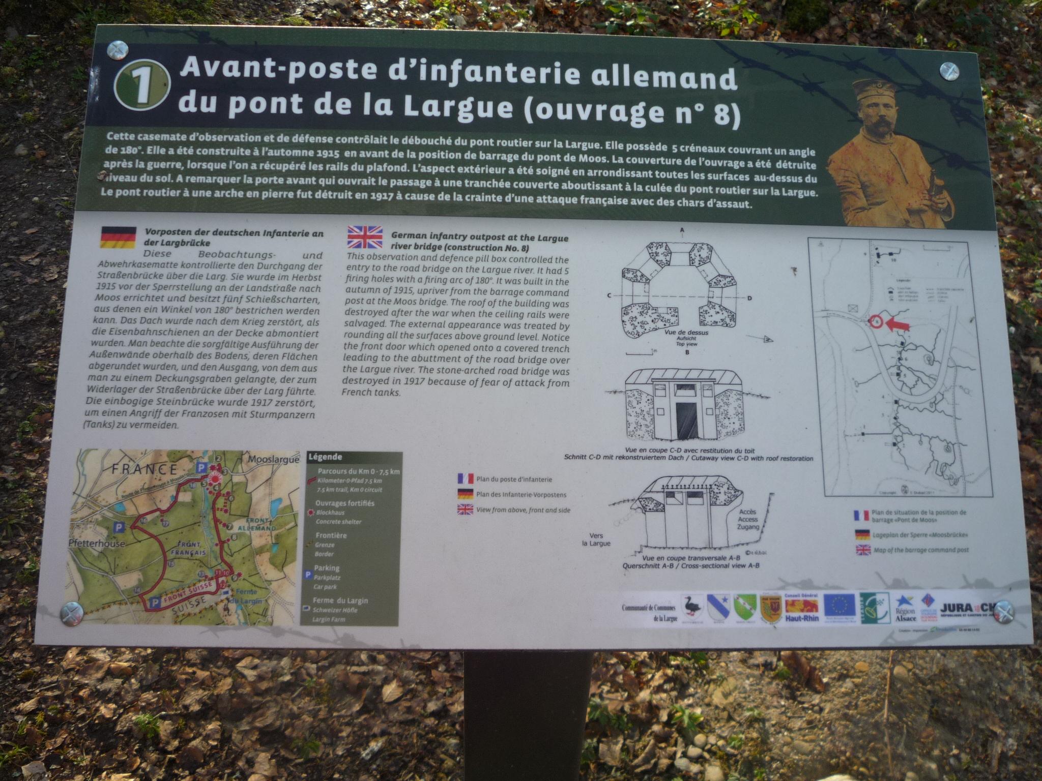 Au niveau de Pfetterhouse, la ligne de front qui commence ici passe par l’ouest d’Altkirch, Cernay et rejoint le Vieil Armand. A noter que le voisin, Thann, restera français. Le KM 0 débute à la borne 111 au niveau du saillant du Largin et se termine à la mer du Nord à 750 km. Cette pointe de territoire suisse pénétrant en Alsace est occupée par la ferme du Largin. Le saillant dénommé « bec de canard » fut occupé par l’armée suisse, tout au long de la guerre pour surveiller les deux belligérants. Une casemate de bois et de terre s’élevait à la borne frontière. Le Génie suisse a reconstruit la casemate à l’identique en 2012. Il érige une passerelle sur la Largue pour y accéder. Sur la rive droite de la Largue, l’armée allemande établira une série de bunkers à partir de 1916. La ligne de défense était constituée de 3 lignes : la première en contact avec les troupes françaises, les 2 autres sont espacées de 1 à 2 km en arrière. Les bunkers construits sont des nids à mitrailleuses et à canons, des abris pour les hommes et des dépôts de munitions.