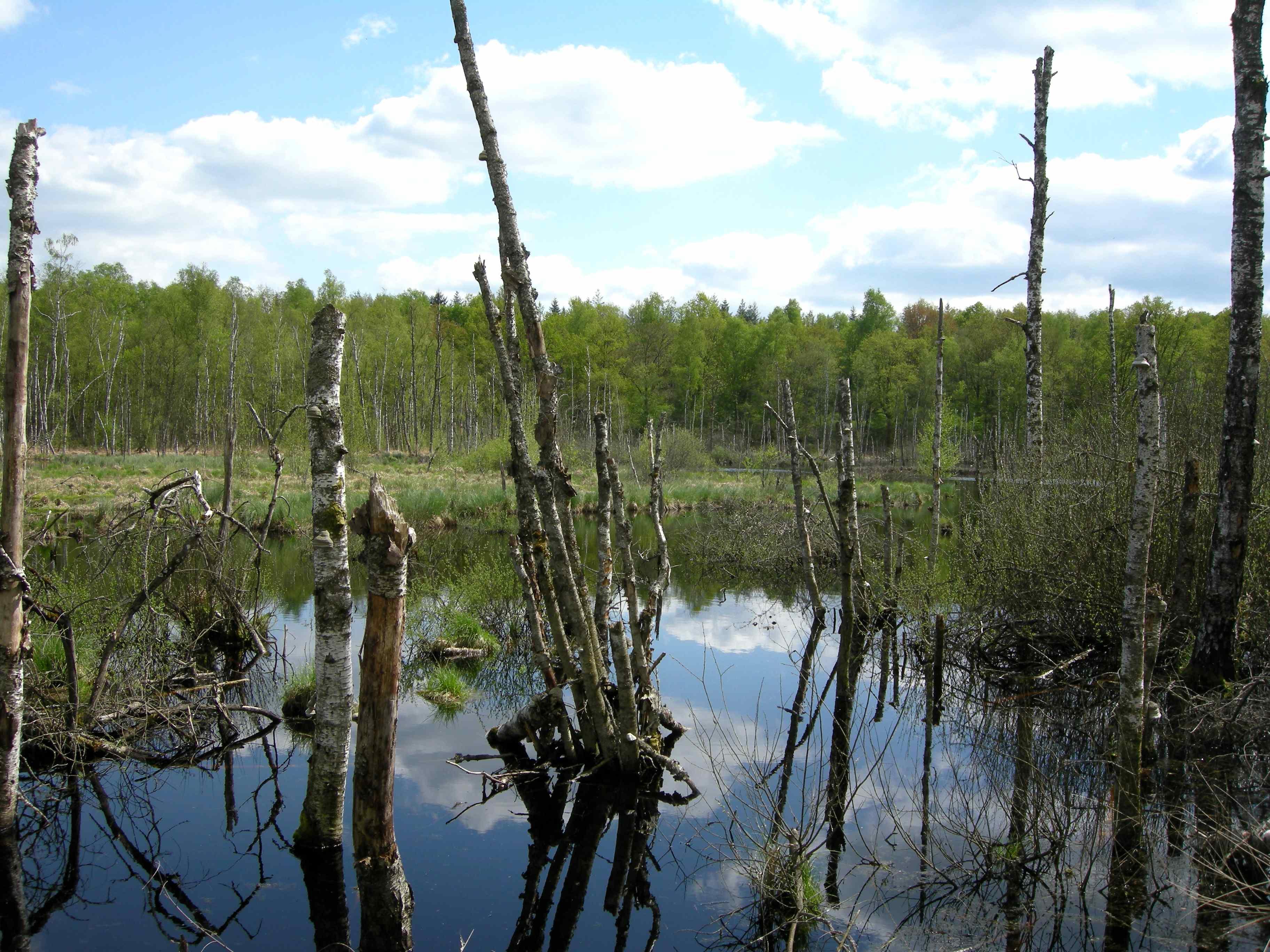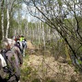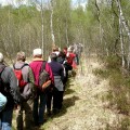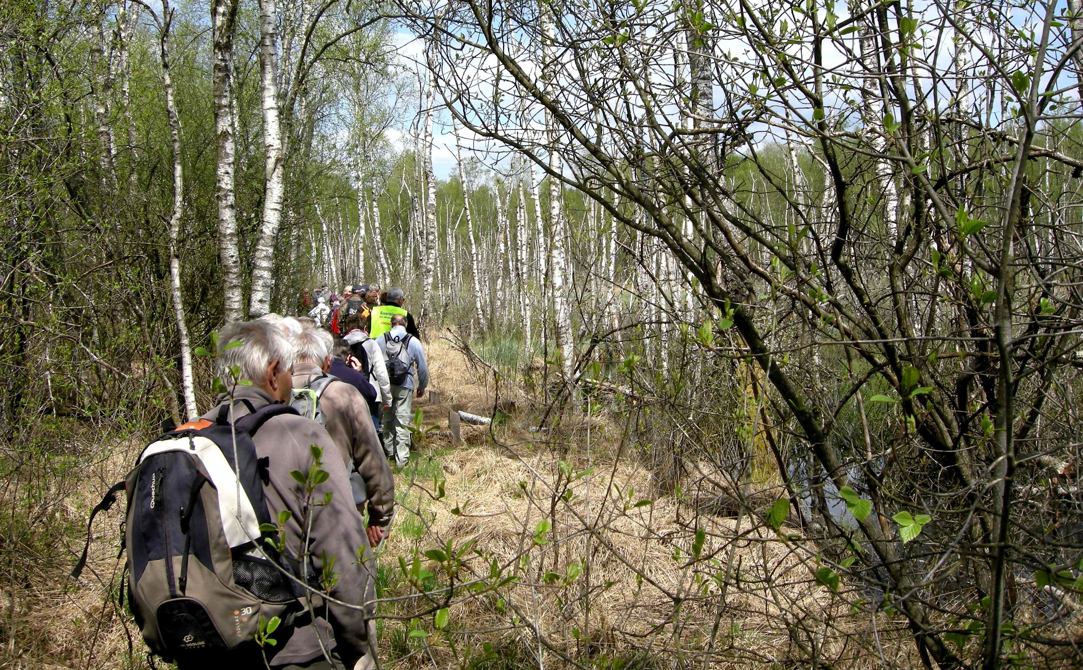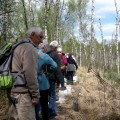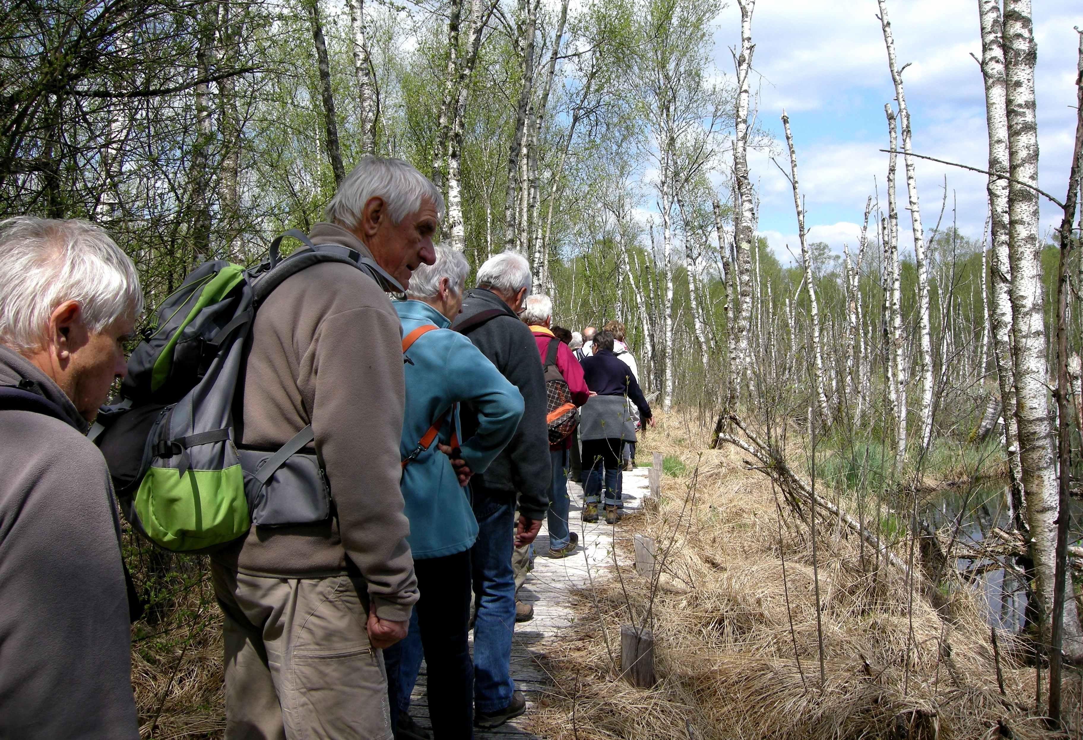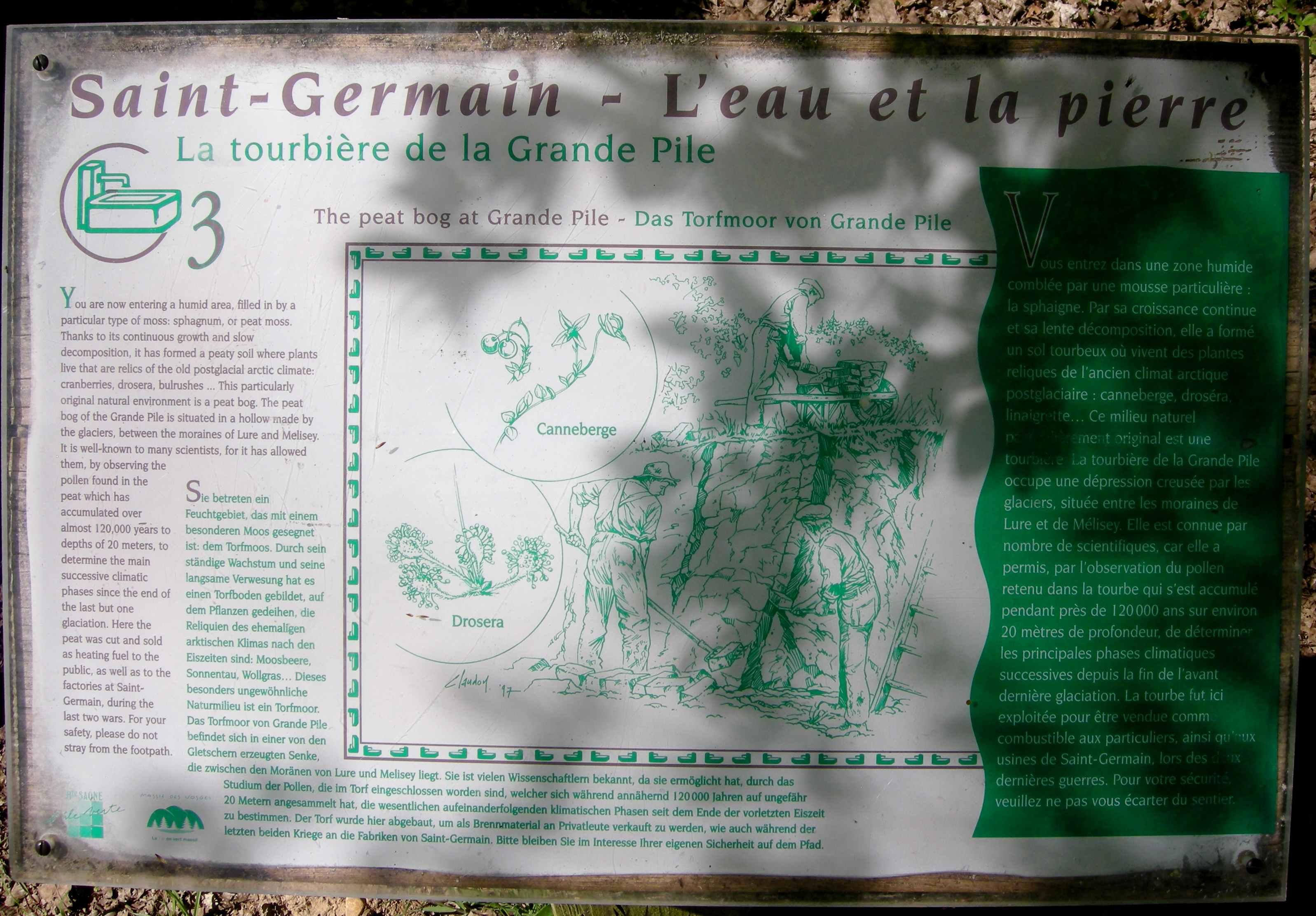 Nous découvrons rapidement la curiosité de ce parcours à 14h30 : la tourbière de la Grande Pile, zone humide et paysage fantomatique de bouleaux brisés. Elle se traverse en file indienne sur un sentier aménagé, avec des ponts de caillebotis pour épargner la nature et éviter l’enlisement. La lecture des panneaux explicatifs permet de s’informer sur l’origine, les particularités et l’exploitation anecdotique de cette tourbière.