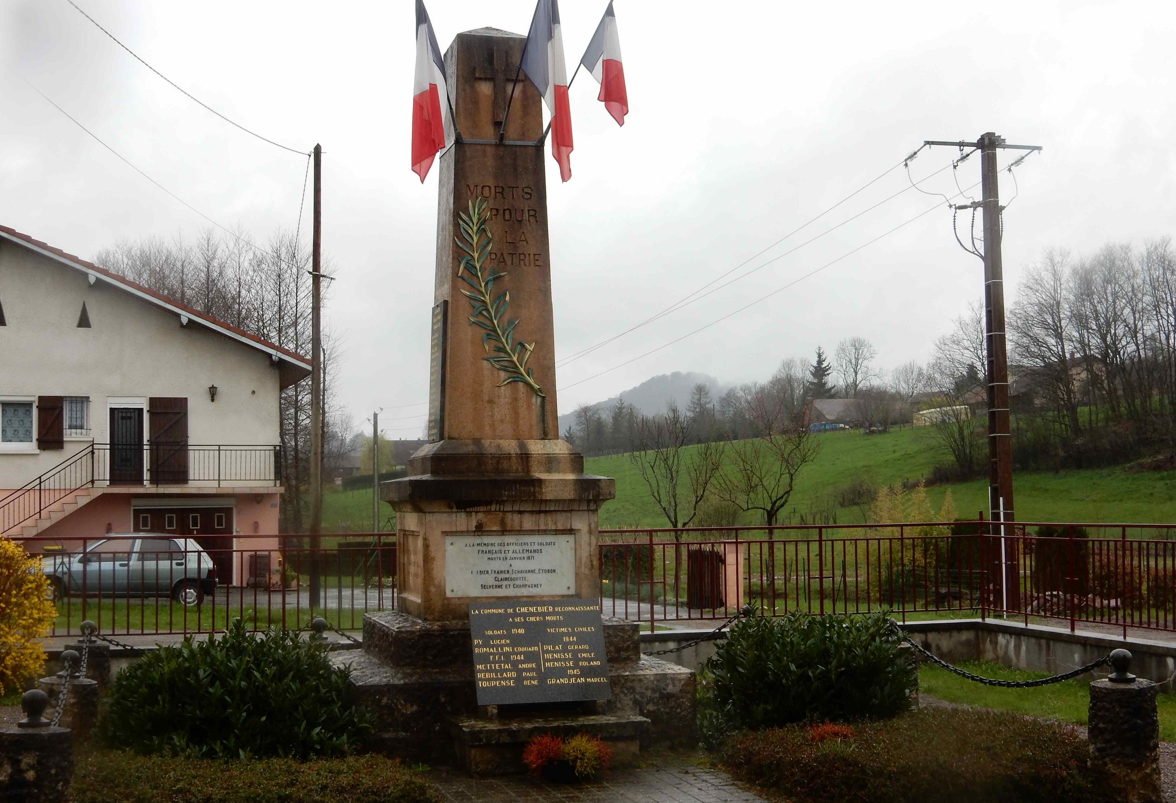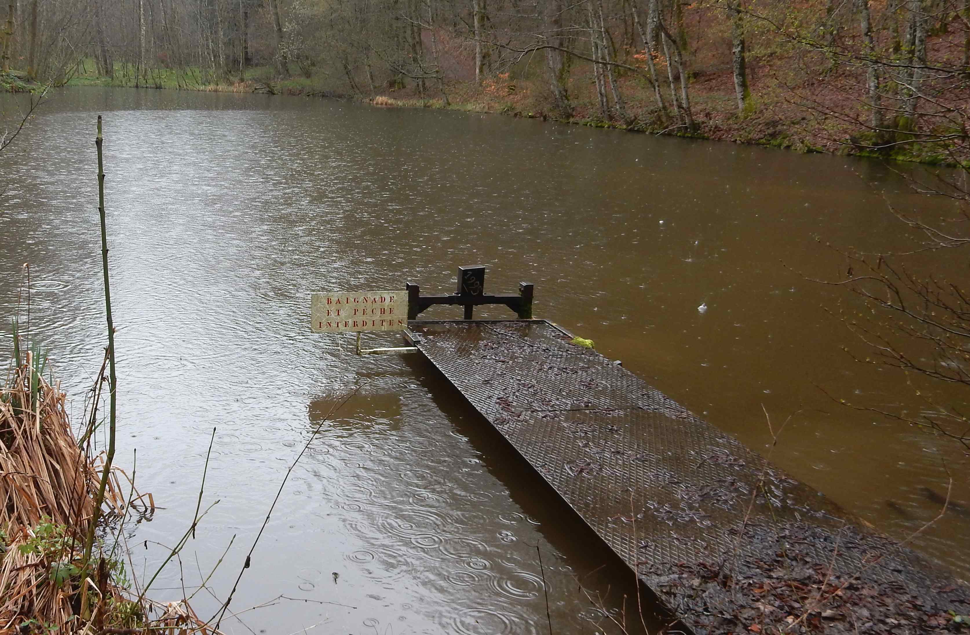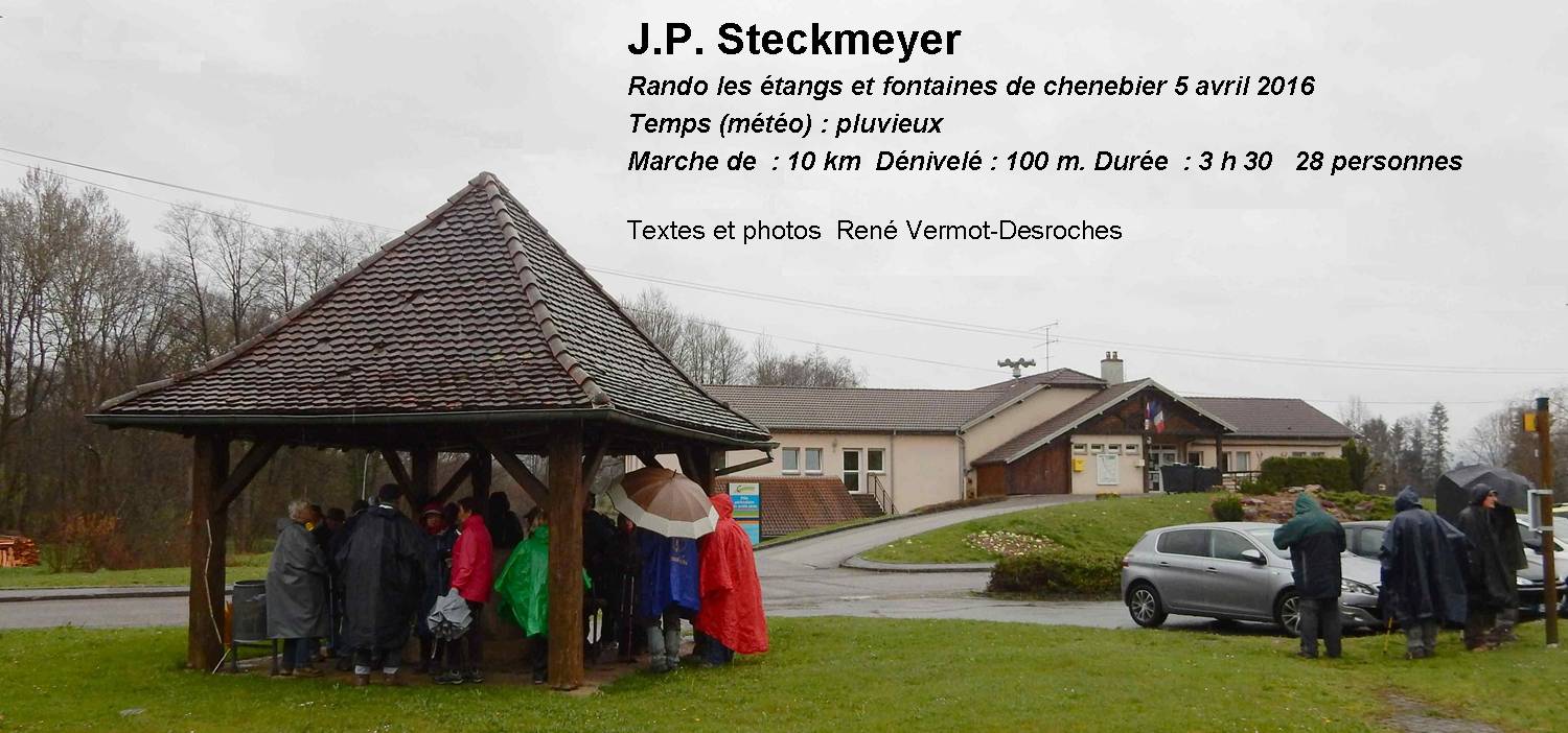Après nous être équipés de protections contre la pluie (car il a plu !!! beaucoup), nous sommes partis de la mairie de Chenebier sur des chemins détrempés, en suivant le balisage de ronds jaunes. Ainsi, nous avons pu voir quelques fontaines originales et de nombreux étangs.
