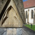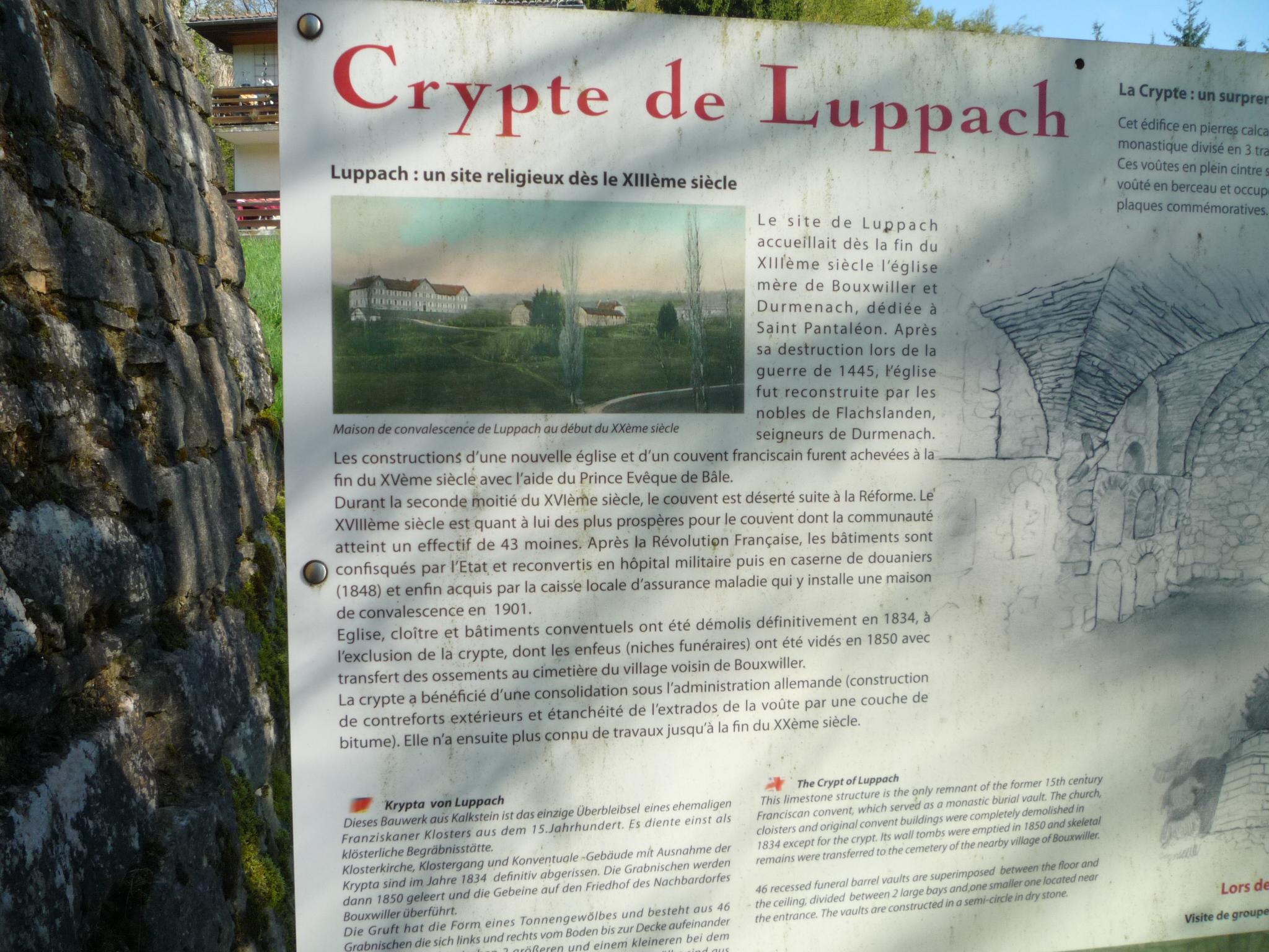 La randonnée commence (et nous ne faisons que passer) au centre médical de Luppach. Il peut accueillir 35 résidents nécessitant un accompagnement et une aide au quotidien dans un lieu de vie permanent et sécurisé. L’origine de ce bâtiment remonte au 13° siècle : c’était l’église des paroisses de Bouxwiller et Durmenach. En 1487 elle se transforme en couvent, sous l’église la crypte servait de caveau funéraire aux moines. Elle est construite en pierres sèches, la voûte est située à 4.4 m de hauteur, longue de 19 m et 10 m de large Elle compte 46 niches funéraires. En 1789, suppression du couvent, en 1834, démolition de l’église et du cloître. Le caveau, seul vestige du couvent, est restauré en 1904. Cet ensemble fait partie de la commune de Bouxwiller (450 habitants).