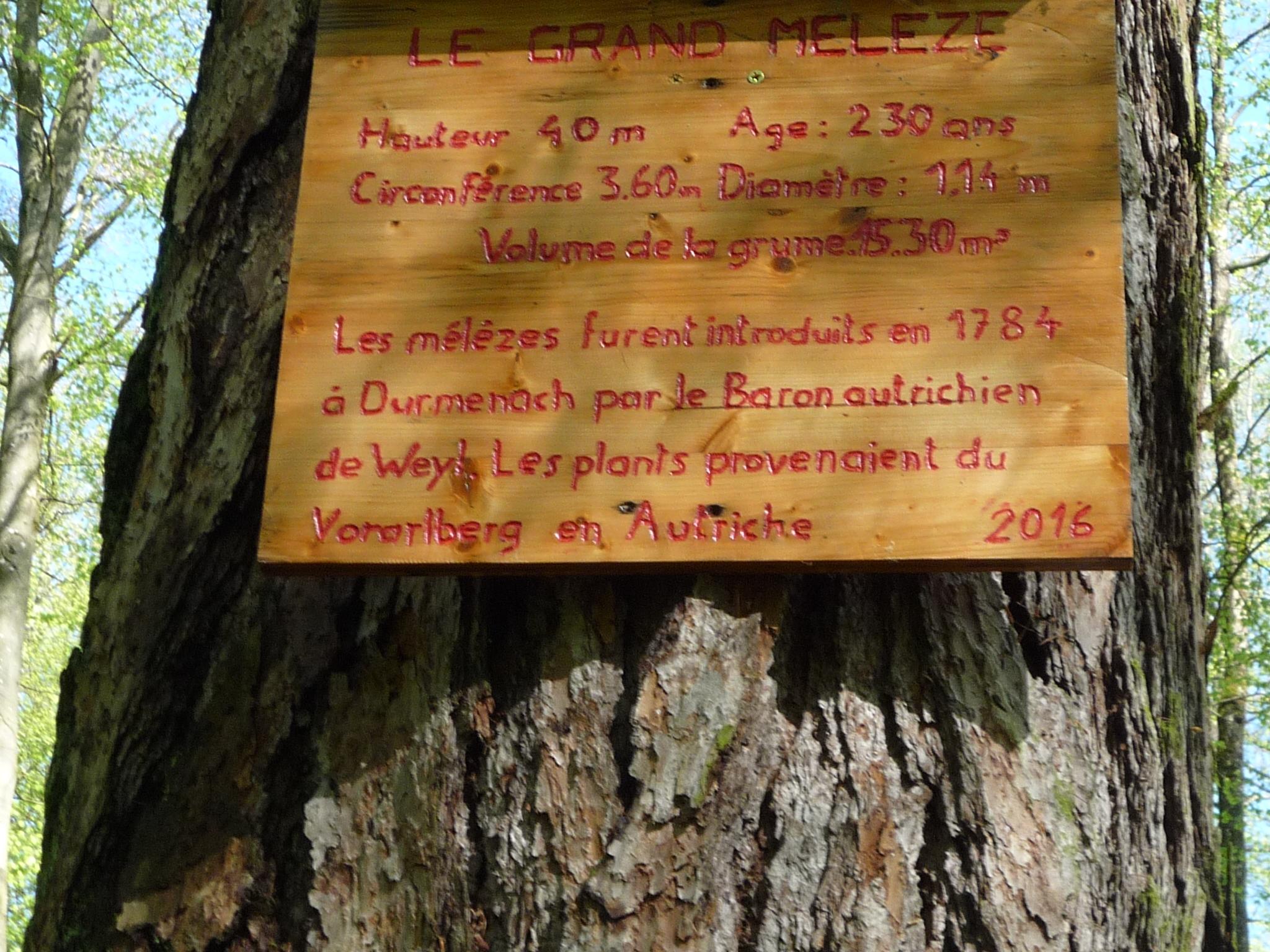Après un passage en forêt, le prochain village est Durmenach (870 habitants). L’actuel foyer catholique du village fut autrefois une synagogue ravagée deux fois par les flammes. Le village fut, à partir du 15e siècle, une importante agglomération juive : 650 juifs sur 1 000 habitants. La rue du 29 février commémore la journée des émeutes antisémites du 29 février 1848. Après 1940, la plupart des juifs étaient partis ou déportés et ne sont plus revenus après la libération. La forêt a deux particularités : un mélèze géant d’Autriche planté en 1784 domine la forêt de ses 40 m de hauteur et un chêne d’environ 6 m de diamètre donc d’un bel âge également.