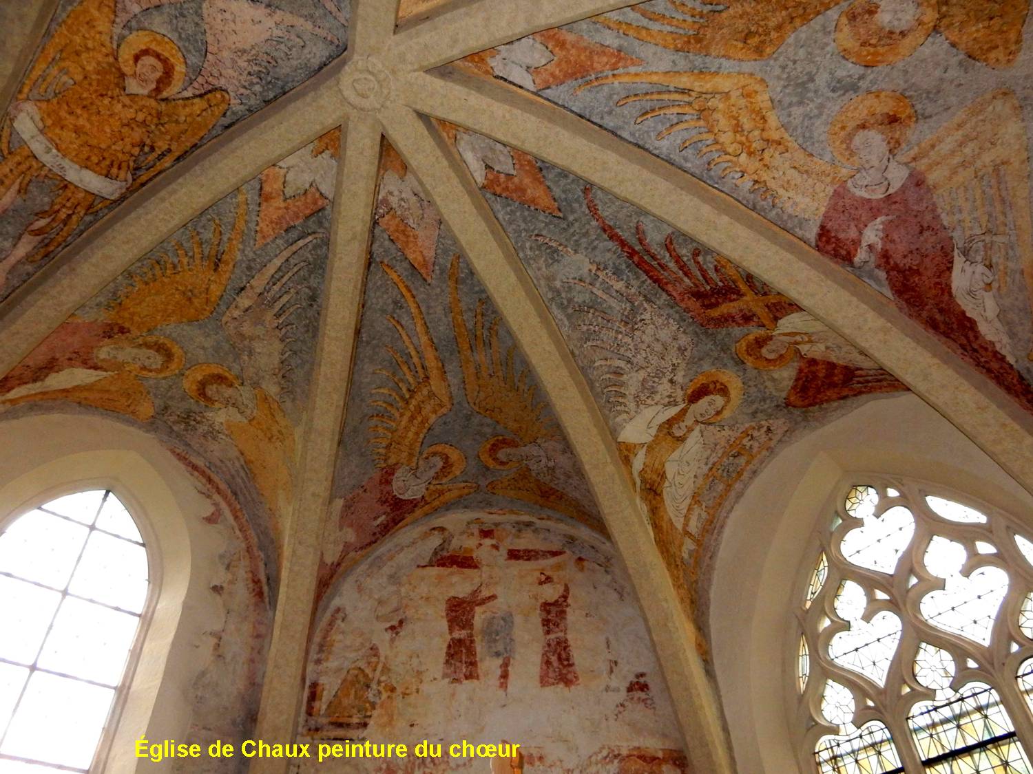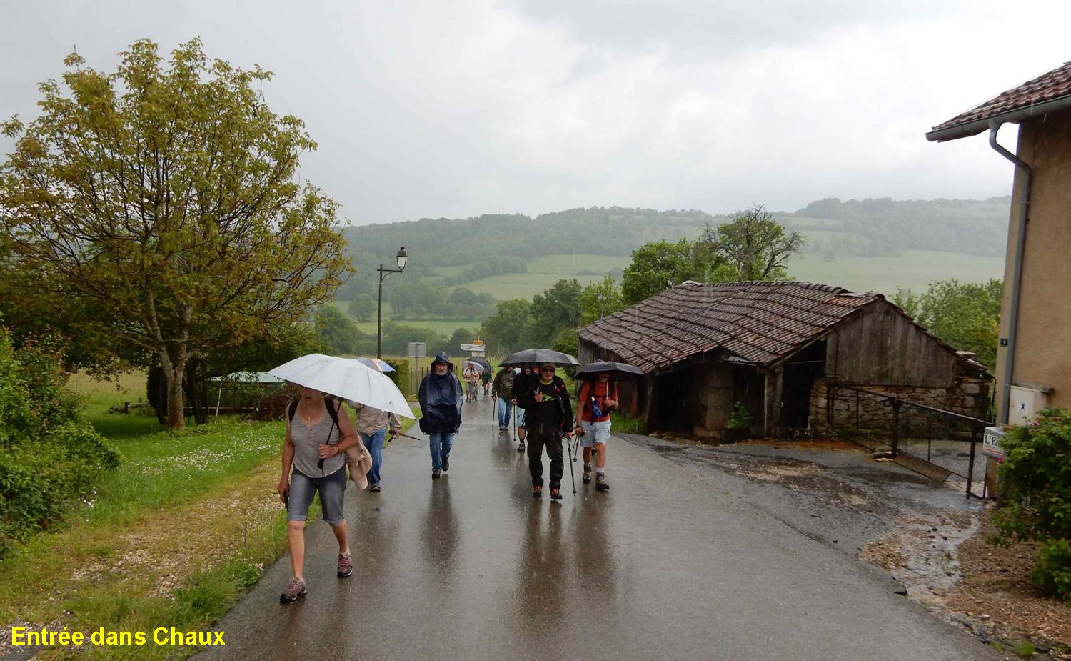 Départ pour Chaux les Chatillon et son église dont le porche nous a abrités d’un violent orage. Cette église, avec ses fresques ressurgies du passé à la faveur d’une restauration récente, renferme également des reliques de Saint Ligier.
