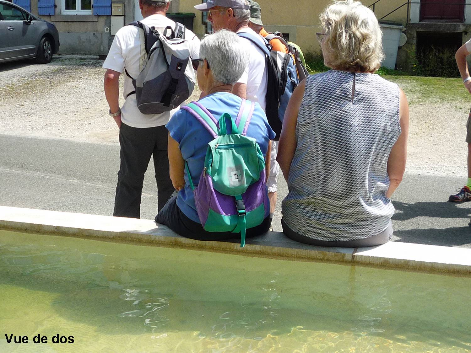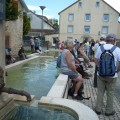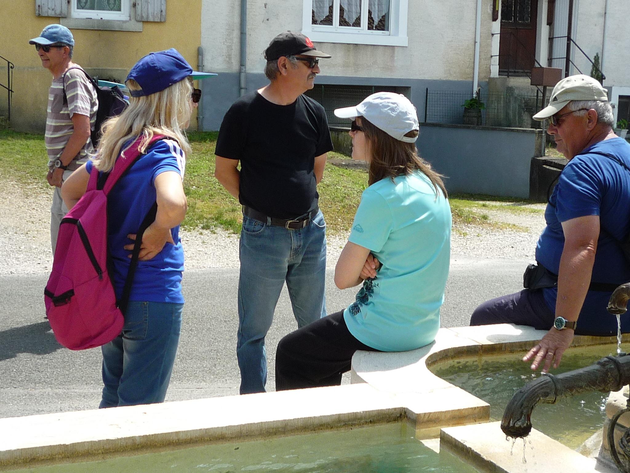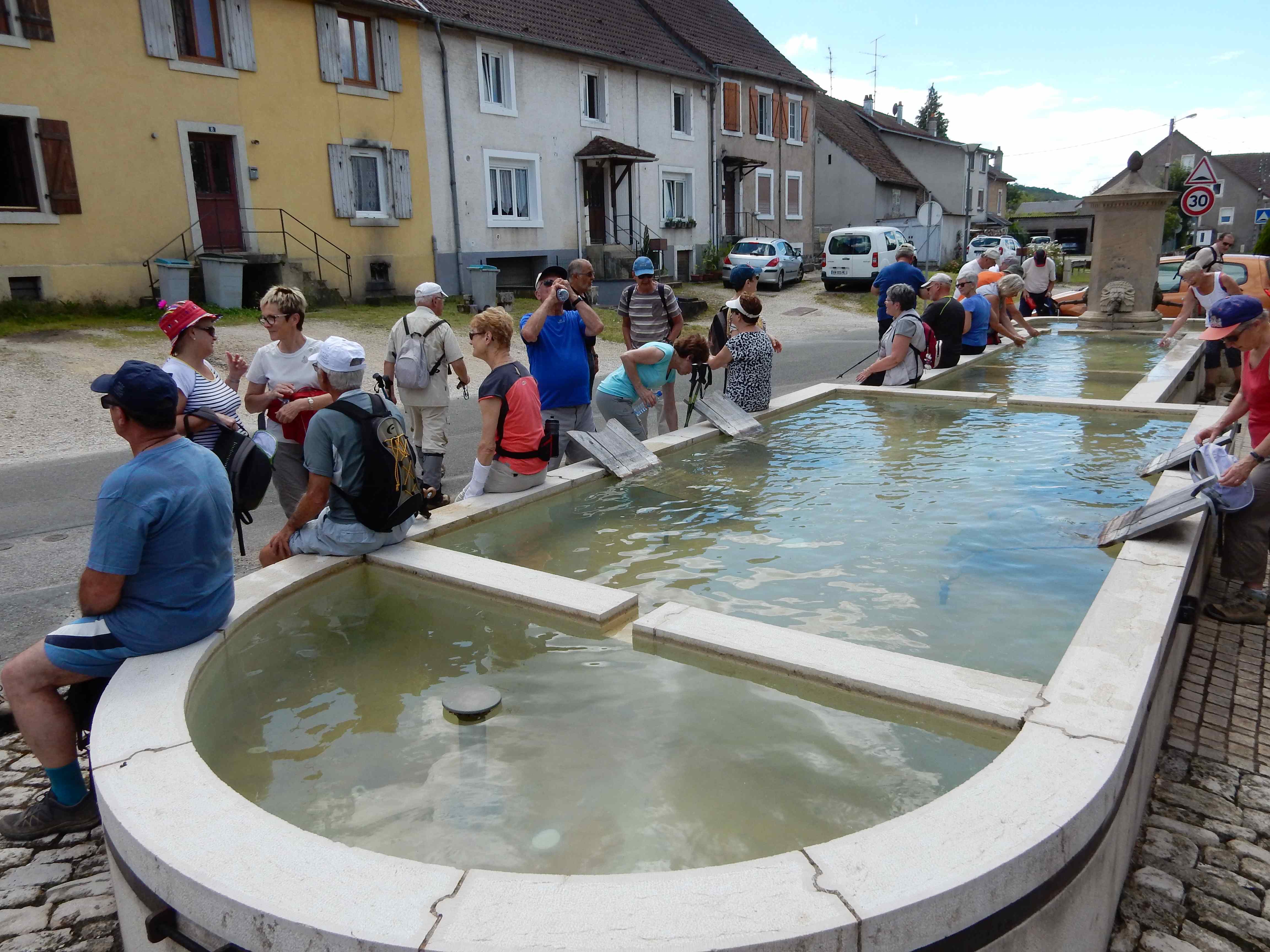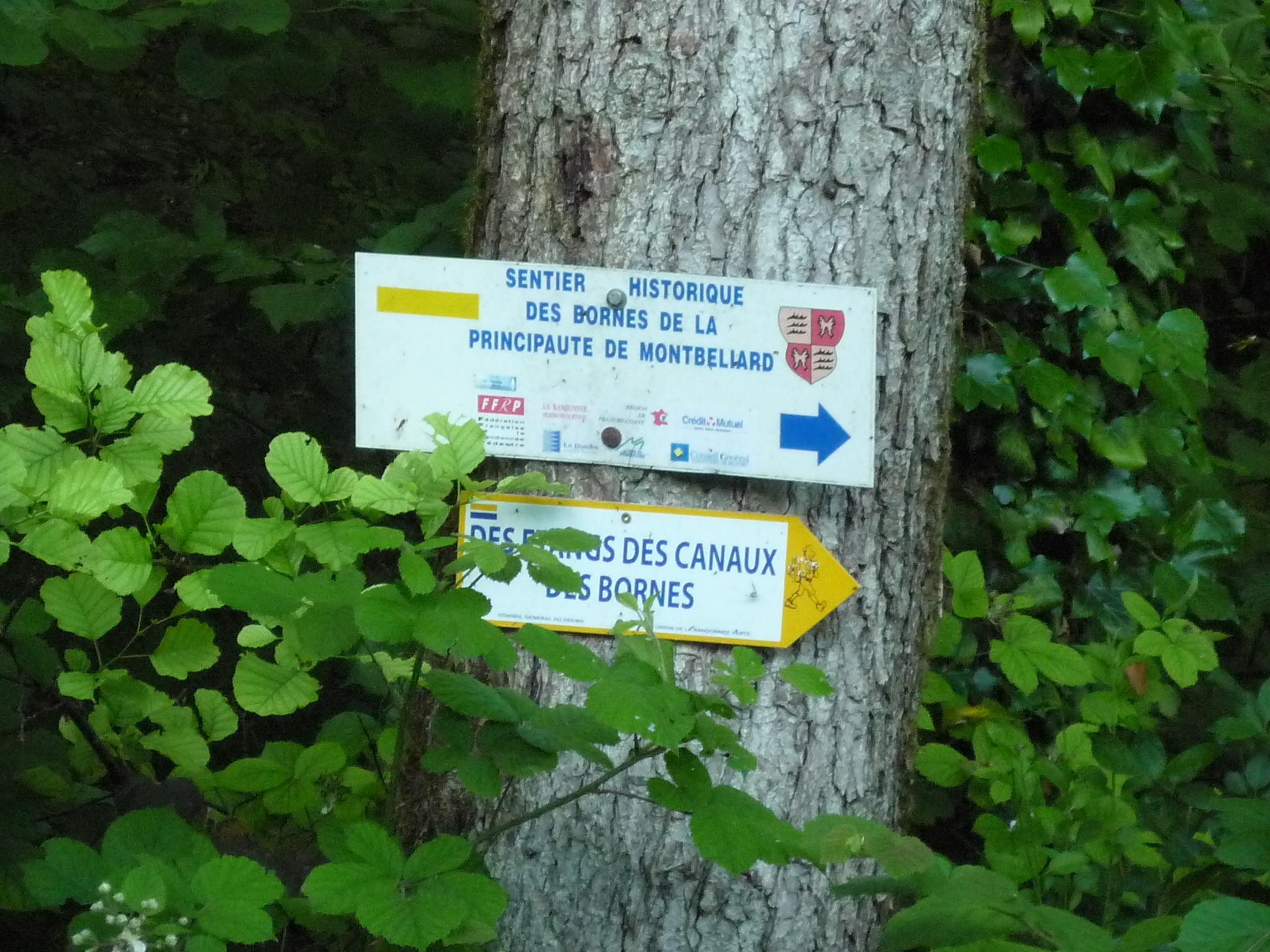 Le rythme est assez soutenu, un arrêt au pont situé au confluent de l’Allan, du canal et de la Bourbeuse avant Bourogne s’impose. Sur une suggestion de Claude C., nous faisons un détour jusqu’à la source pétrifiante, histoire d’ajouter quelques mètres aux podomètres. Nous n’aurons pas le temps de vérifier les effets de cette eau. Nous nous contenterons des explications. Après les canaux, on attaque le chemin des bornes, une série de côtes en forêt avec quelques belles bornes du XVIIIème siècle qui marquaient, avant 1793, la frontière entre la Principauté de Montbéliard et le Royaume de France.