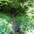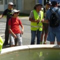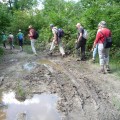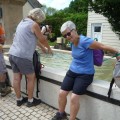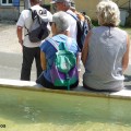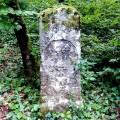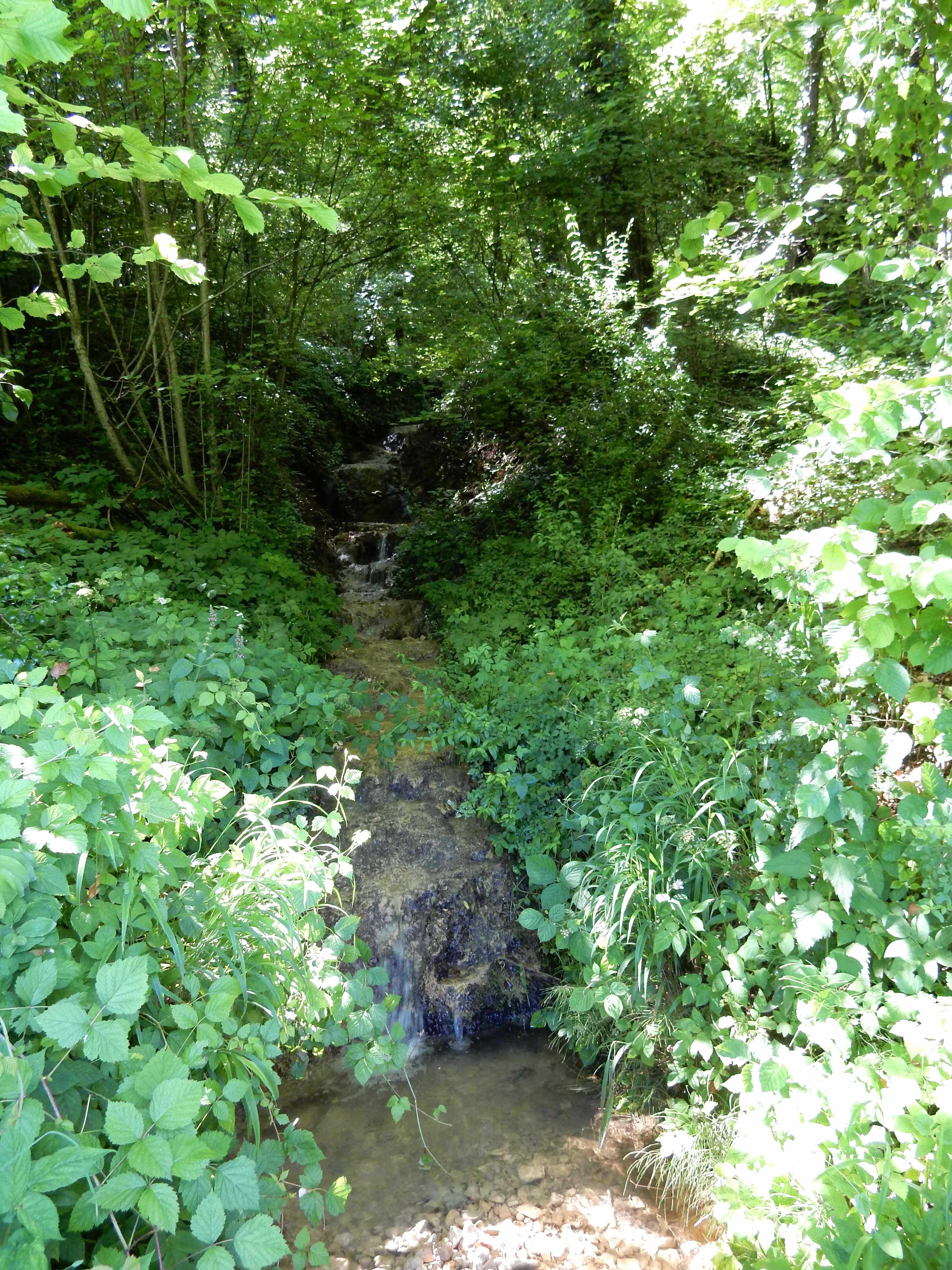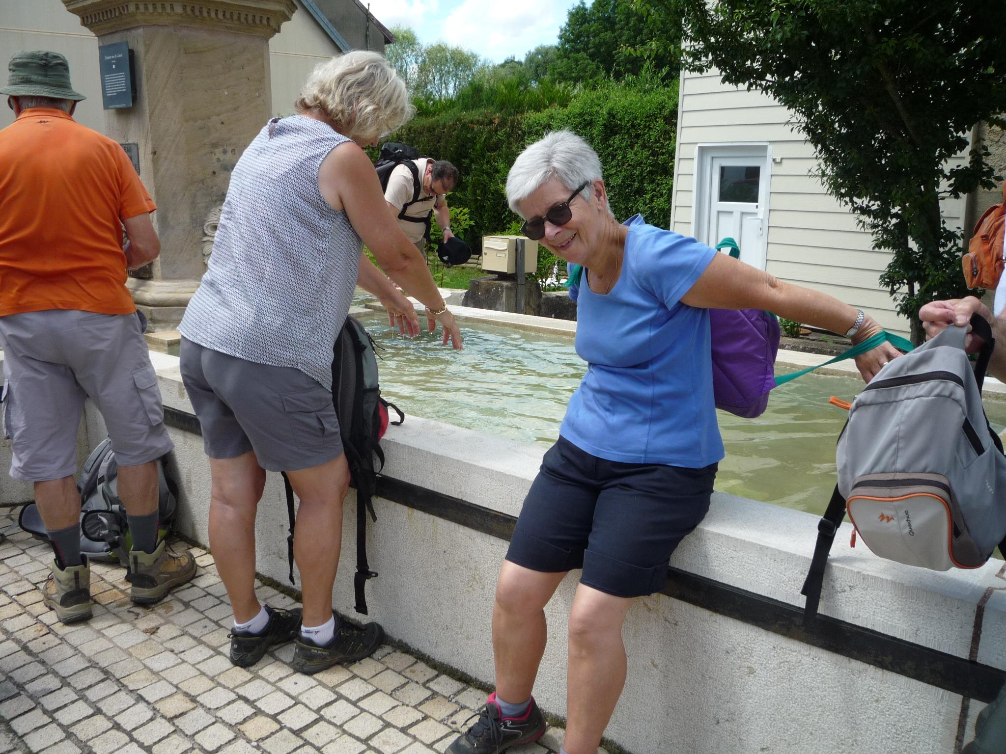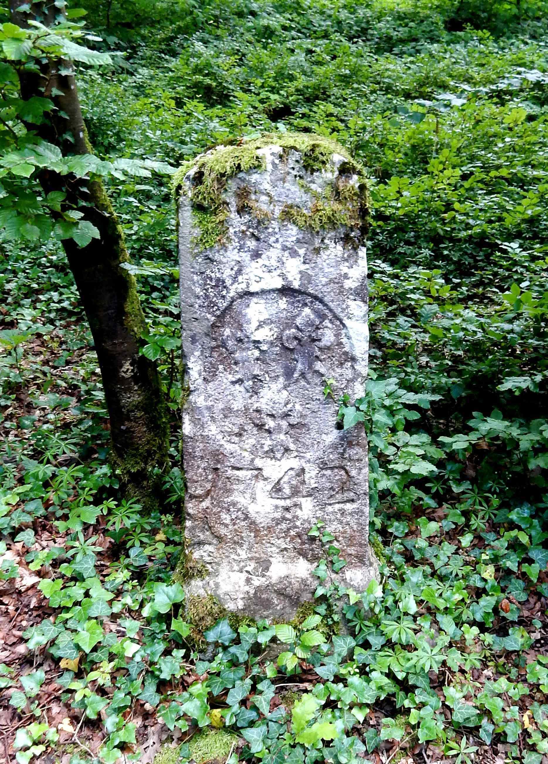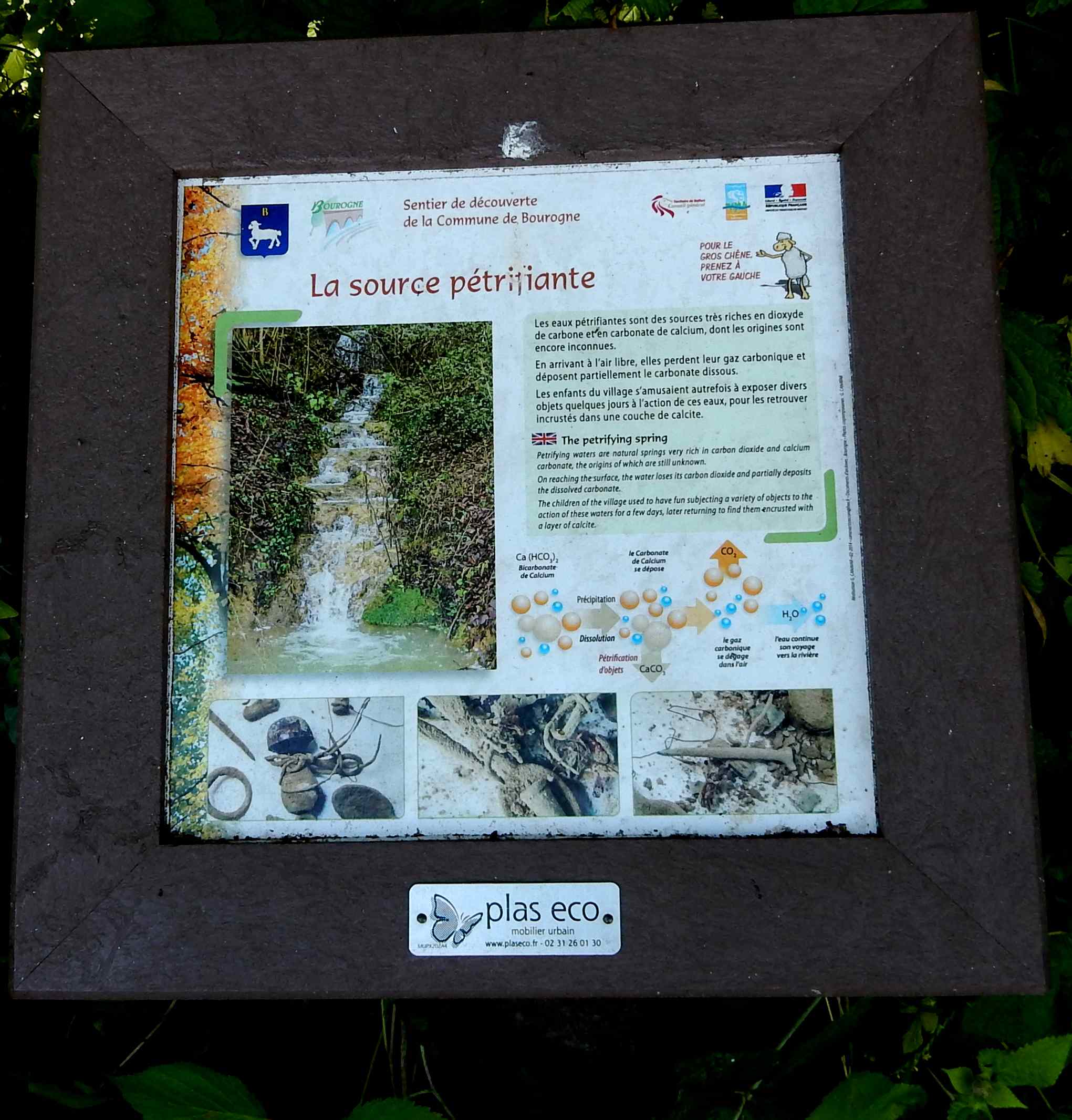 Le rythme est assez soutenu, un arrêt au pont situé au confluent de l’Allan, du canal et de la Bourbeuse avant Bourogne s’impose. Sur une suggestion de Claude C., nous faisons un détour jusqu’à la source pétrifiante, histoire d’ajouter quelques mètres aux podomètres. Nous n’aurons pas le temps de vérifier les effets de cette eau. Nous nous contenterons des explications. Après les canaux, on attaque le chemin des bornes, une série de côtes en forêt avec quelques belles bornes du XVIIIème siècle qui marquaient, avant 1793, la frontière entre la Principauté de Montbéliard et le Royaume de France.