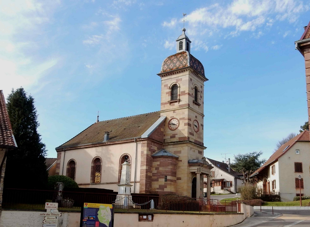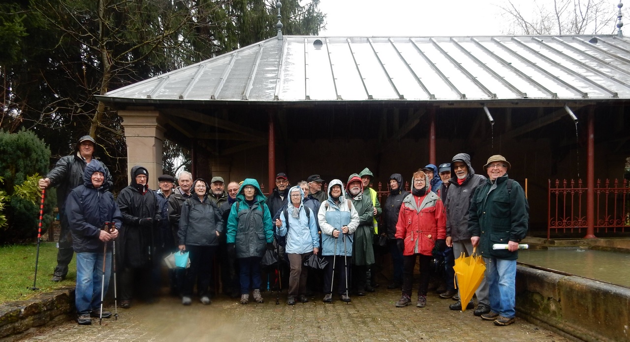 Pour commencer, direction le village de Tavey, la ligne TGV sur un passage pour gibiers, puis Laire et son motard. La suite à travers bois sur des chemins détrempés et défoncés par le bûcheronnage nous a conduits à Vyans le Val. Photos souvenir devant la fontaine-lavoir superbement restaurée, très jolie, puis Vyans le val et son clocher du temple en grès rose de 2 couleurs.