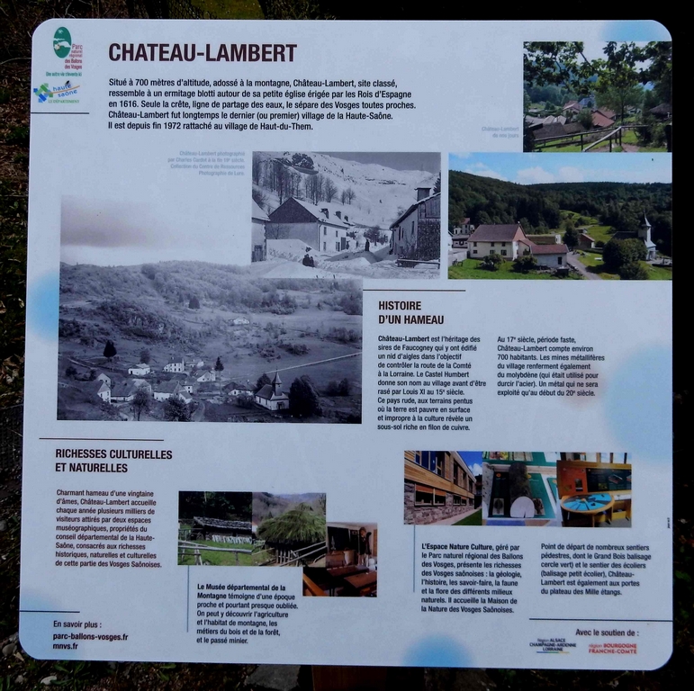 De là, nous dominons le village puis accédons au charmant hameau de Château Lambert. Ce petit village comtois du haut accueille depuis l’été 2009 la Maison de la Nature des Vosges Saônoises et son espace culturel.