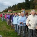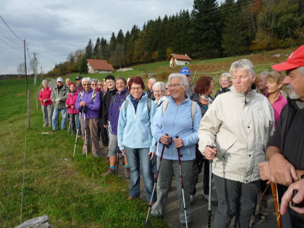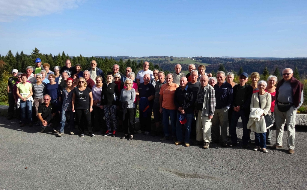 Nous montons au « Peu », « sommet » du plateau avec ses 1 046 m, en passant devant la ferme de Grueresse. Au sommet, on découvre d’un côté la Suisse des Franches Montagnes jusqu’au Chasseral et, côté France, la vue embrasse le plateau de Maîche.