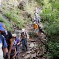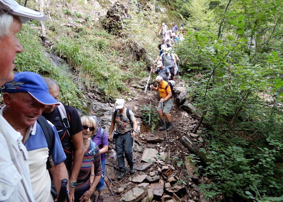 A partir de cette position, nous attaquons le plat de résistance : un sentier réputé difficile, agrémenté de superbes points de vue sur la vallée de la Moselle. Ce sentier, sur la face nord du Ballon, nous a demandé une heure pour faire 1 km. Pour certains passages, l’entraide entre tous à été bénéfique, mais nous avons terminé ce « parcours du combattant » sans perte !