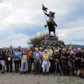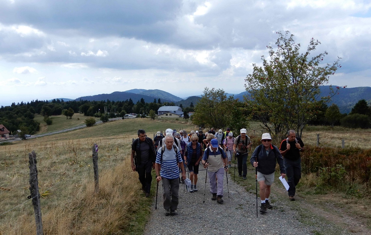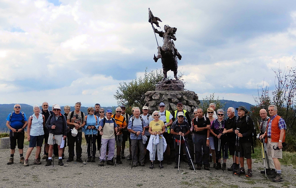 Départ du parking des Démineurs, au sommet du Ballon d’Alsace, pour monter jusqu’au monument de Jeanne d’Arc (photos de groupe en souvenir). De là, descente à la Jumenterie, accompagnés de vaches et de chevaux.