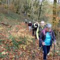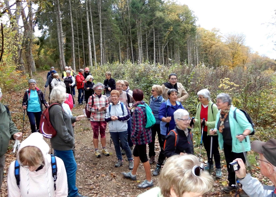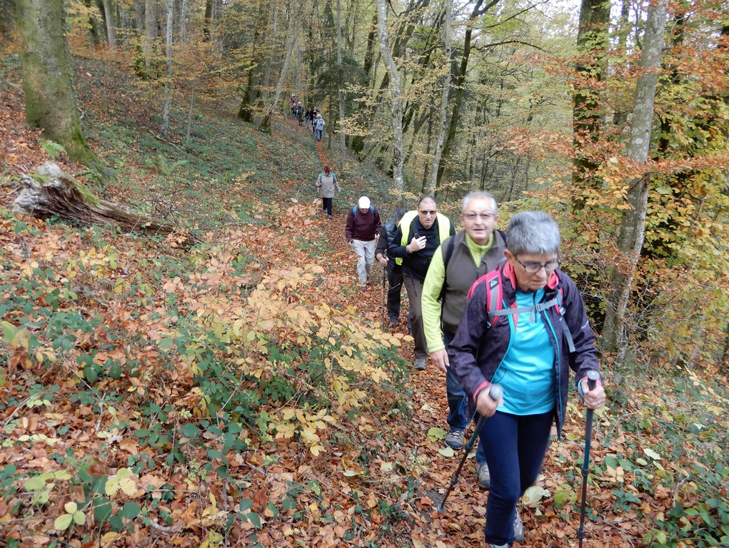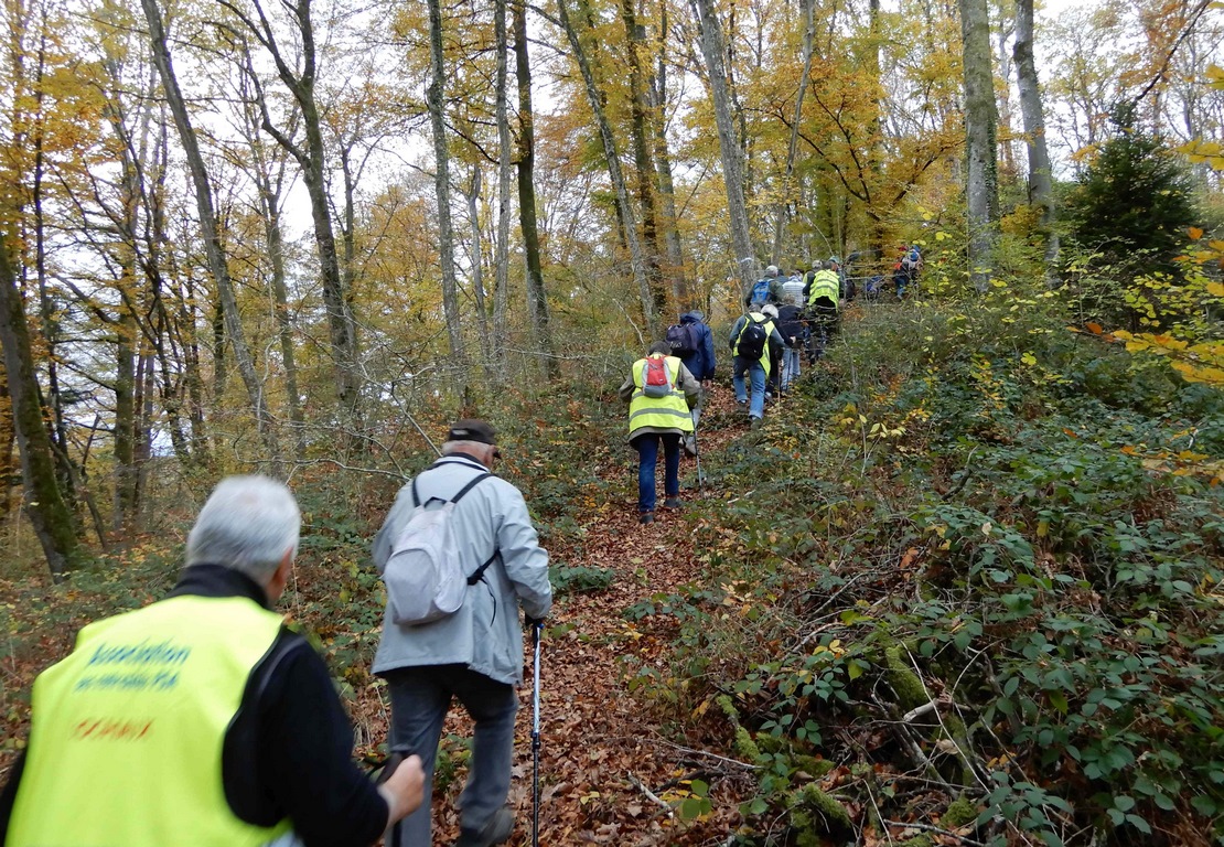 Après le rappel des consignes de sécurité, nous quittons ce site et le village par un chemin empierré pour nous diriger vers une belle forêt automnale. Par un agréable sentier agrémenté de quelques embûches, nous arrivons sur la départementale qui relie Saint-Maurice-Colombier à Villars-sous-Ecot, à proximité de l’autoroute et de son péage.