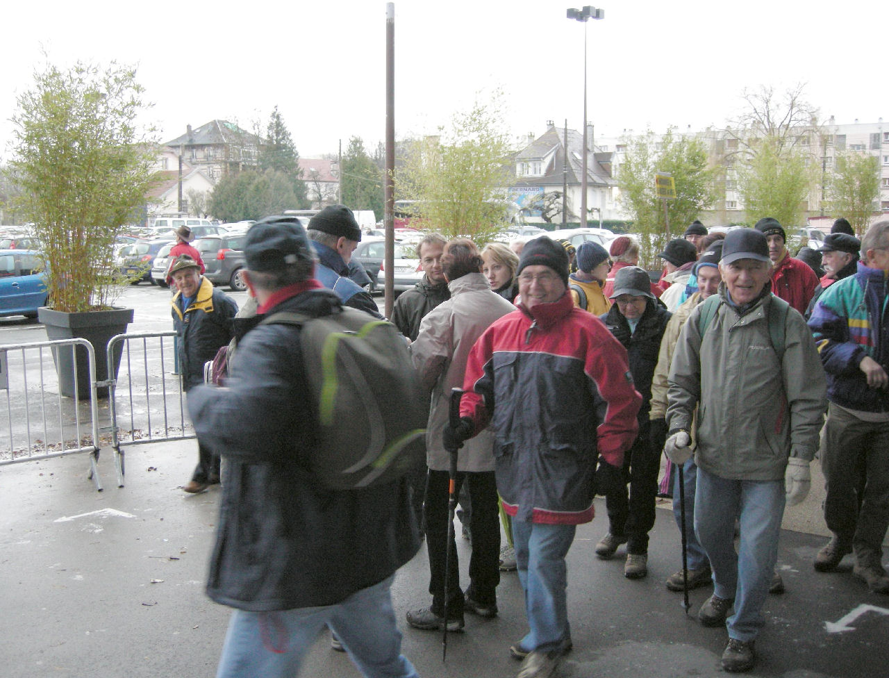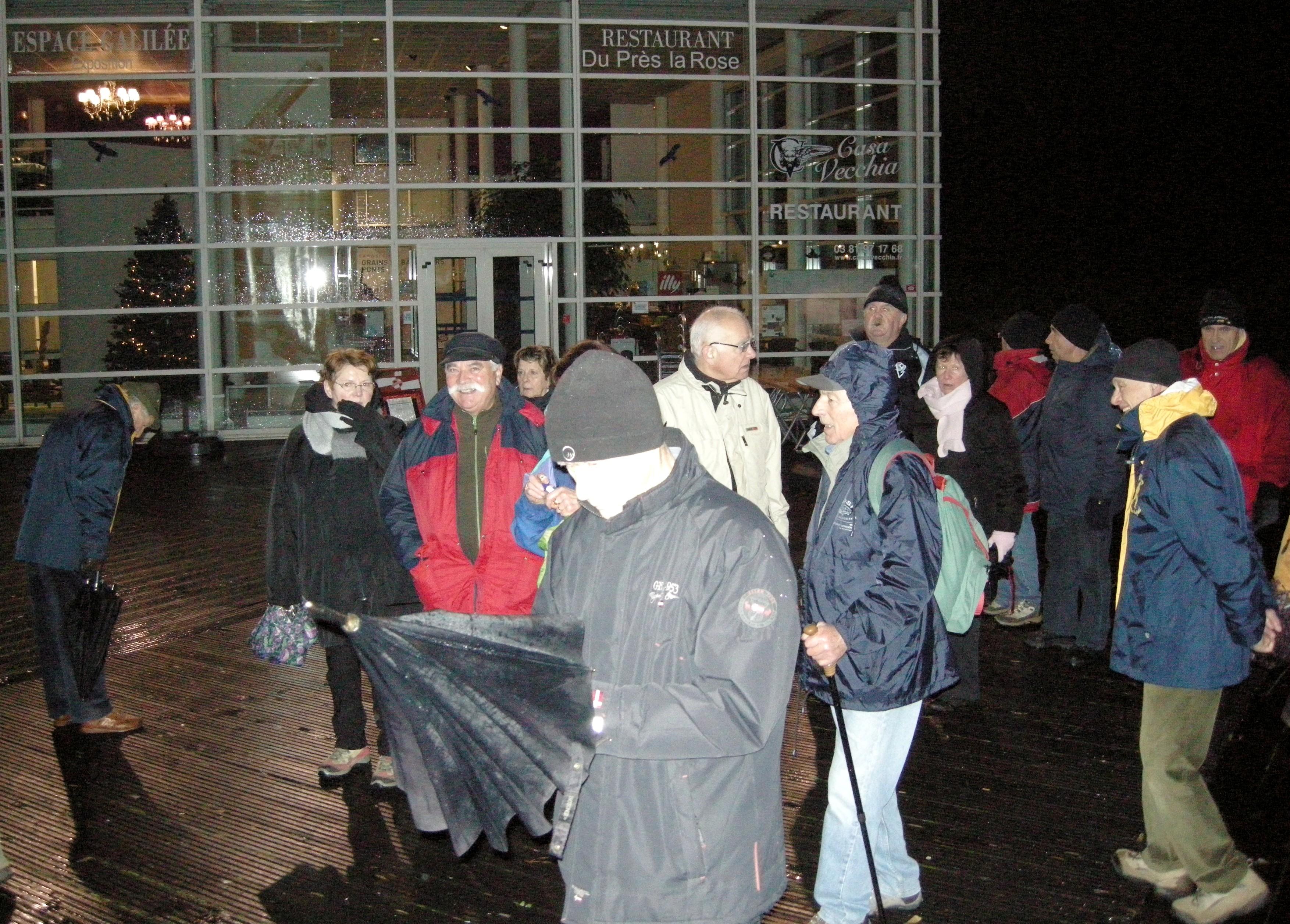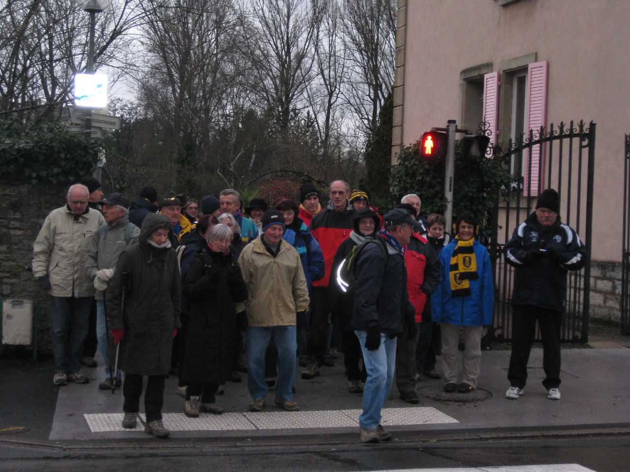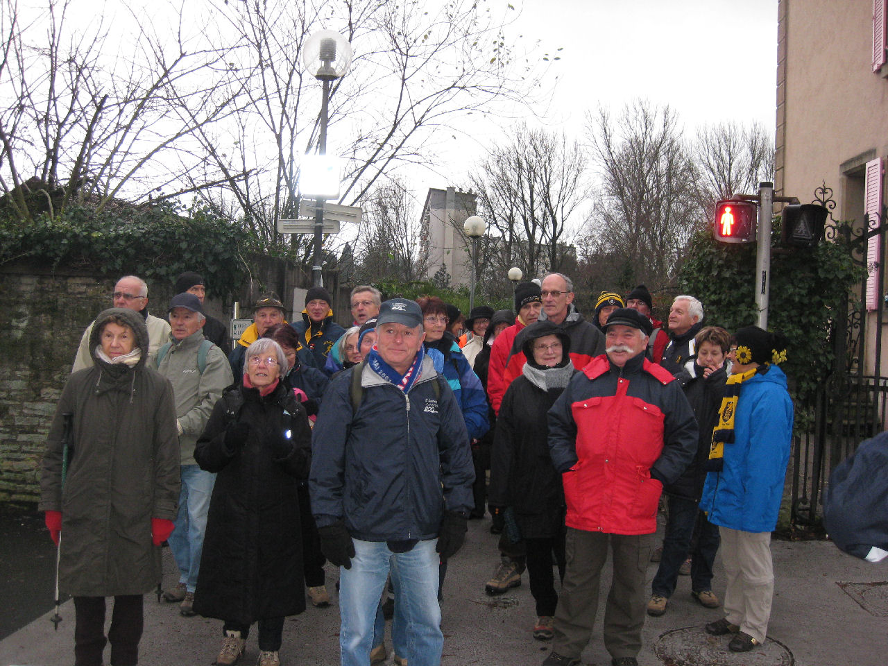 Nous longeons l’Allan que nous traversons par la passerelle en direction du Parc des Miches. Au Temple Saint-Georges, le premier contrôle nous permet de déguster les douceurs offertes par les organisateurs : pâtisseries de la maison Billiotte, chocolat, boissons chaudes… Nos pas nous mènent à présent au travers du Marché de Noël, très animé, pour rejoindre les abords du lycée Cuvier via la Médiathèque et le passage qui enjambe la voie ferrée. Nous accédons ensuite au Parc du Près-la-Rose par le Pavillon des Sciences pour nous diriger vers le château. Petite halte à l’intérieur de l’édifice où nous attend le second contrôle, agrémenté d’un pot d’accueil. Place St Martin, retour au Marché de Noël sur le Stand du Comité des Fêtes de la ville où l’Amicale des Retraités de Peugeot Sochaux nous offre un petit vin chaud très apprécié.