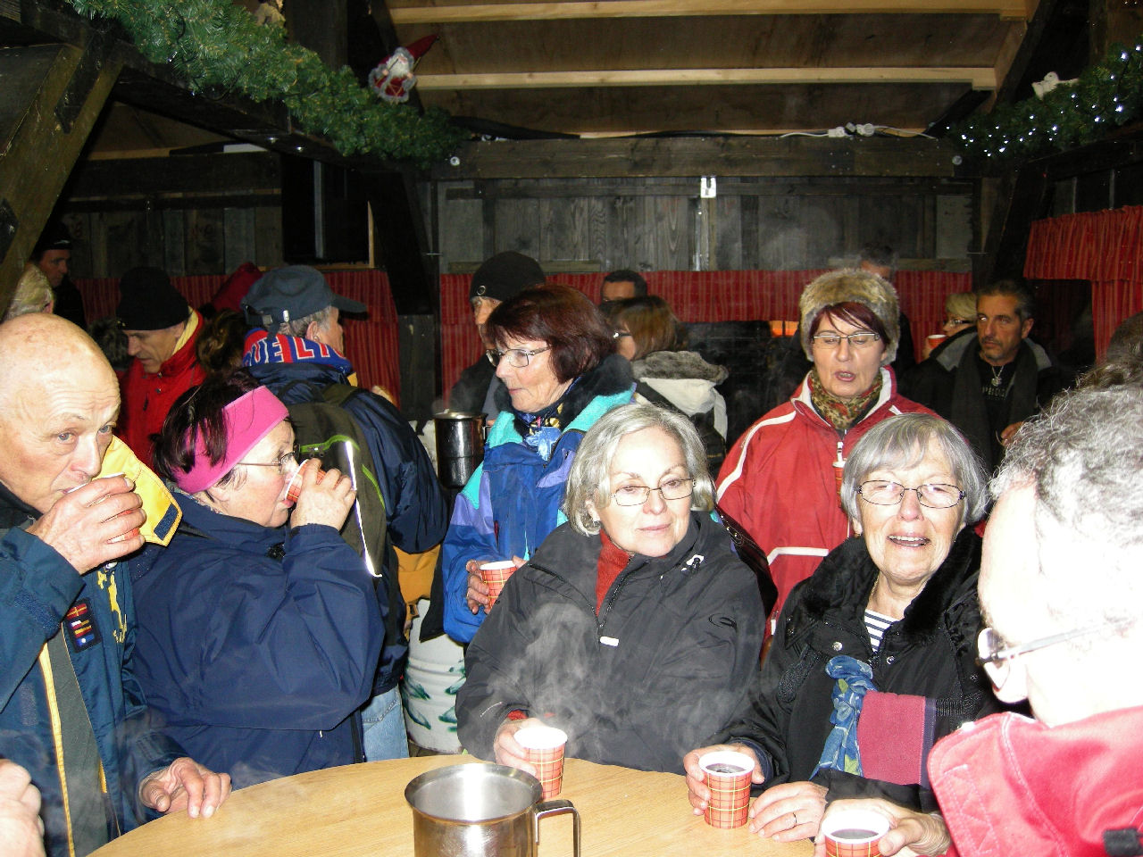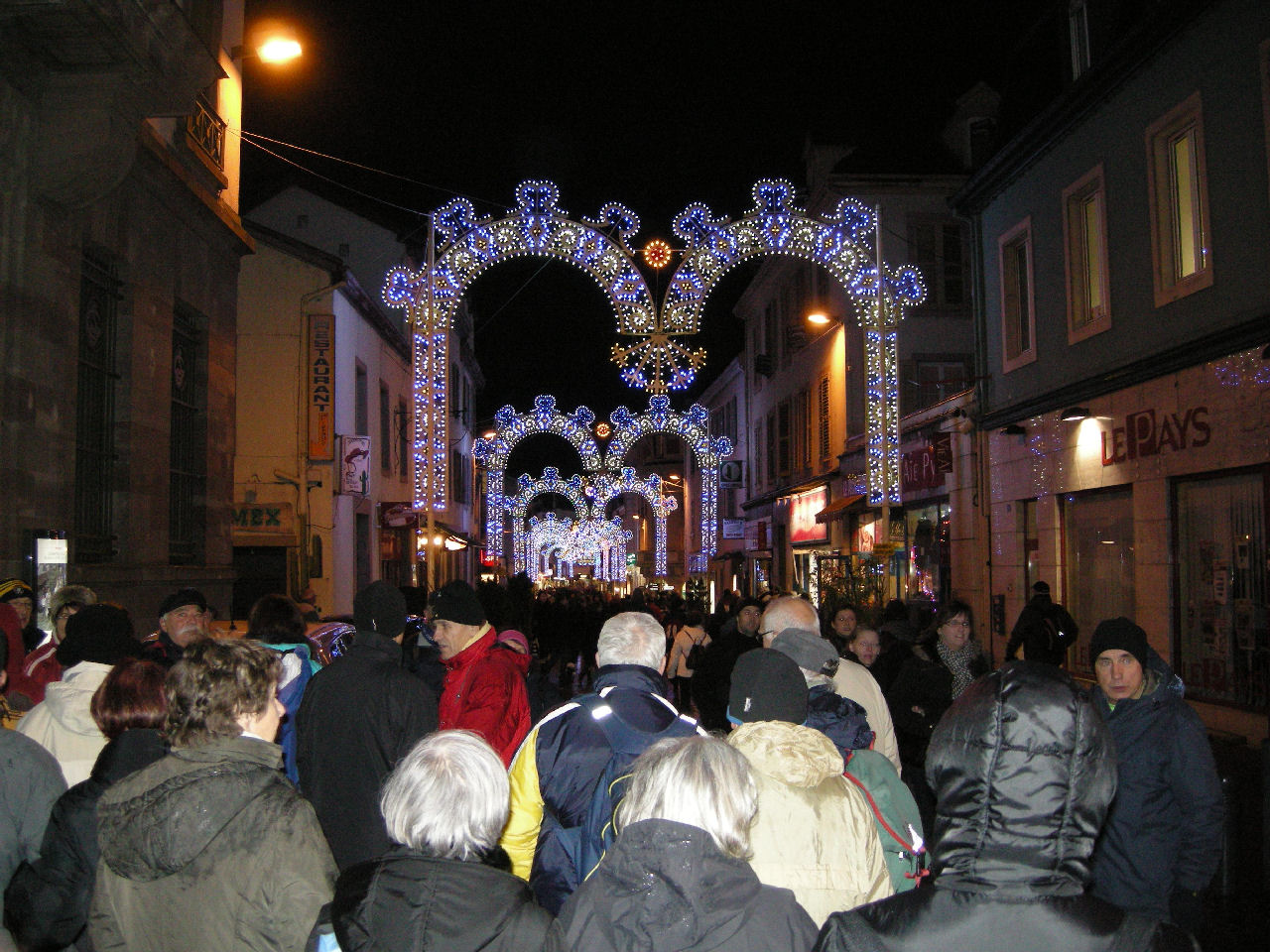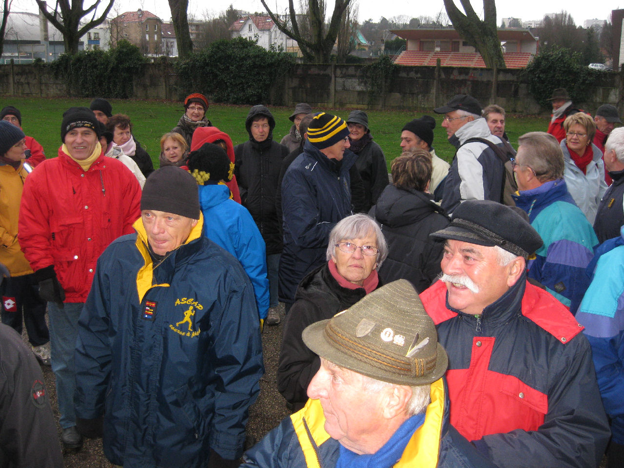 Nous longeons l’Allan que nous traversons par la passerelle en direction du Parc des Miches. Au Temple Saint-Georges, le premier contrôle nous permet de déguster les douceurs offertes par les organisateurs : pâtisseries de la maison Billiotte, chocolat, boissons chaudes… Nos pas nous mènent à présent au travers du Marché de Noël, très animé, pour rejoindre les abords du lycée Cuvier via la Médiathèque et le passage qui enjambe la voie ferrée. Nous accédons ensuite au Parc du Près-la-Rose par le Pavillon des Sciences pour nous diriger vers le château. Petite halte à l’intérieur de l’édifice où nous attend le second contrôle, agrémenté d’un pot d’accueil. Place St Martin, retour au Marché de Noël sur le Stand du Comité des Fêtes de la ville où l’Amicale des Retraités de Peugeot Sochaux nous offre un petit vin chaud très apprécié.
