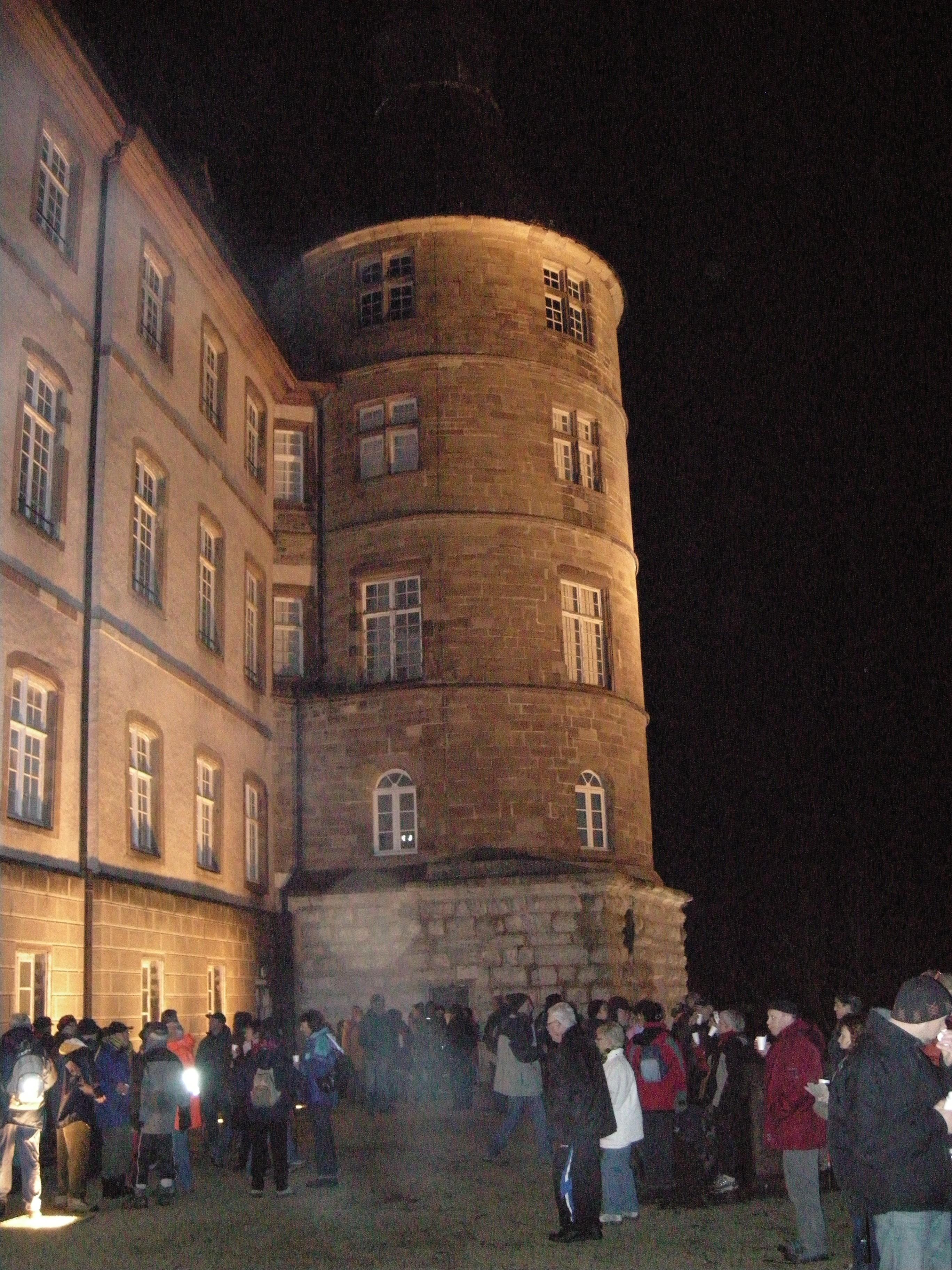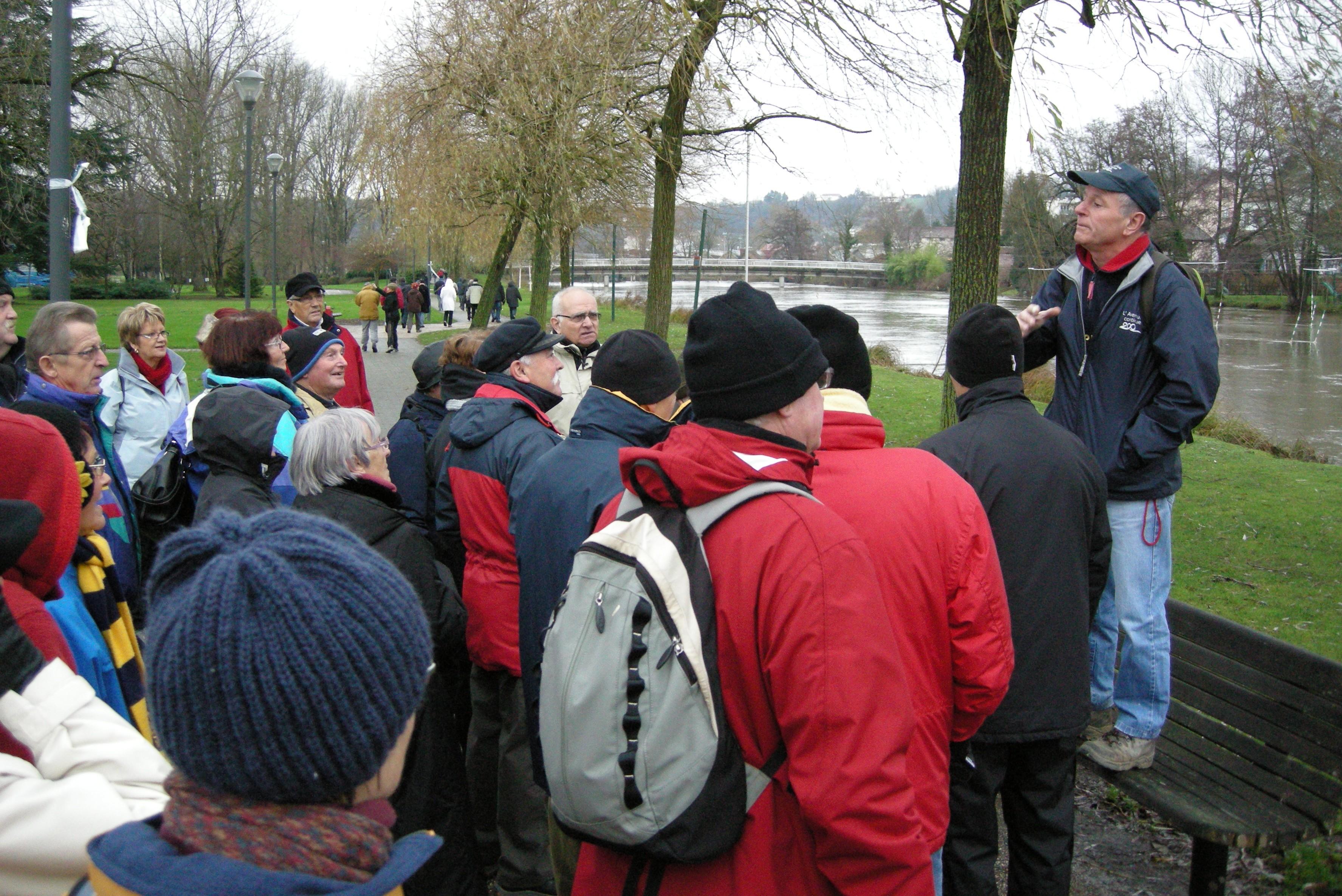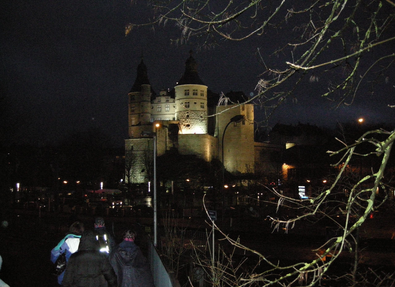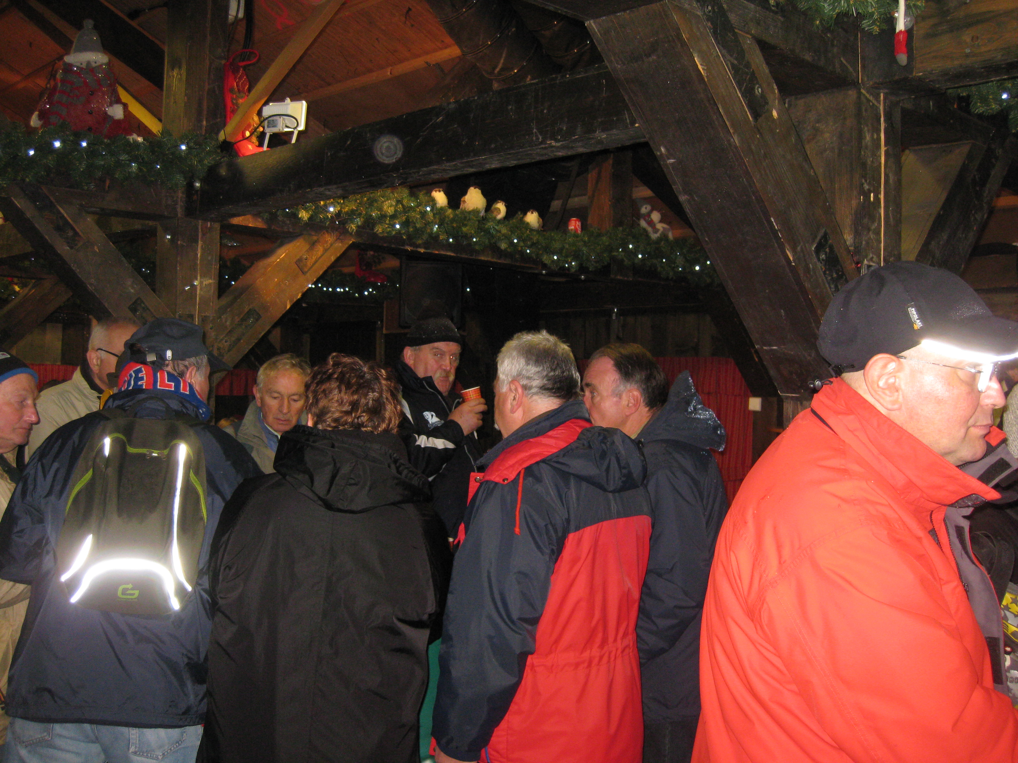 Nous longeons l’Allan que nous traversons par la passerelle en direction du Parc des Miches. Au Temple Saint-Georges, le premier contrôle nous permet de déguster les douceurs offertes par les organisateurs : pâtisseries de la maison Billiotte, chocolat, boissons chaudes… Nos pas nous mènent à présent au travers du Marché de Noël, très animé, pour rejoindre les abords du lycée Cuvier via la Médiathèque et le passage qui enjambe la voie ferrée. Nous accédons ensuite au Parc du Près-la-Rose par le Pavillon des Sciences pour nous diriger vers le château. Petite halte à l’intérieur de l’édifice où nous attend le second contrôle, agrémenté d’un pot d’accueil. Place St Martin, retour au Marché de Noël sur le Stand du Comité des Fêtes de la ville où l’Amicale des Retraités de Peugeot Sochaux nous offre un petit vin chaud très apprécié.